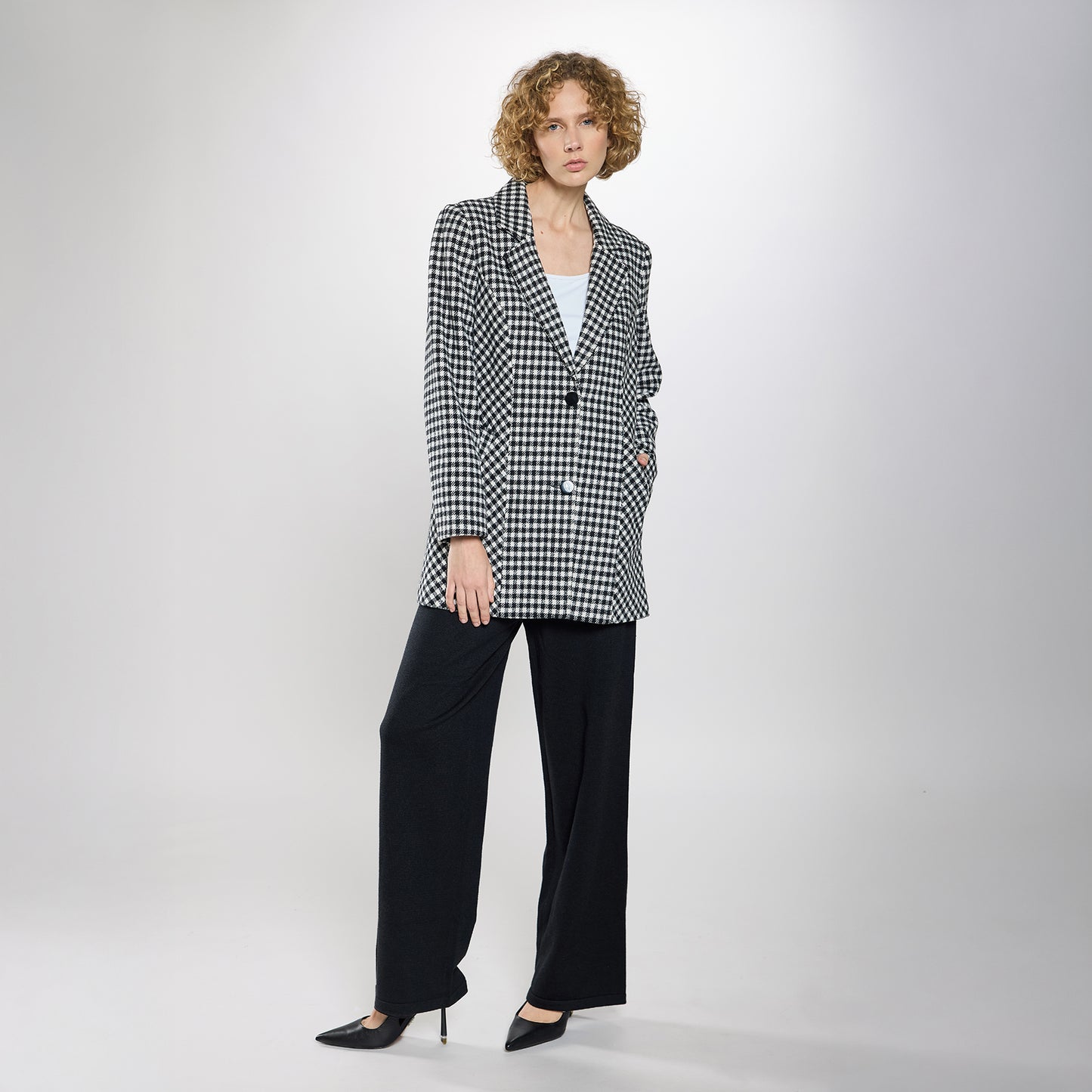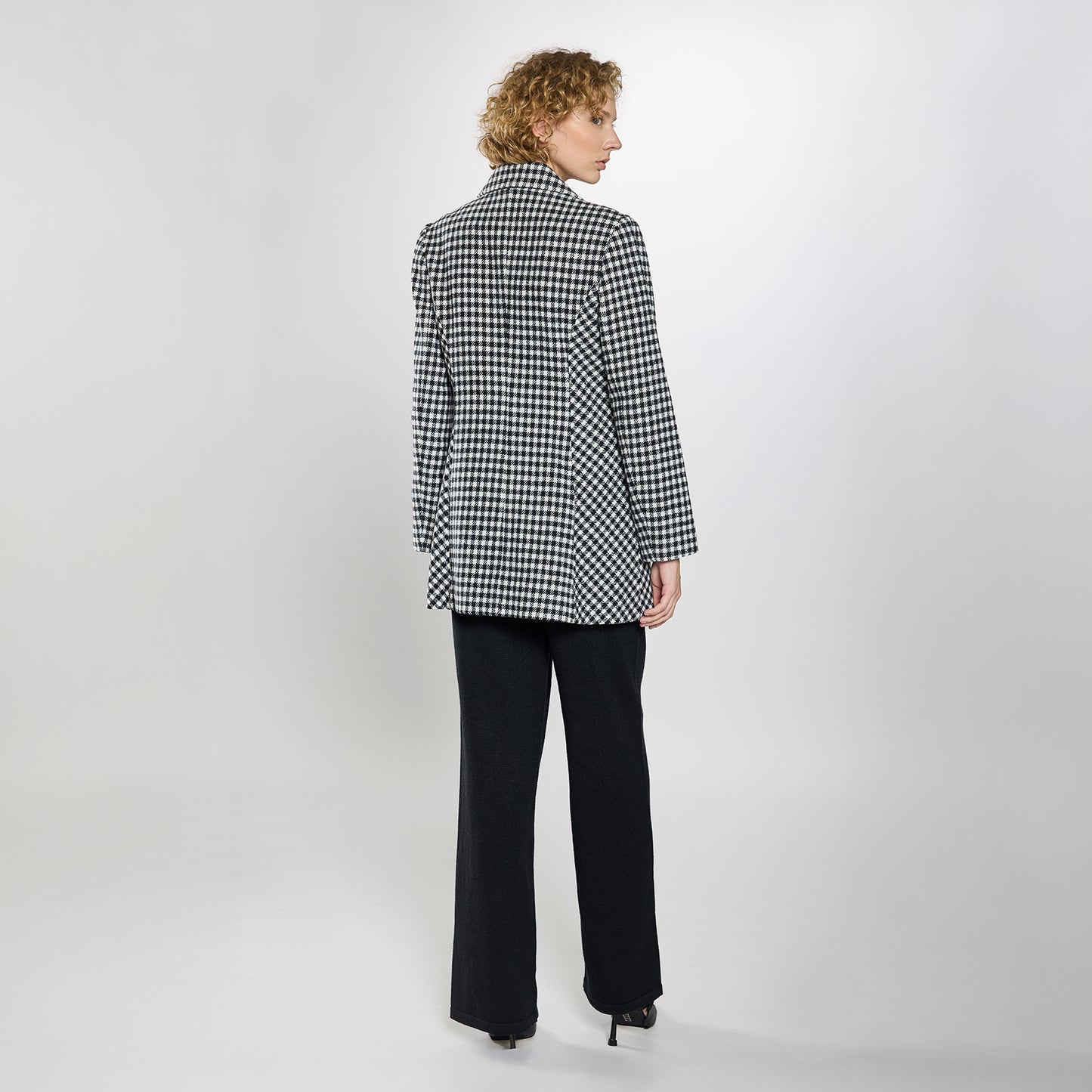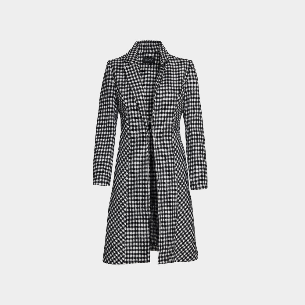 Abrigo recto en tejido tipo tweed con patrón houndstooth pequeño, estructurado con solapa, manga larga, dos bolsillos laterales y dos botones negros al frente.