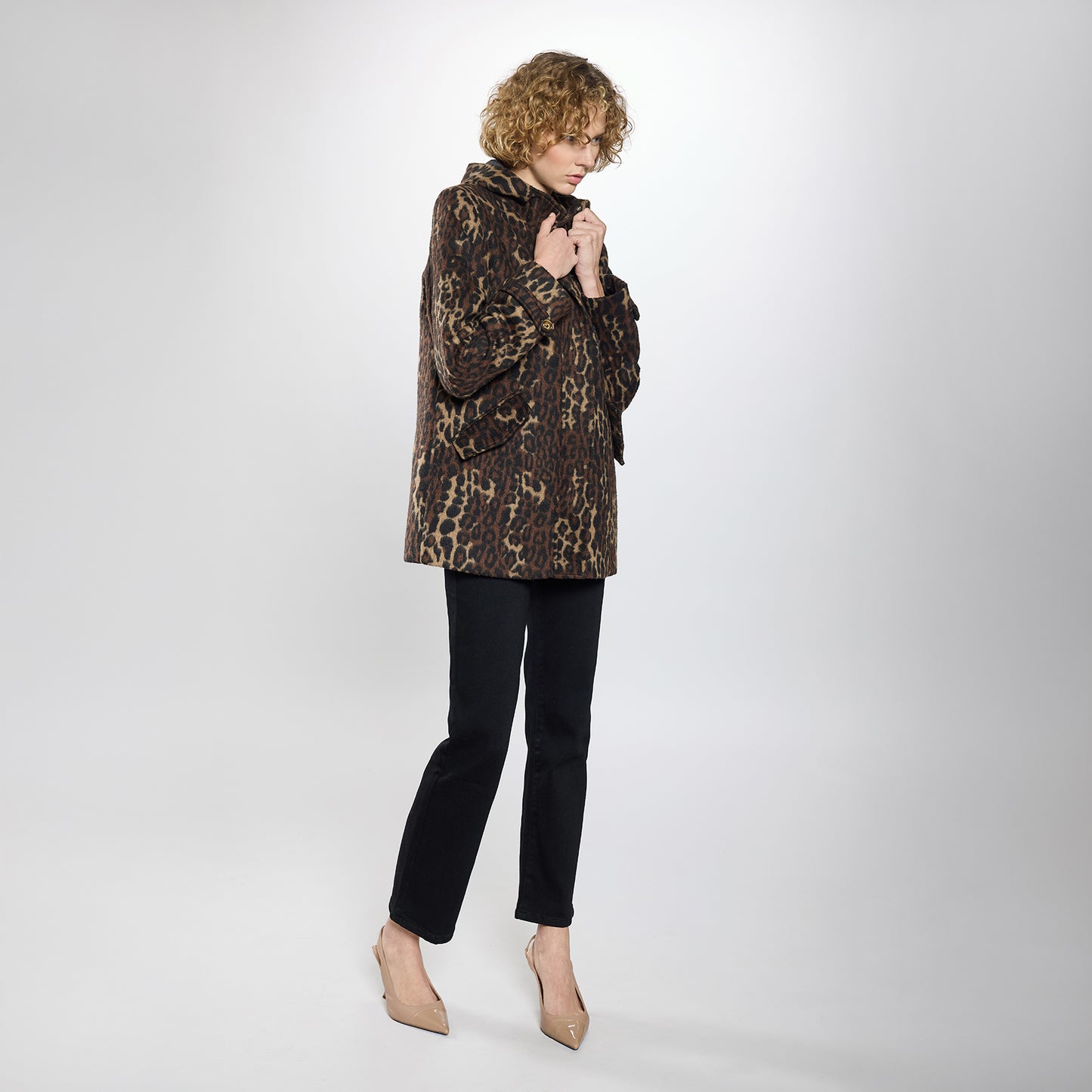 Abrigo corte recto en animal print, con cierre de zipper metálico y botones de presión. Cuello clásico con solapa y detalle de botón y cinta en manga.