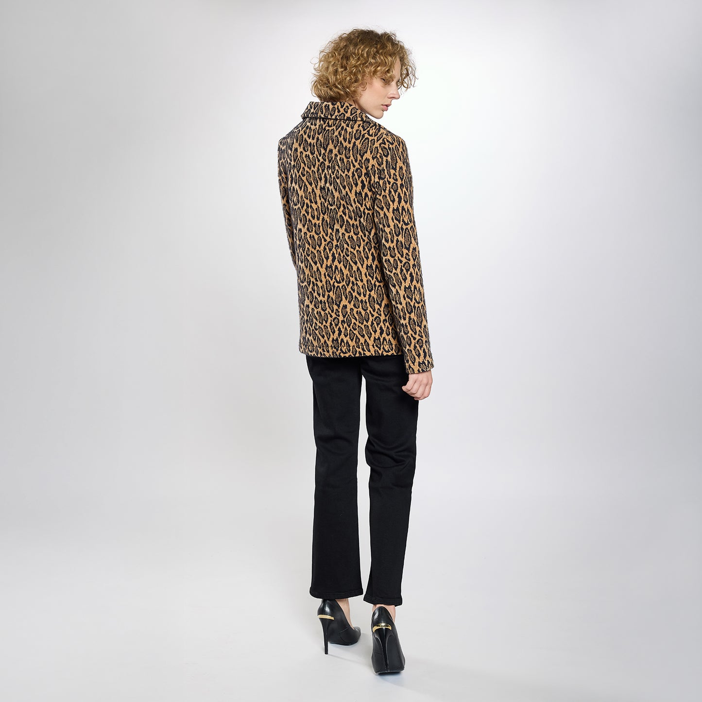 Blazer oversize en animal print, cuello clásico y manga larga. Cierre de cuatro botones al frente y bolsillos laterales.