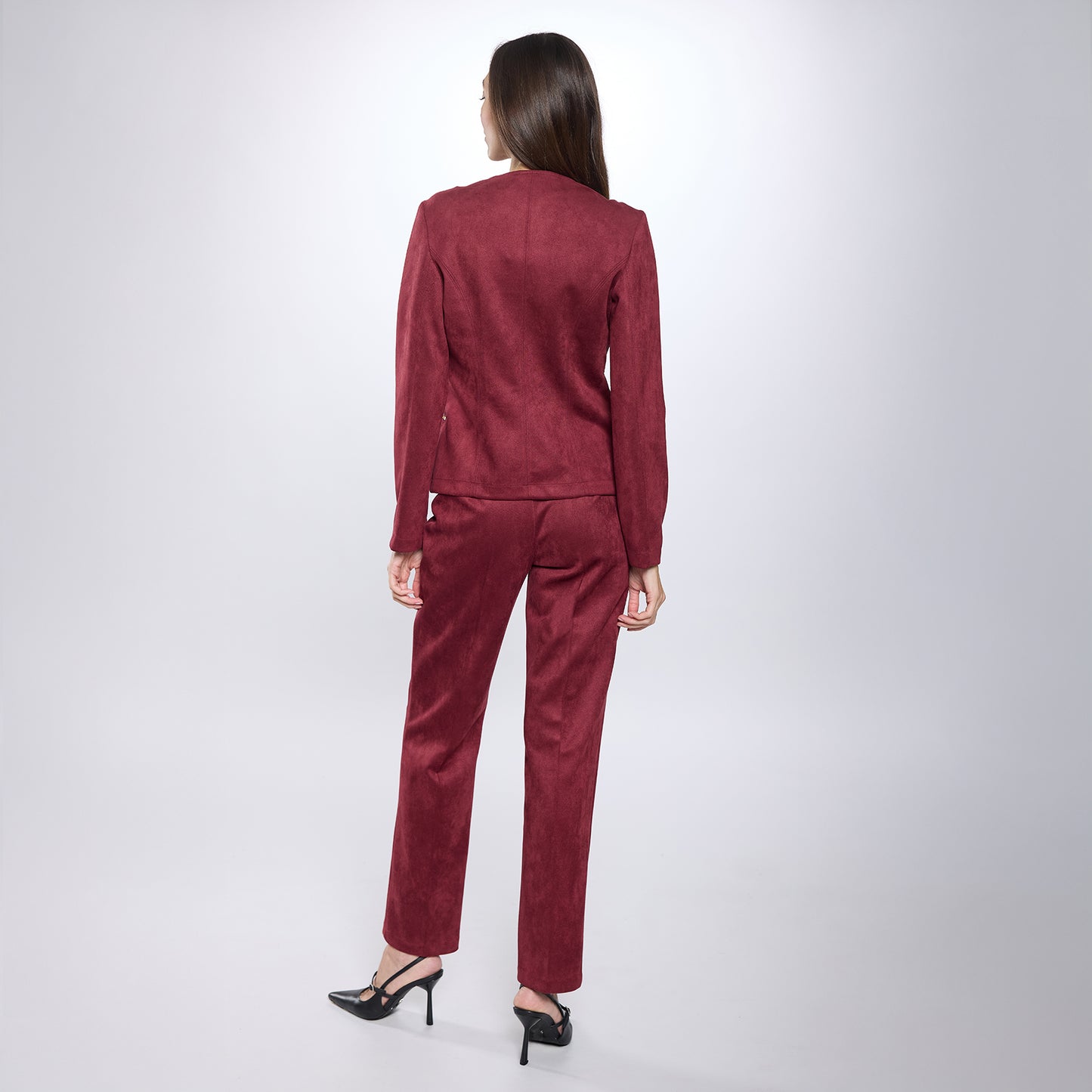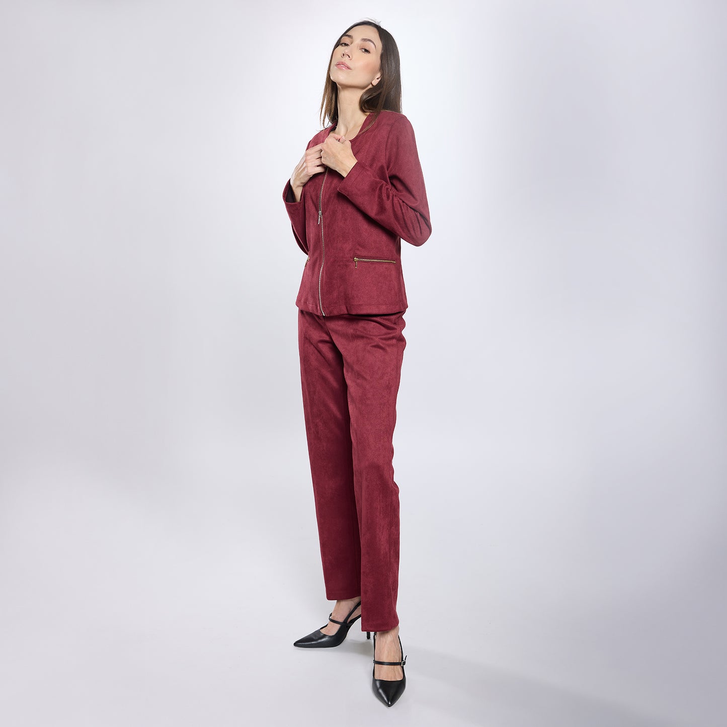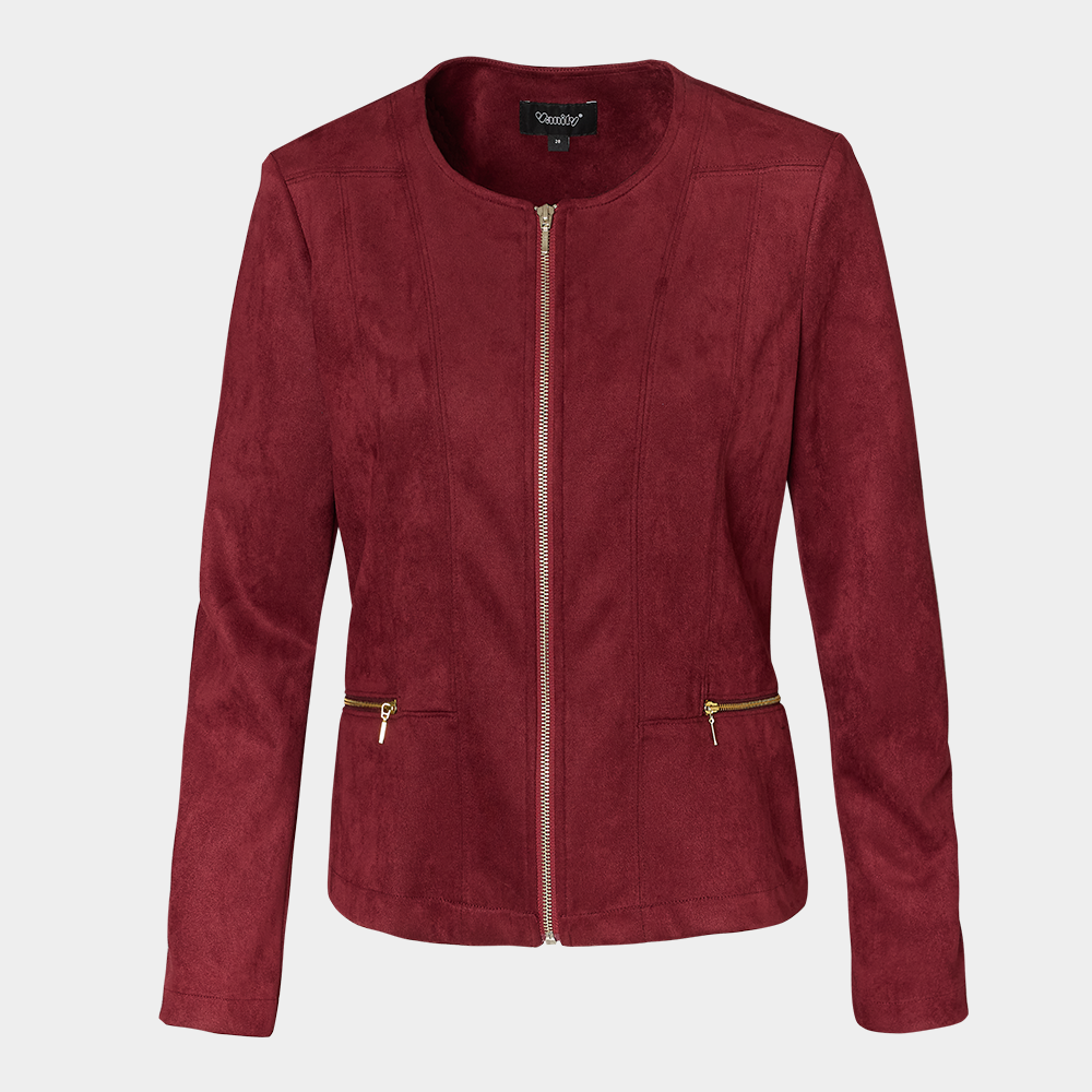 Blazer de cuello redondo sin solapa, en tela tipo gamuza, con cierre metálico al frente y dos bolsillos frontales con detalle de cierre del mismo estilo.