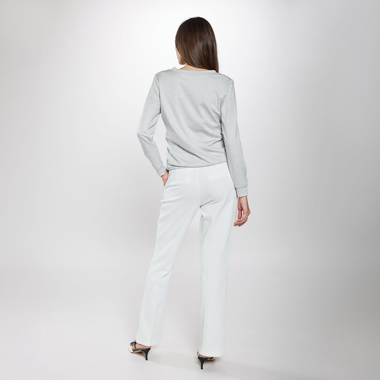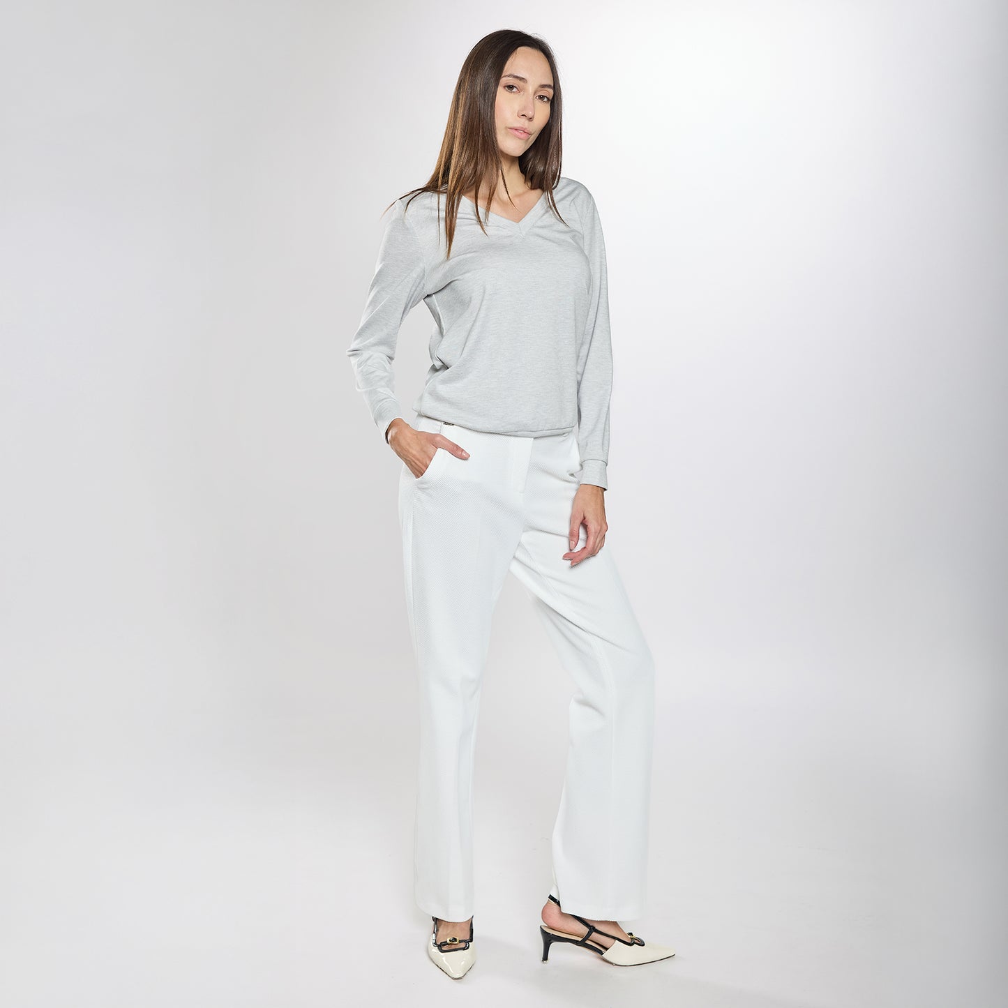 Blusa gris claro con escote en V, mangas largas con hombros caídos y bastilla redondeada en puños.