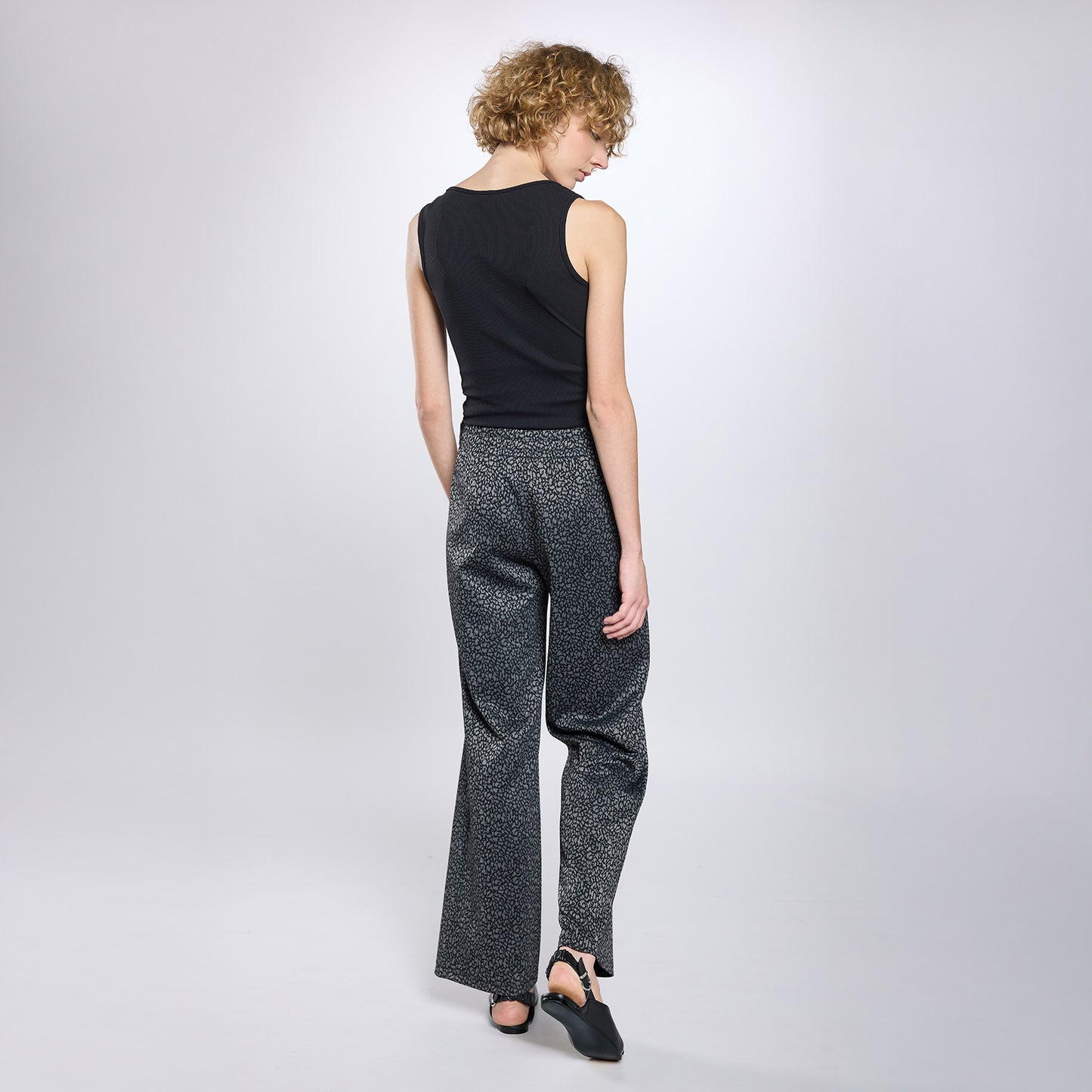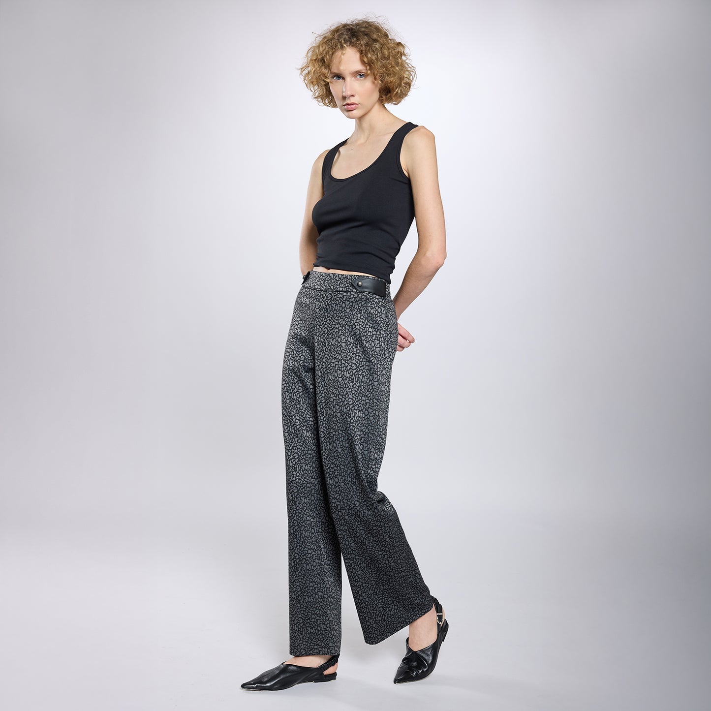 Pantalón recto de animal print en contraste con resorte en cintura y detalle tipo piel y botón plateado en cada extremo de la cintura.