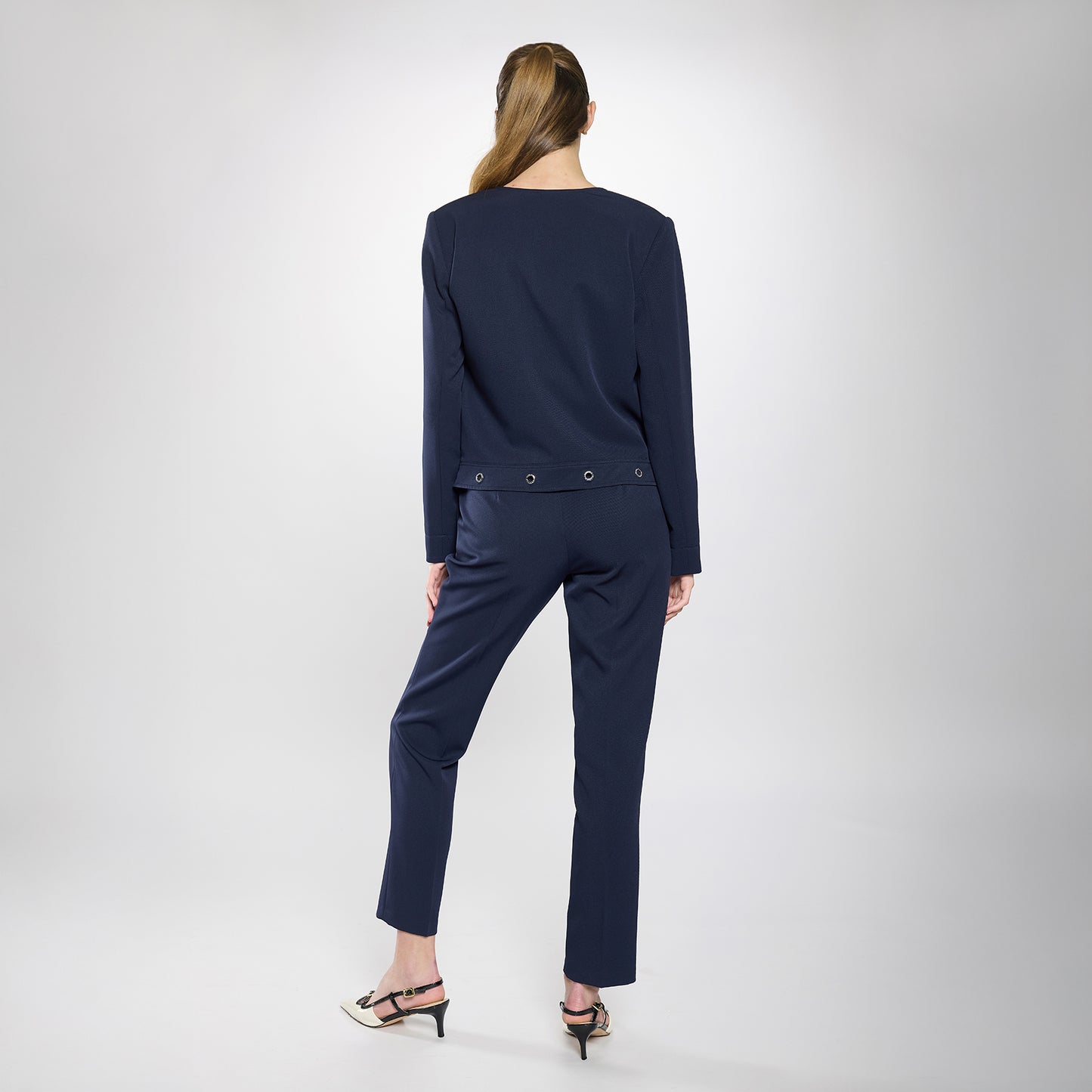 Saco abierto con tres broches metálicos internos, cuello tipo scoop sin solapa, manga larga con hombreras y diez ojales metálicos a lo largo del dobladillo.