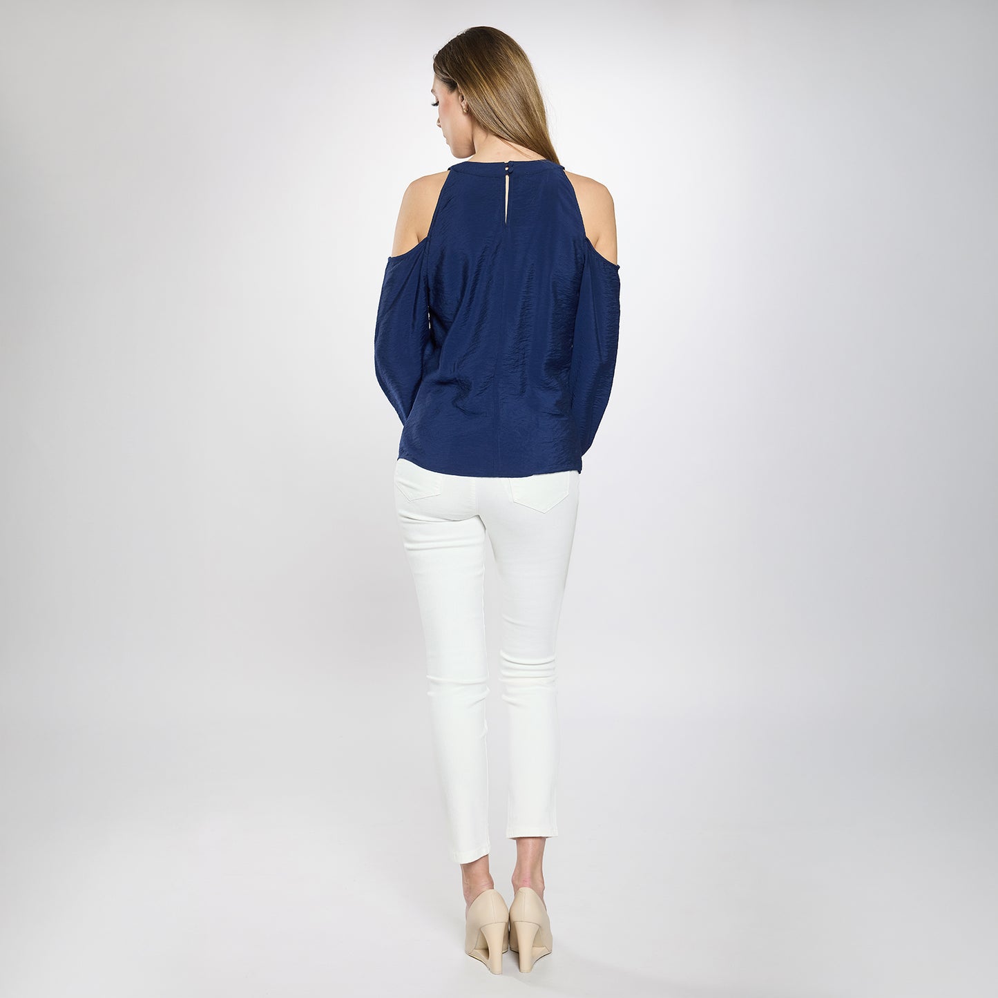 Blusa holgada con cuello tipo scoop, espalda semi abierta con dos botones, manga recta con abertura en el hombro estilo cold shoulder, confeccionada en una tela ligera y sedosa.