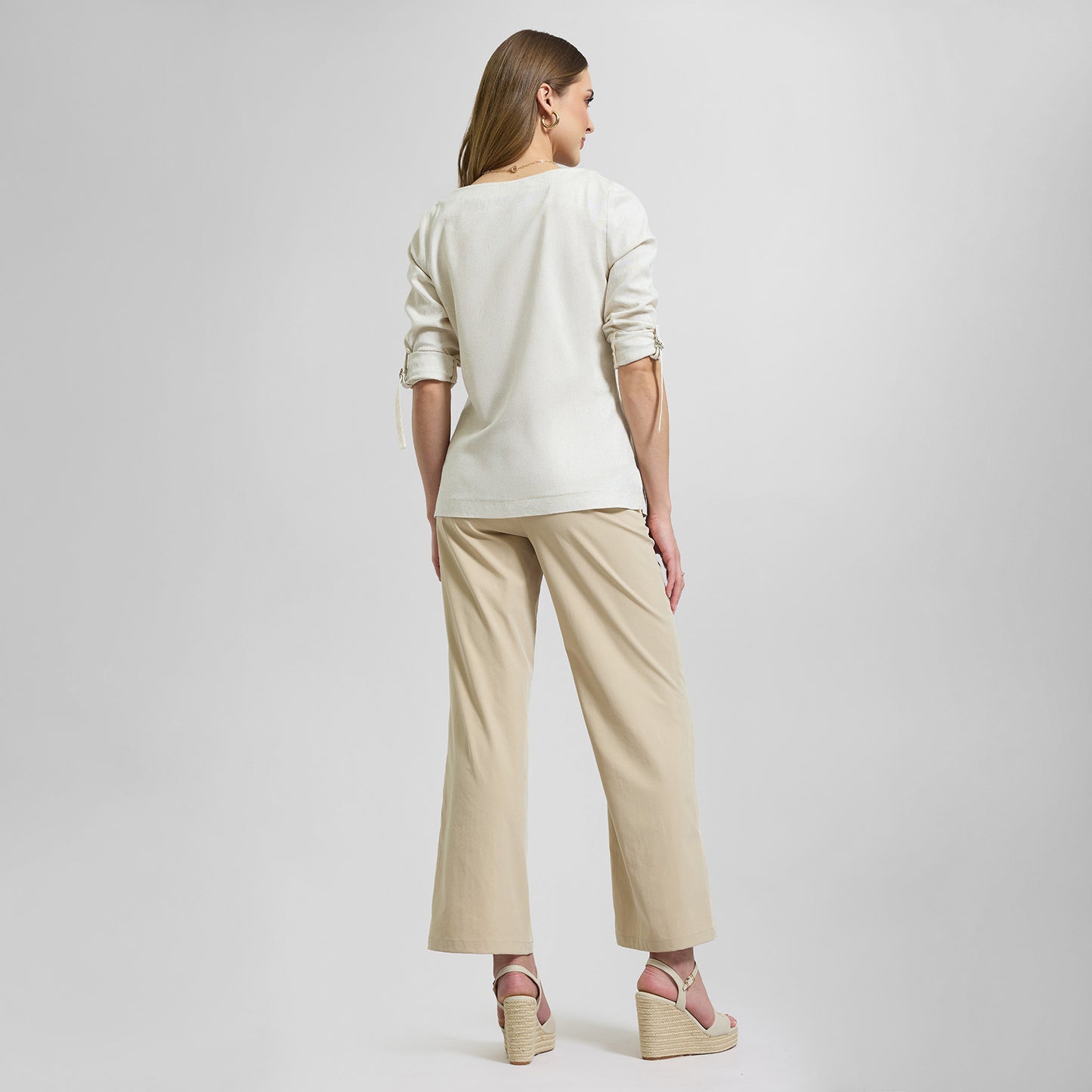 Blusa de lino de manga larga, con cuello tipo scoop y detalle de hebilla en tono plata para ajustar la manga.