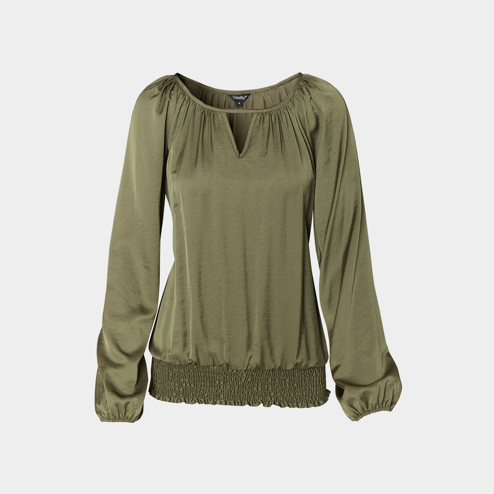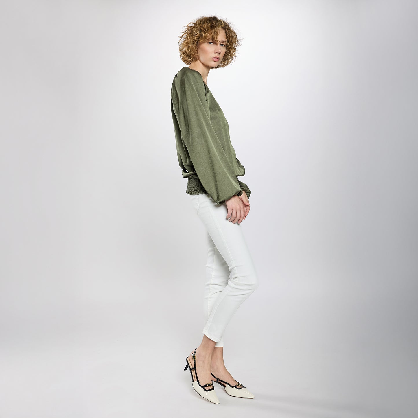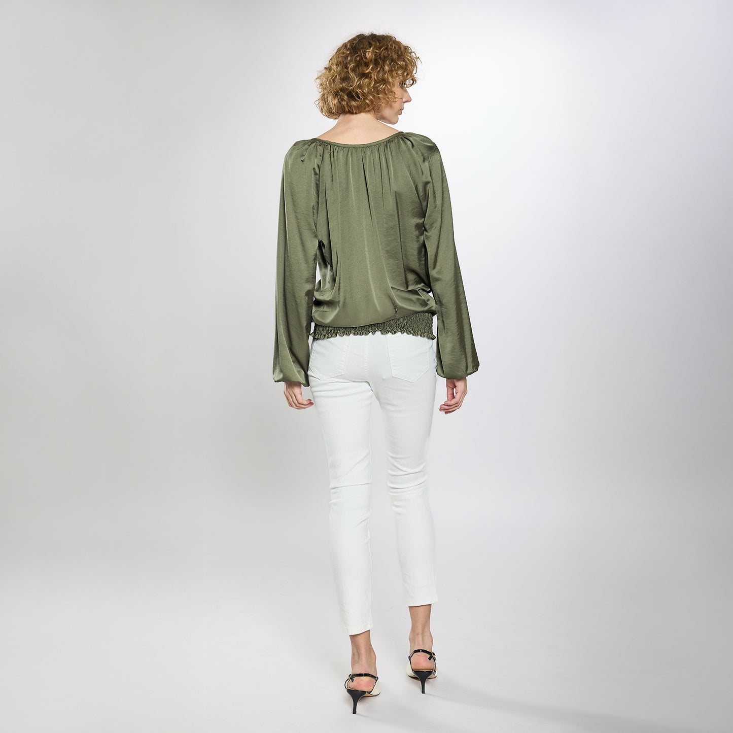 Blusa con cuello tipo scoop con un cut out en V, holgada y fruncido en la cintura, manga larga bishop con terminado en resorte, confeccionada en una tela satinada.