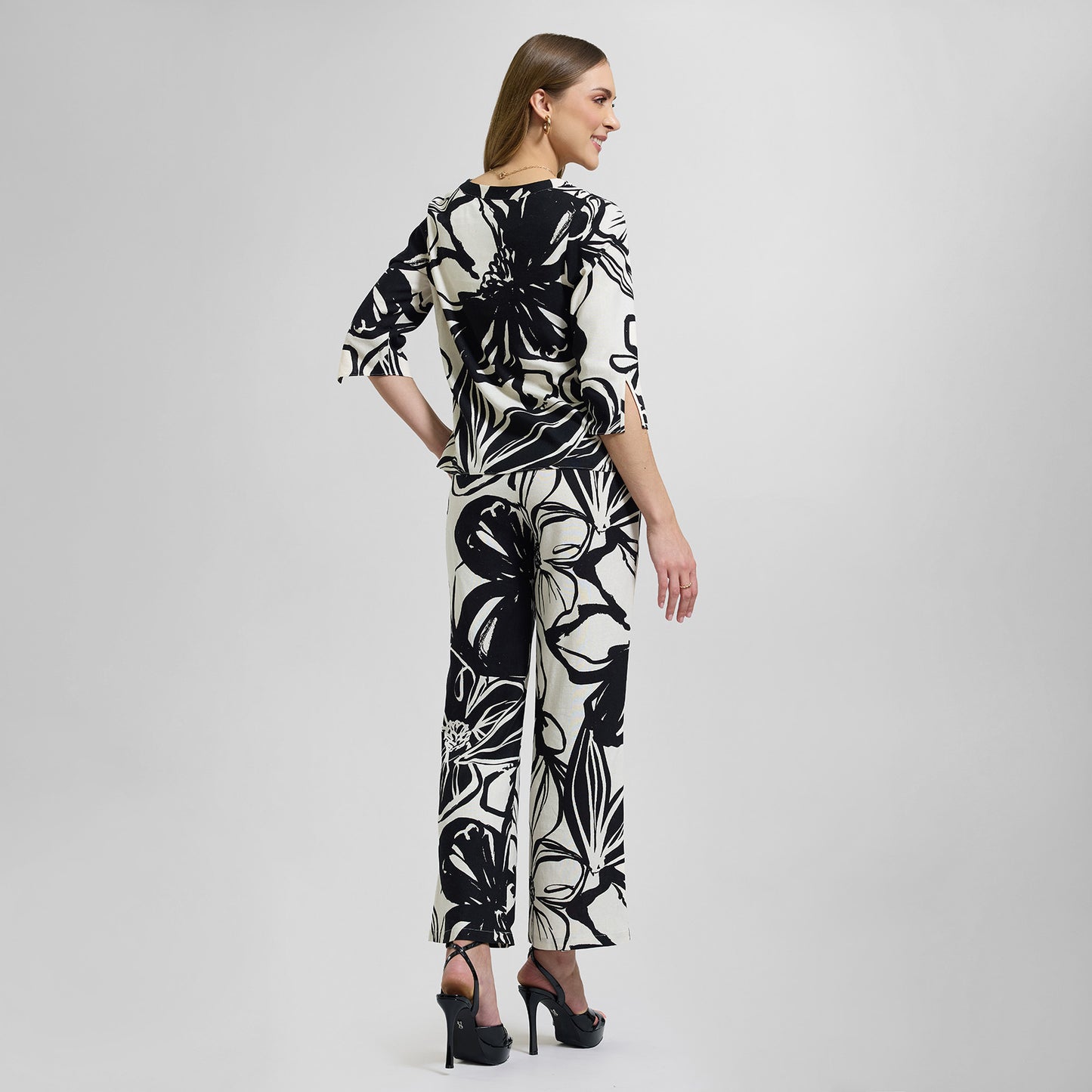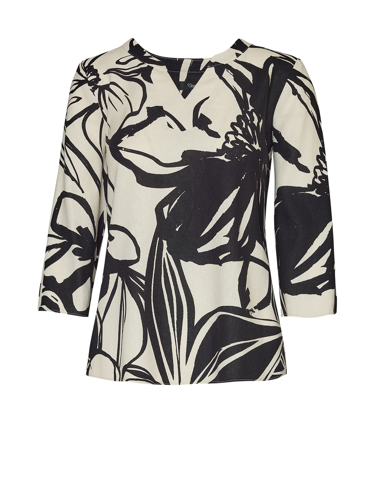 Blusa de lino con print natural, cuello redondo con abertura central y manga tres cuartos.