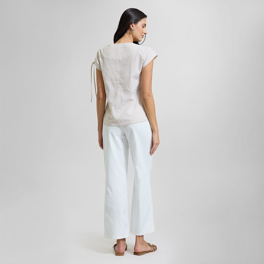 Blusa de lino amplia a rayas con manga corta, cuello tipo scoop, detalle de amarre con cintas y ojales en tono plata.