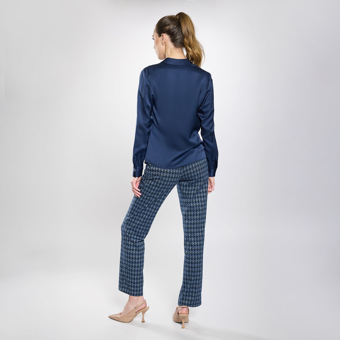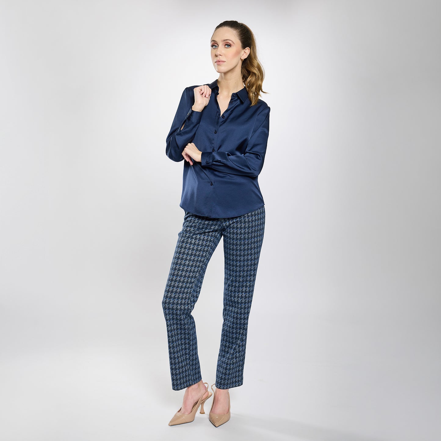 Blusa tipo camisa satinada, con cierre frontal de siete botones y manga larga terminada en puño con botón.