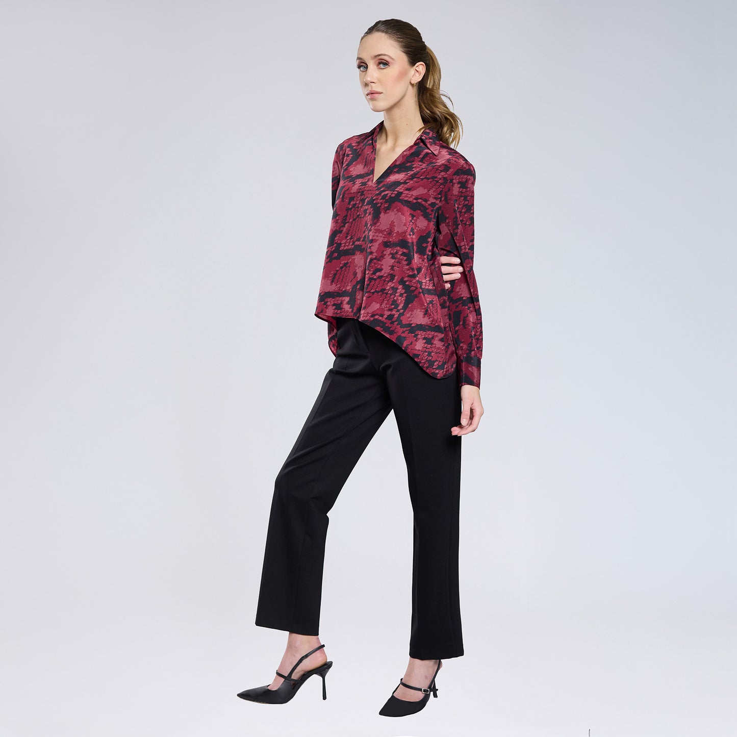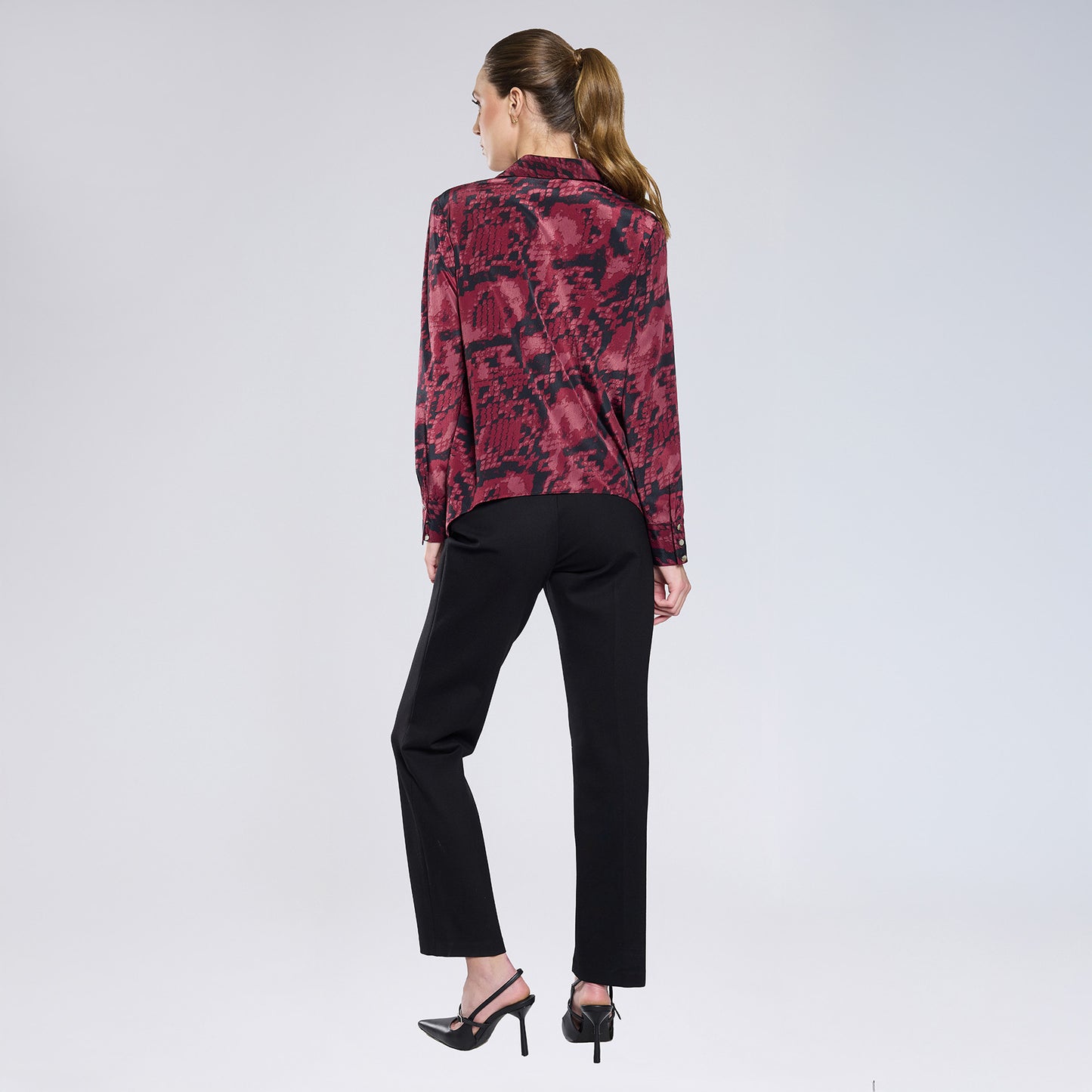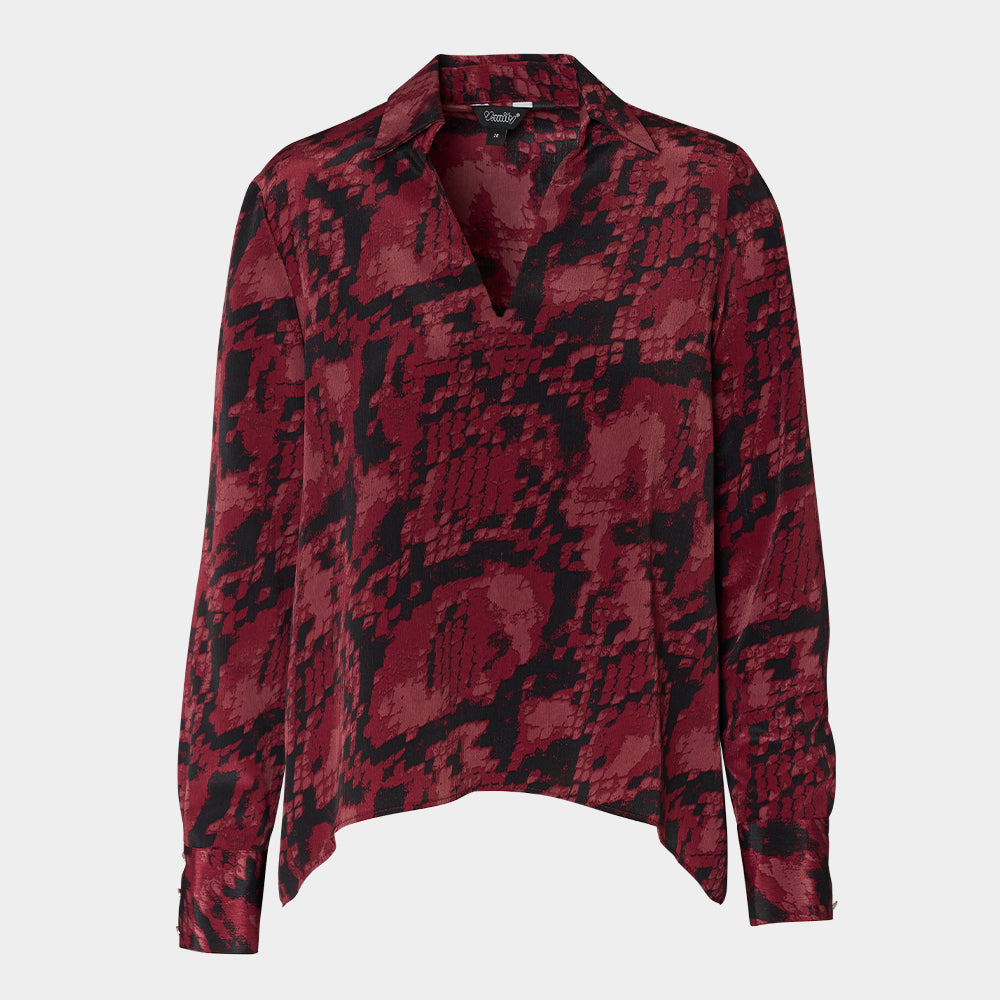 Maxi blusa de manga larga y cuello en V, con acabado en puño con tres botones dorados y print en rojo con negro..