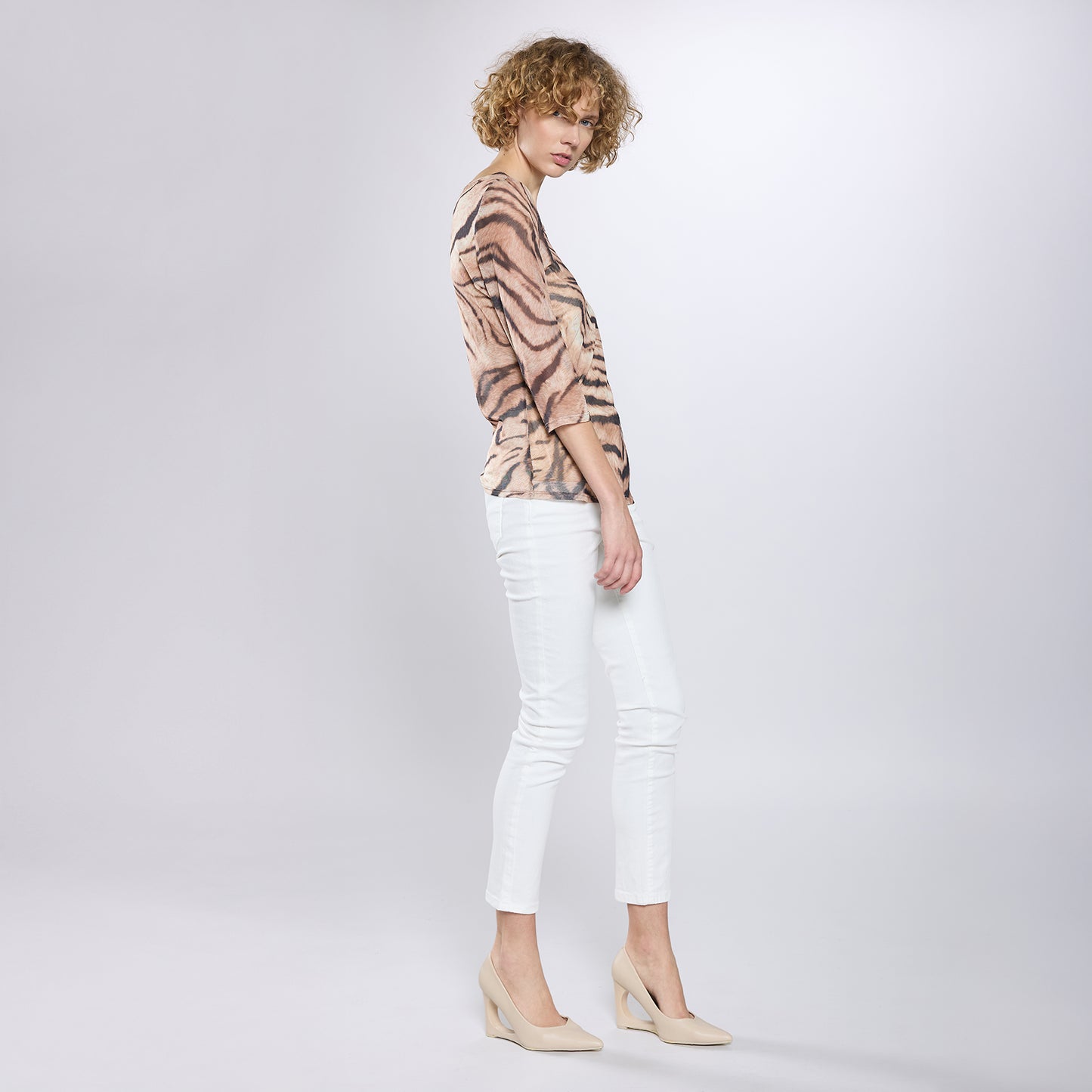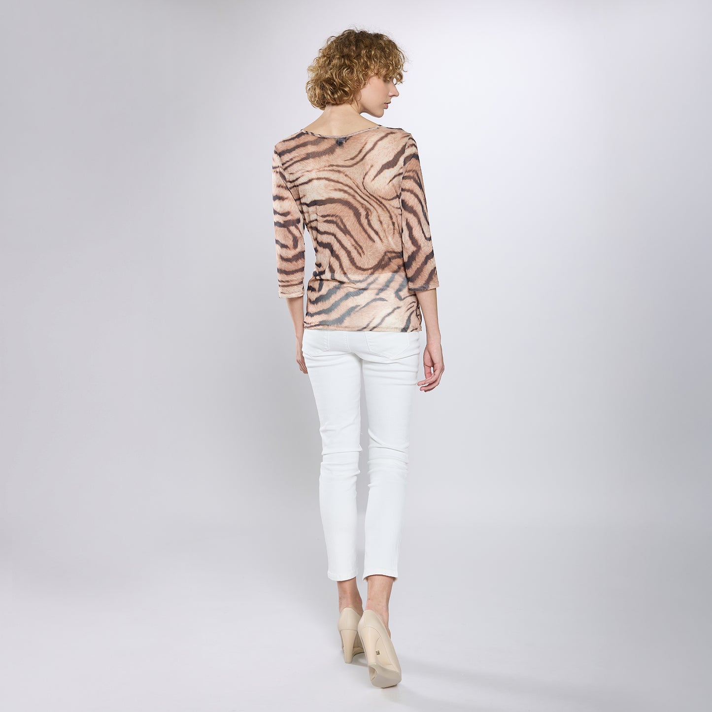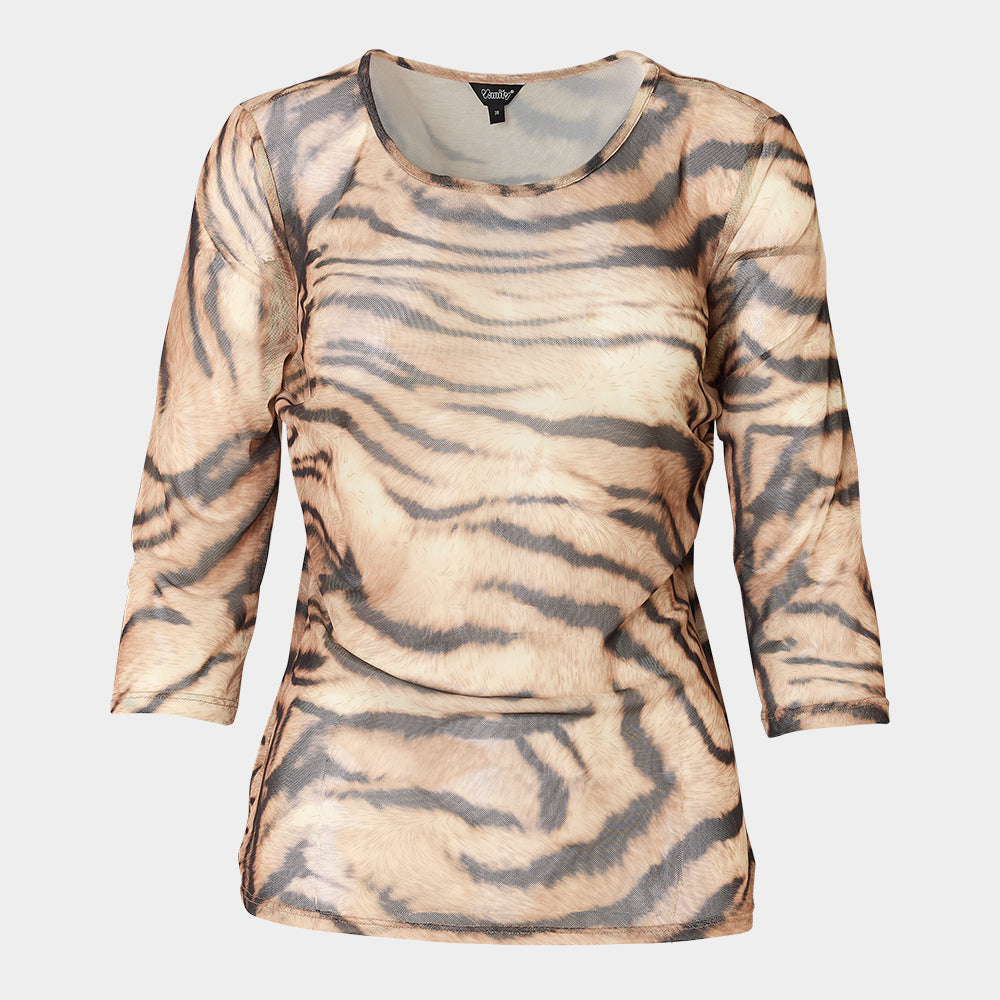 Top entallado en malla traslúcida de manga larga con cuello redondo. Modelo con diseño de apariencia animal print..