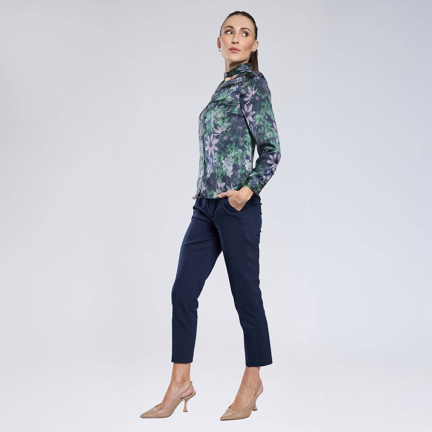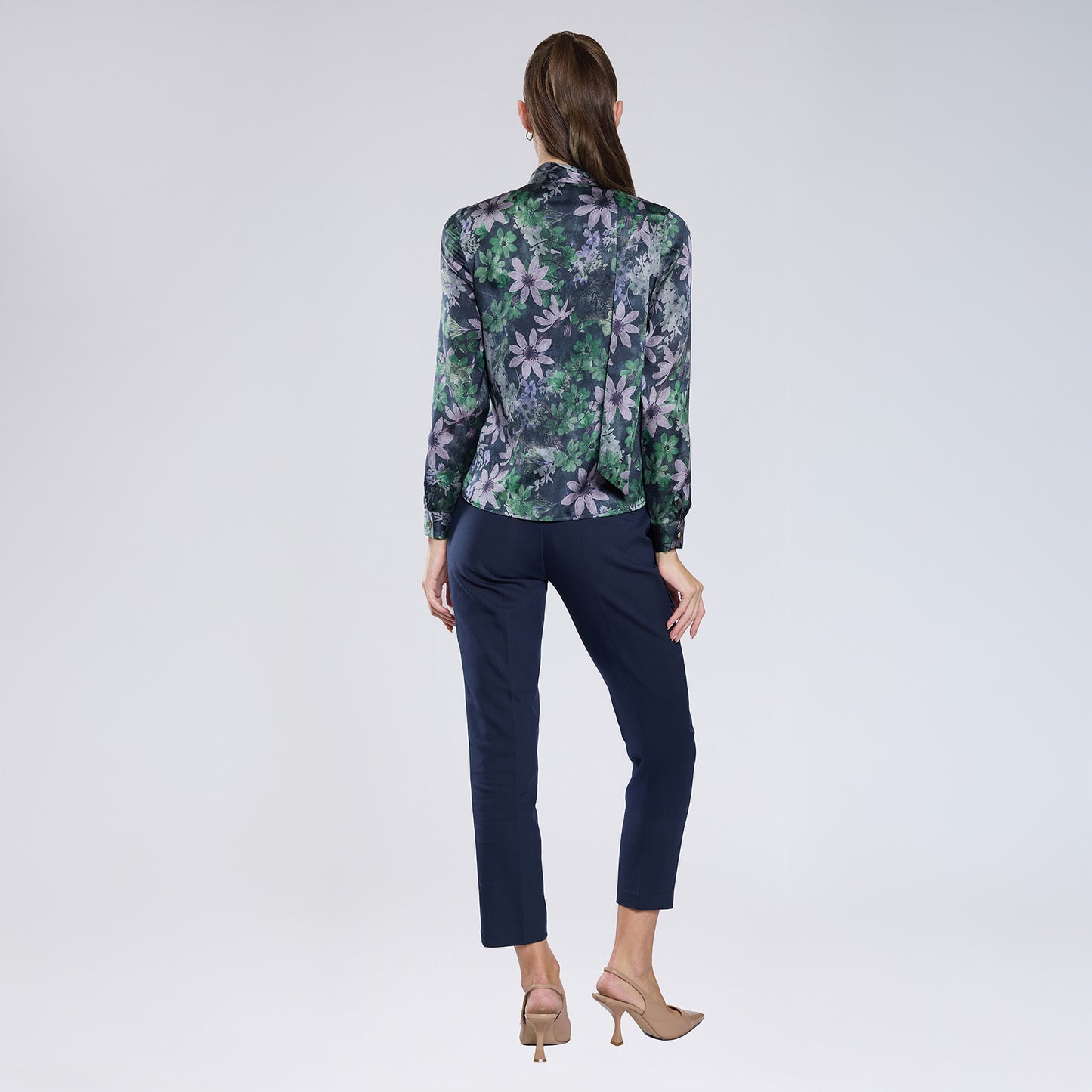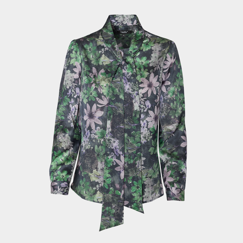 Blusa con print floral en tonos verde y lila, cuello tipo scoop acompañado de un lazo hecho moño, abierta con seis botones, maga larga con puño camisero y botones redondo metálico, confeccionada en una tela ligera y sedosa..