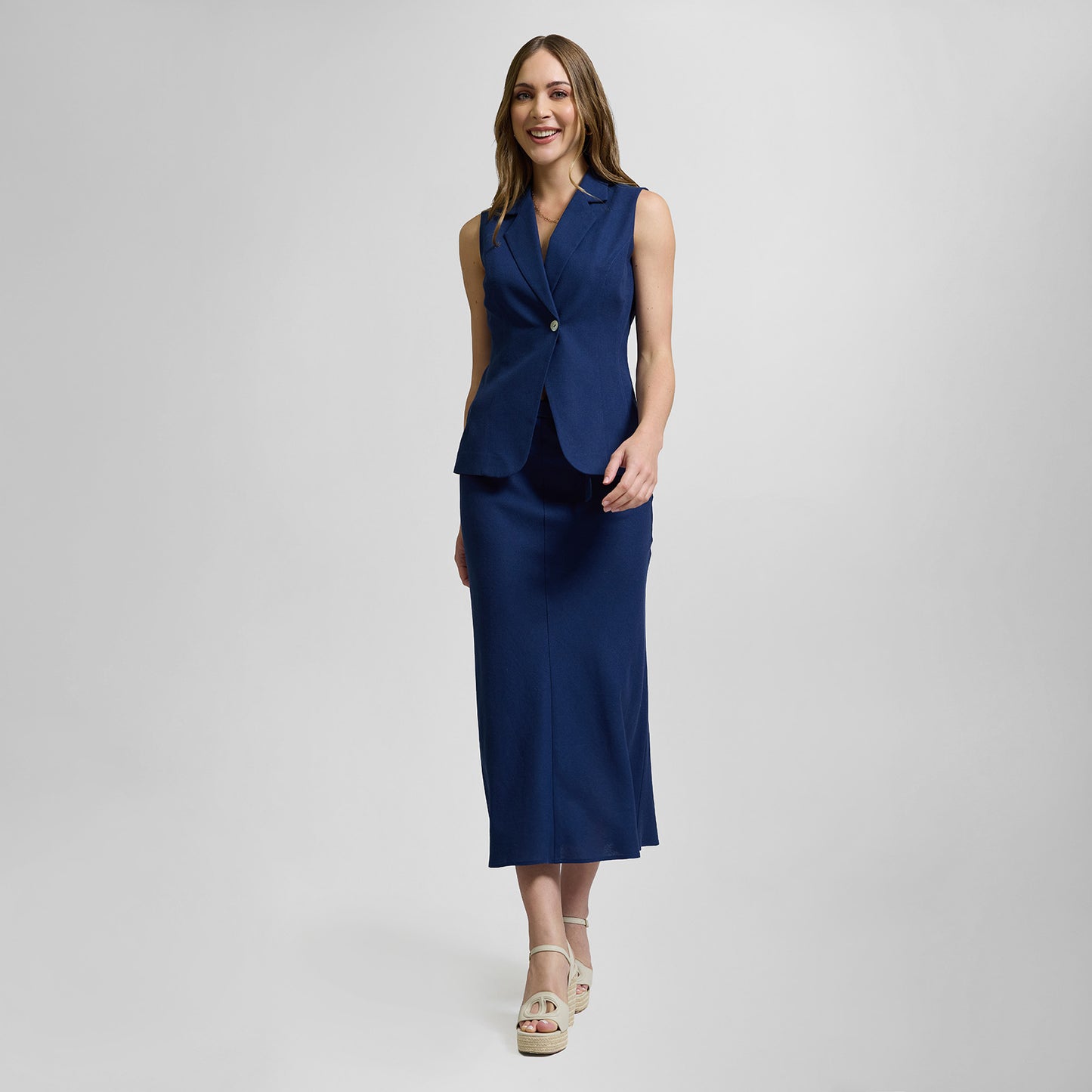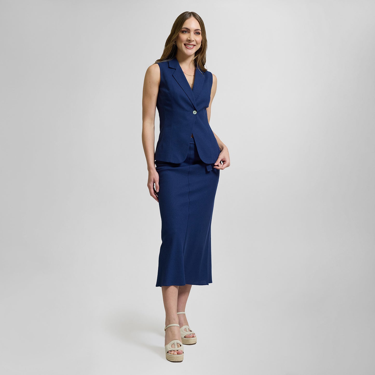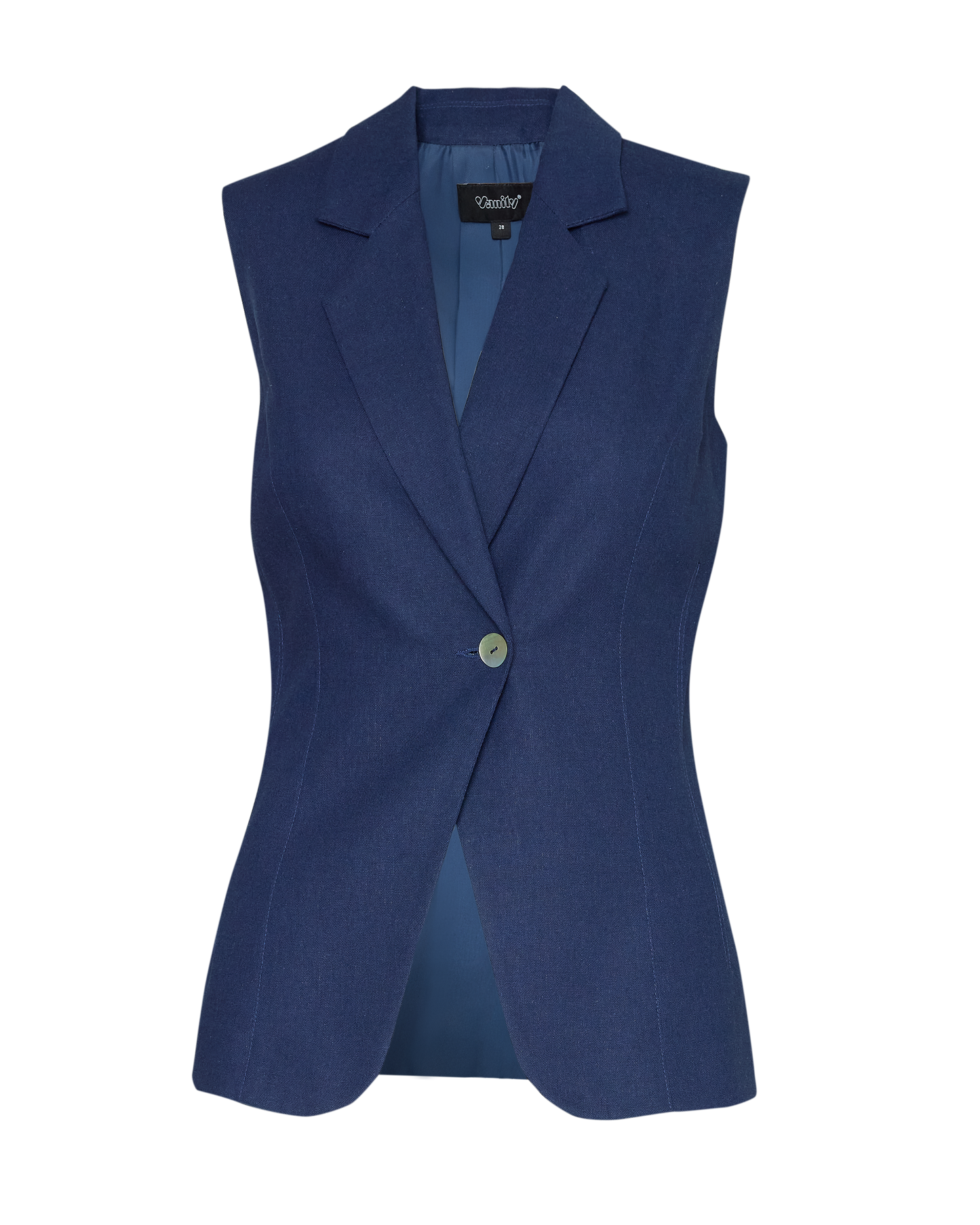 Chaleco confeccionado en lino, silueta entallada, con solapa y un botón al frente.