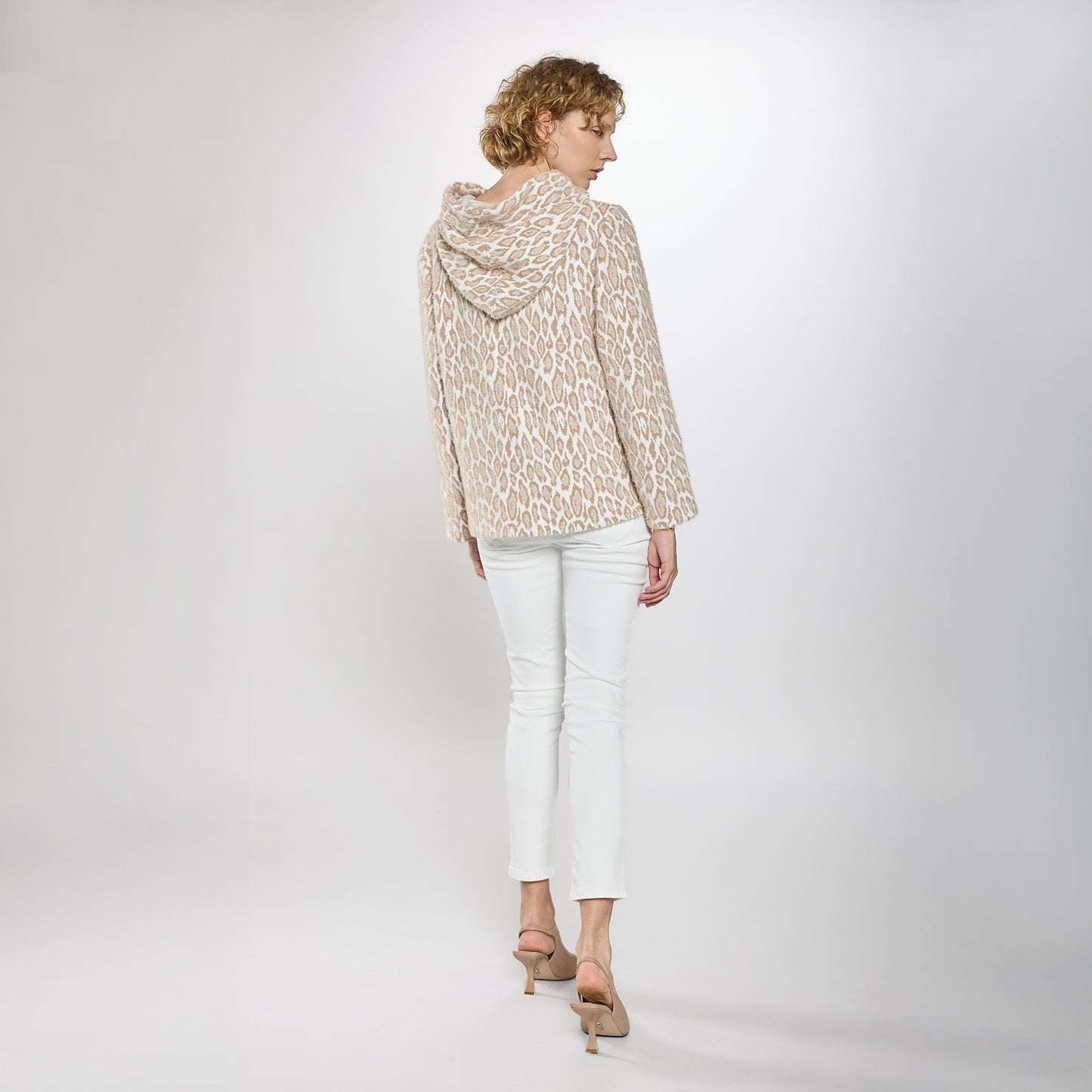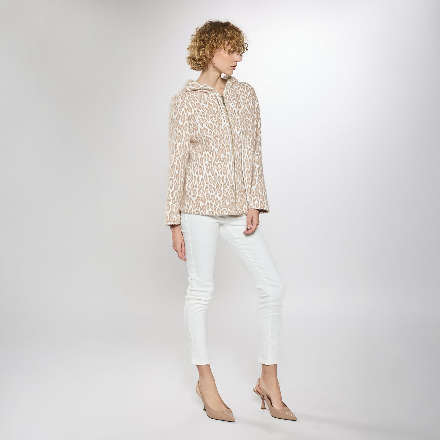 Chamarra animal print, manga larga, cierre de zipper frontal metálico, capucha y cordones en los laterales.