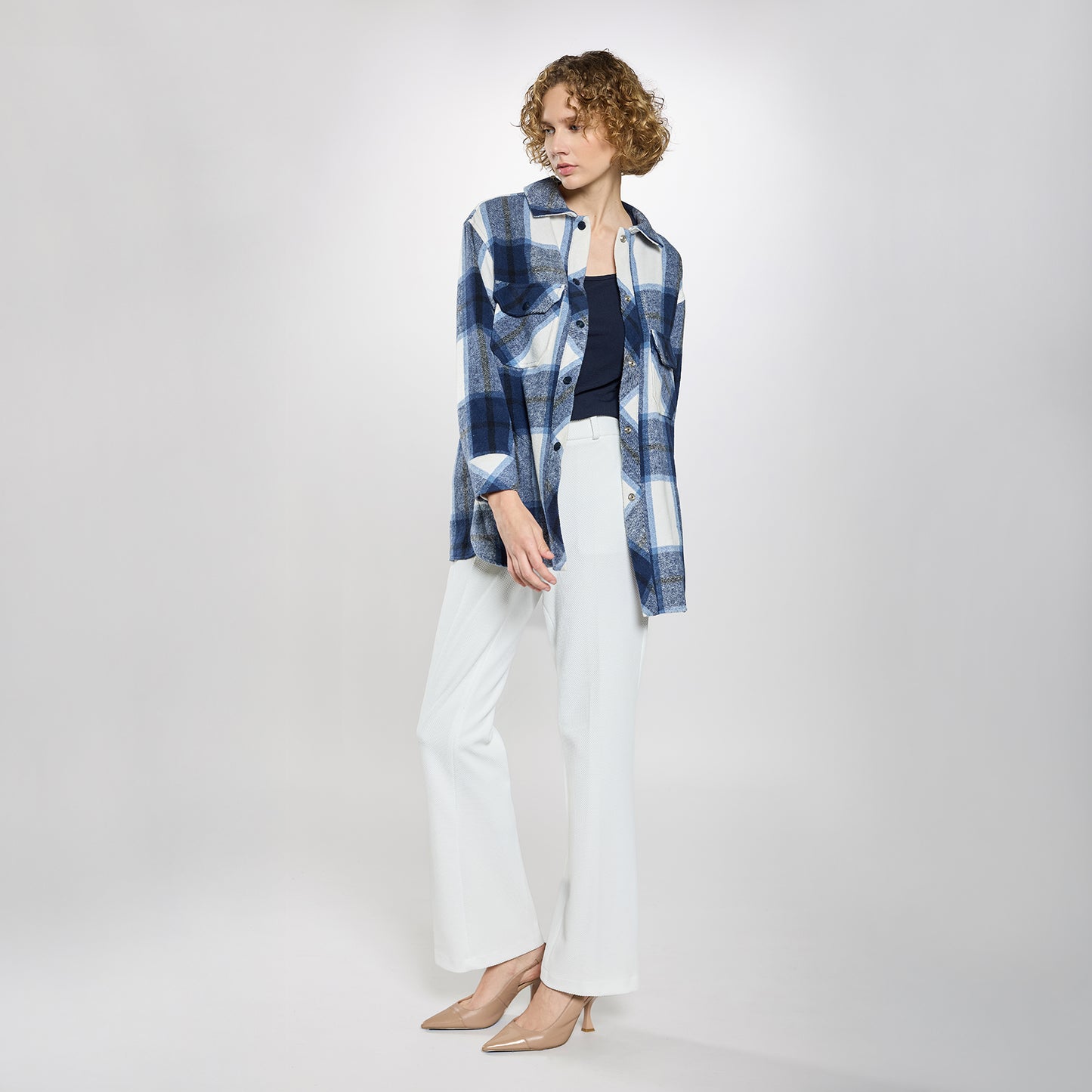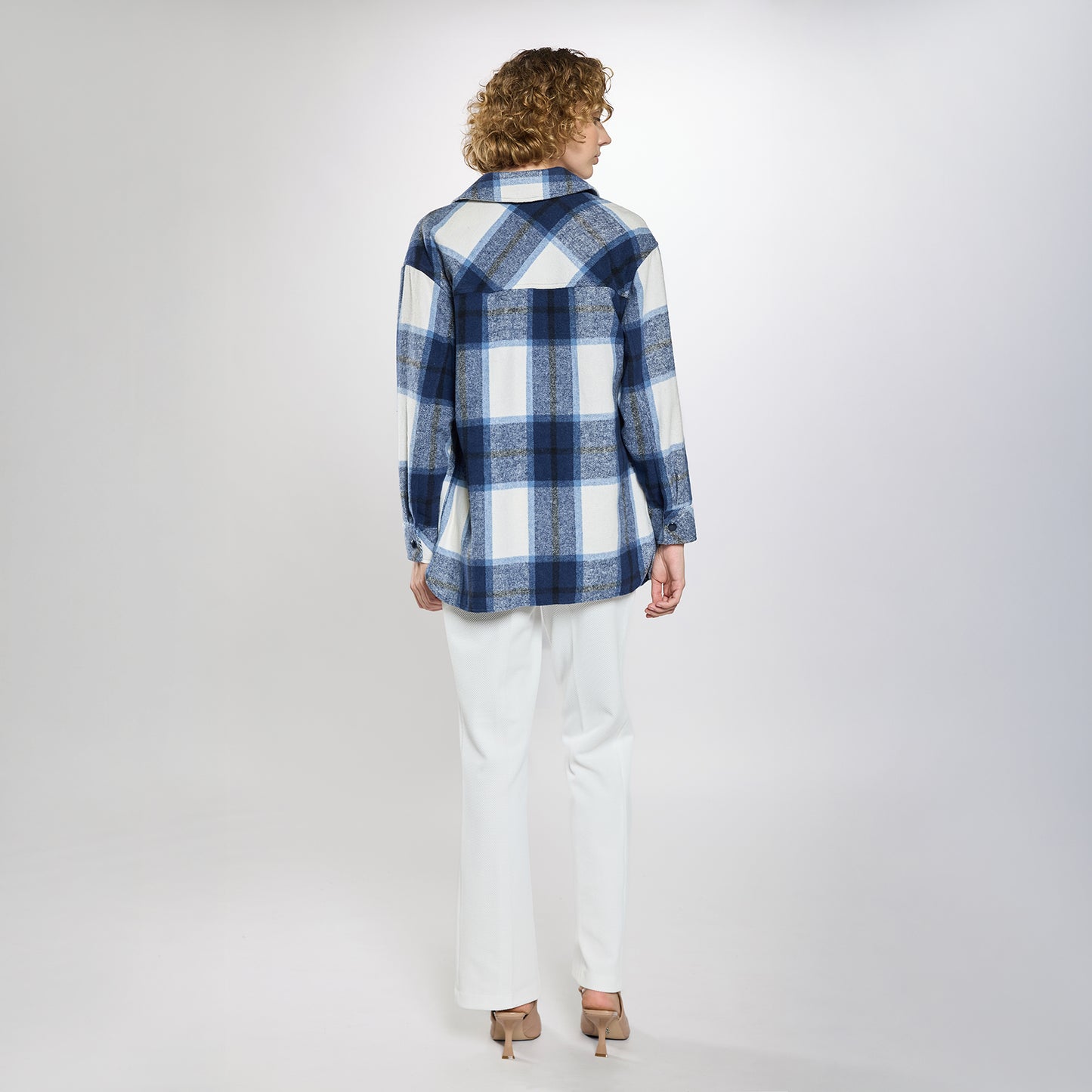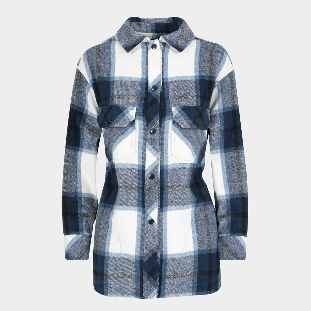 Chamarra tipo camisa suave, con cierre frontal de cinco botones, dos bolsillos laterales con botón y manga larga con puños abotonados.