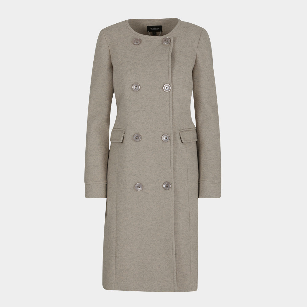Abrigo midi, con cuello tipo scoop, ocho botones, hombreras, manga larga bolsillos con solapa estilo jetted a los costados; confeccionado en una tela suave.