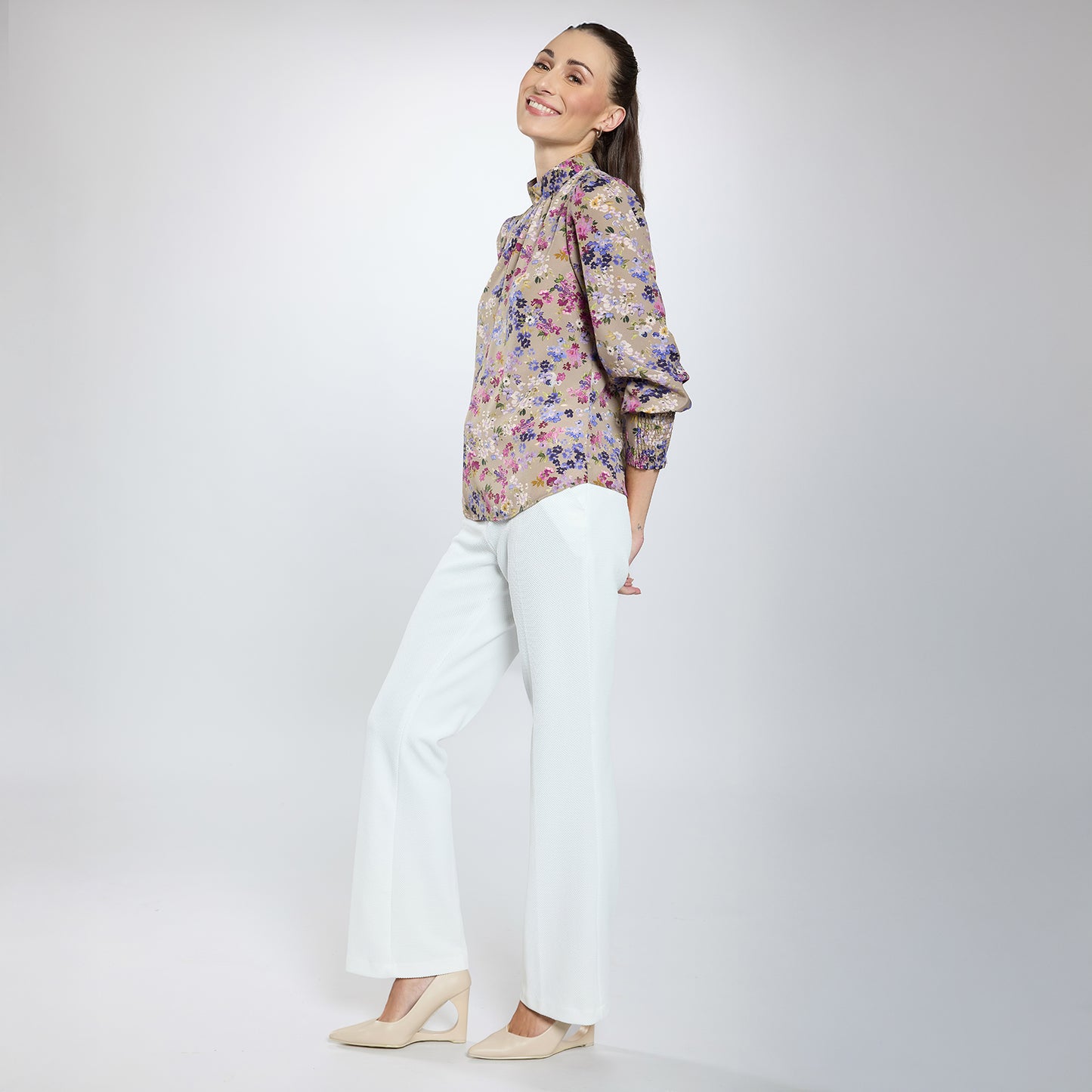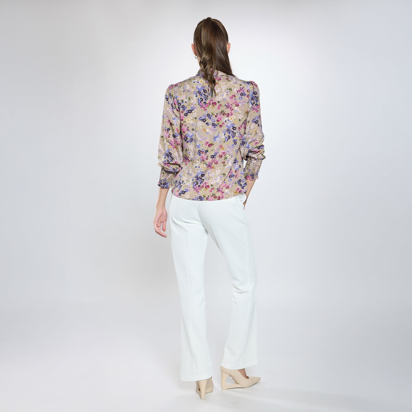 Blusa de cuello alto, escote en forma de gota en la parte trasera acompañado de doble botón, fruncido en el escote delantero, manga larga con resorte en puño.