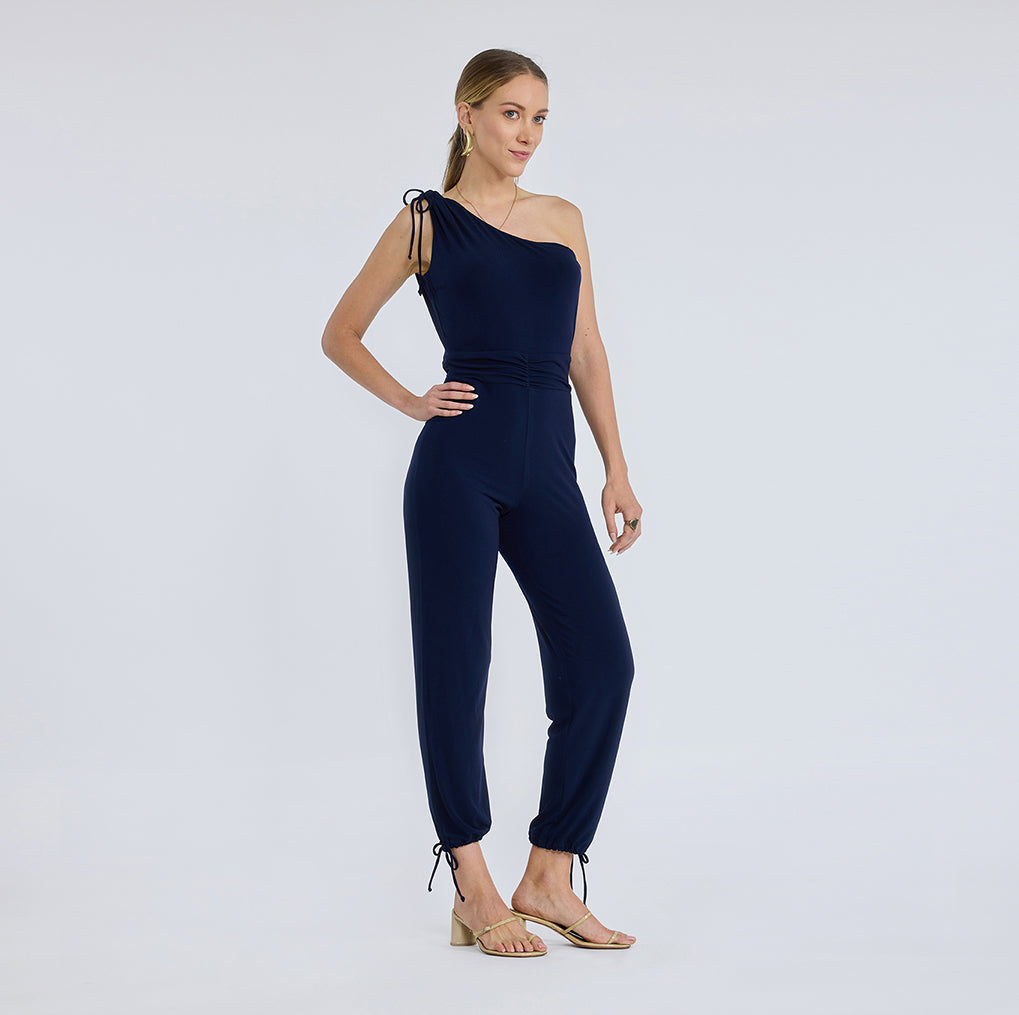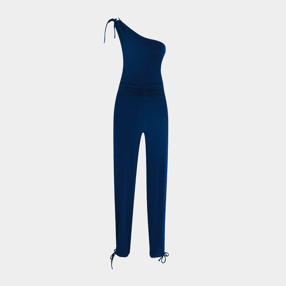 Jumpsuit en tejido elástico de un hombro y manga sisa. Hombro ajustable por jaretas del mismo textil. Cintura ceñida en pliegues. Corte de piernas recto, tobillo ajustable por jaretas del mismo textil.