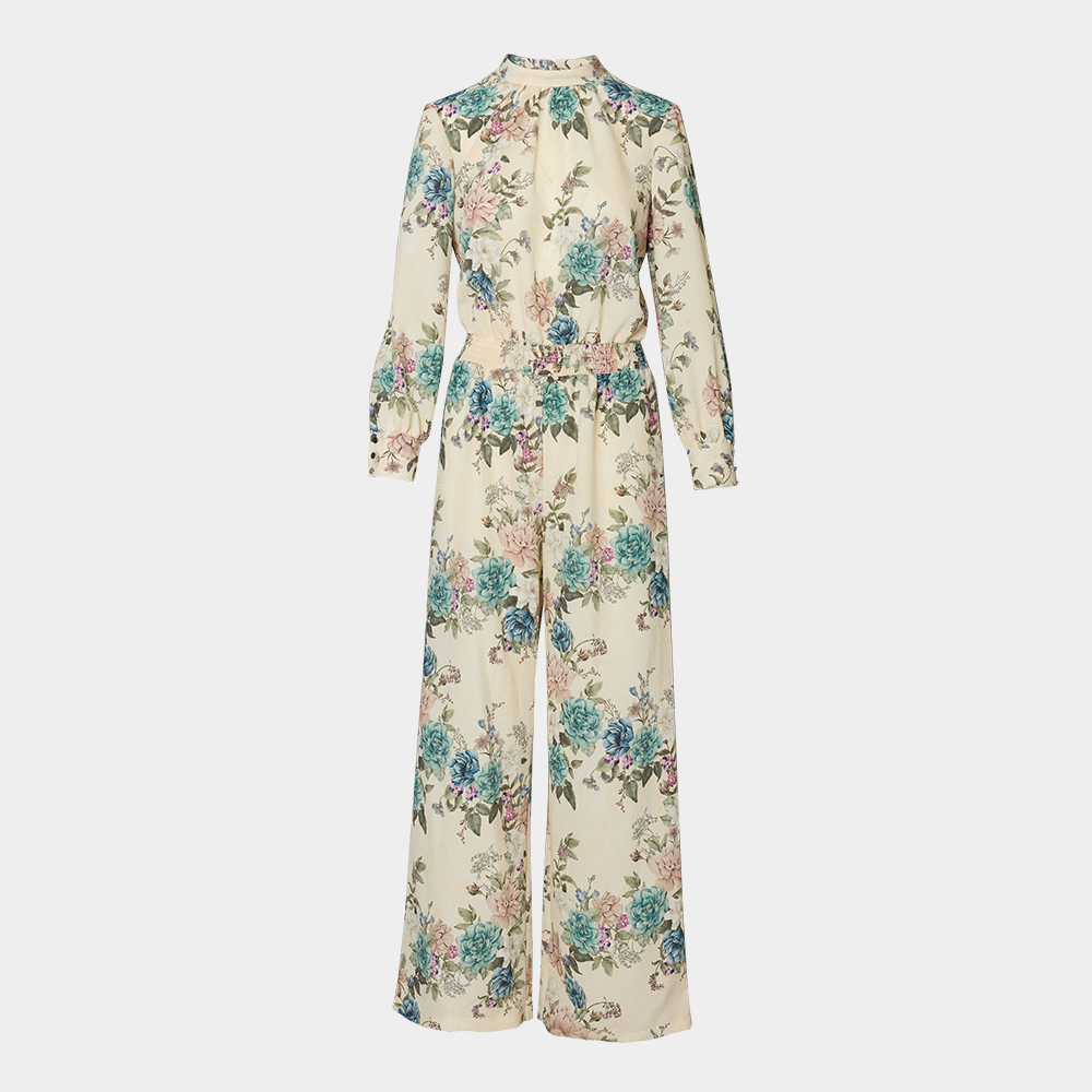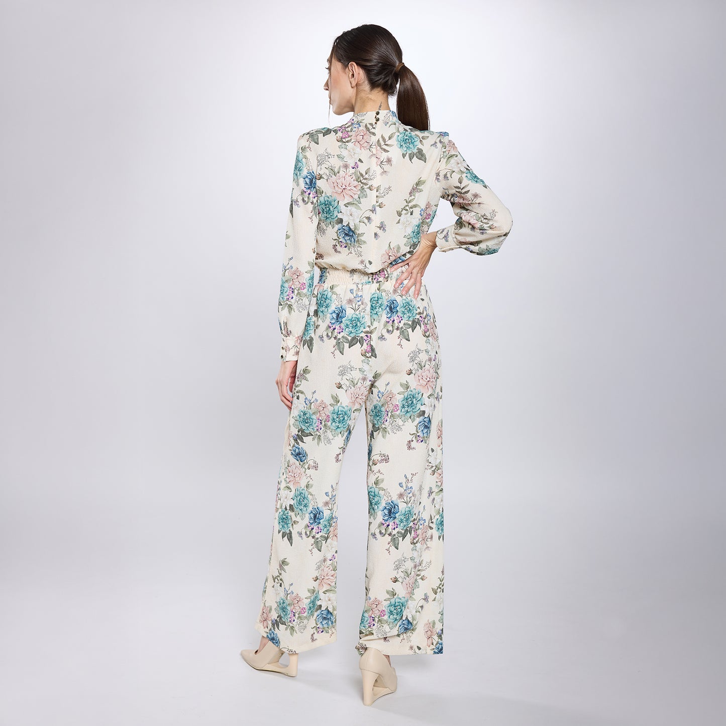 Jumpsuit floreado, de cuello redondo alto, con cierre de zipper en espalda, fruncido en cintura, manga larga con terminado tipo camisa y puño con tres botones en tono plata; corte wide.