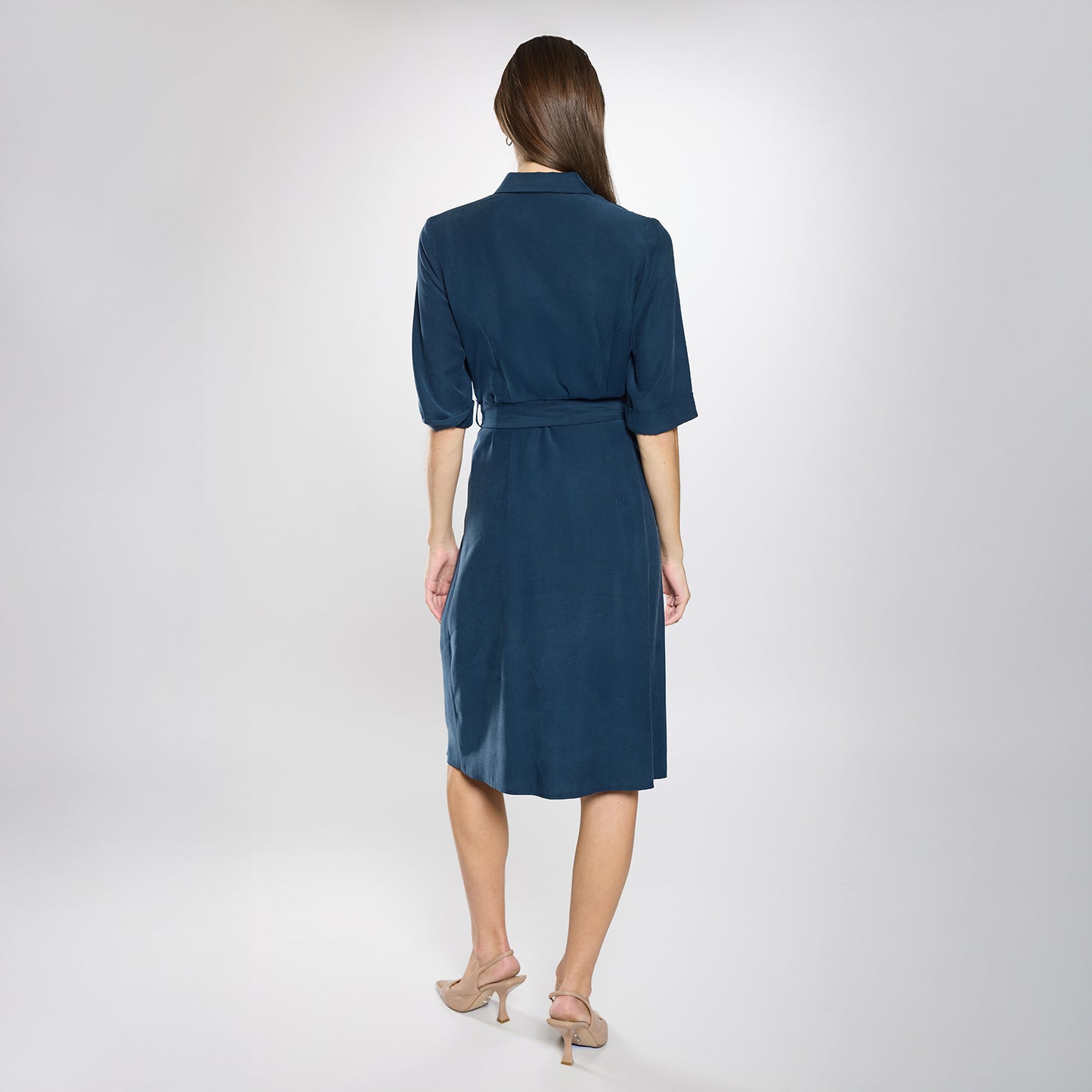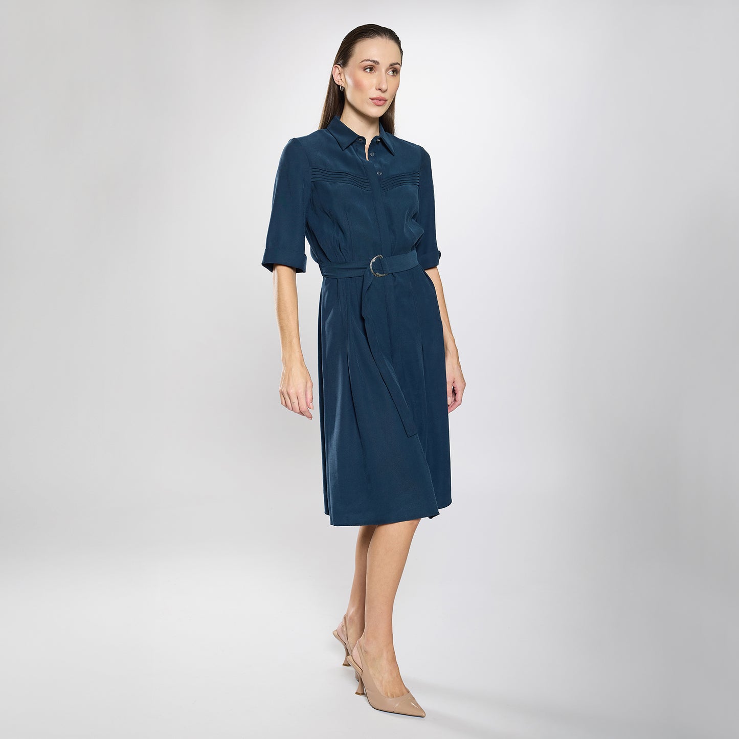 Vestido de manga corta, con cuello camisero, cierre frontal con doce botones y detalle de costuras en el pecho.