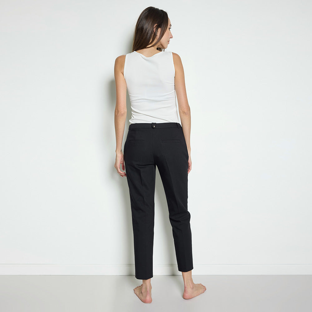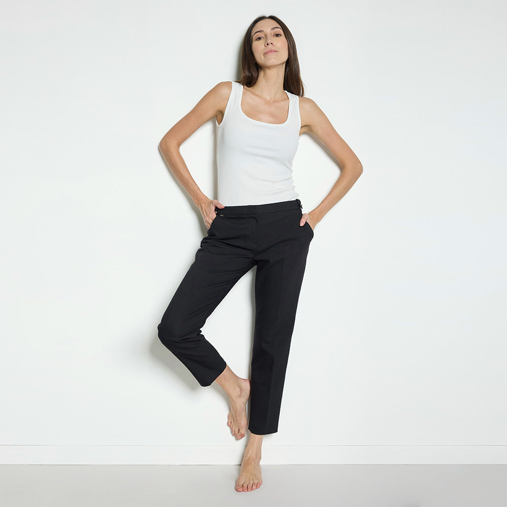 Pantalón negro corte recto con detalles de botones dorados en pretina y bolsillos ocultos.