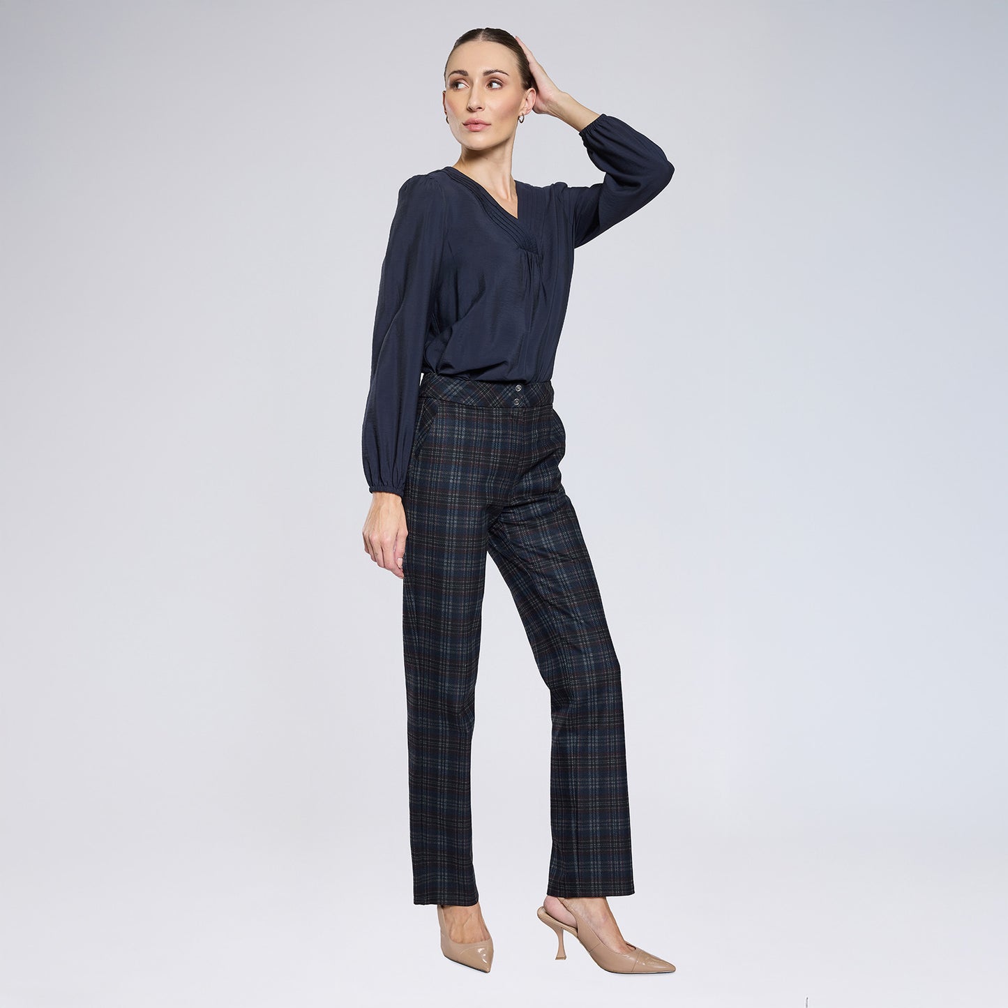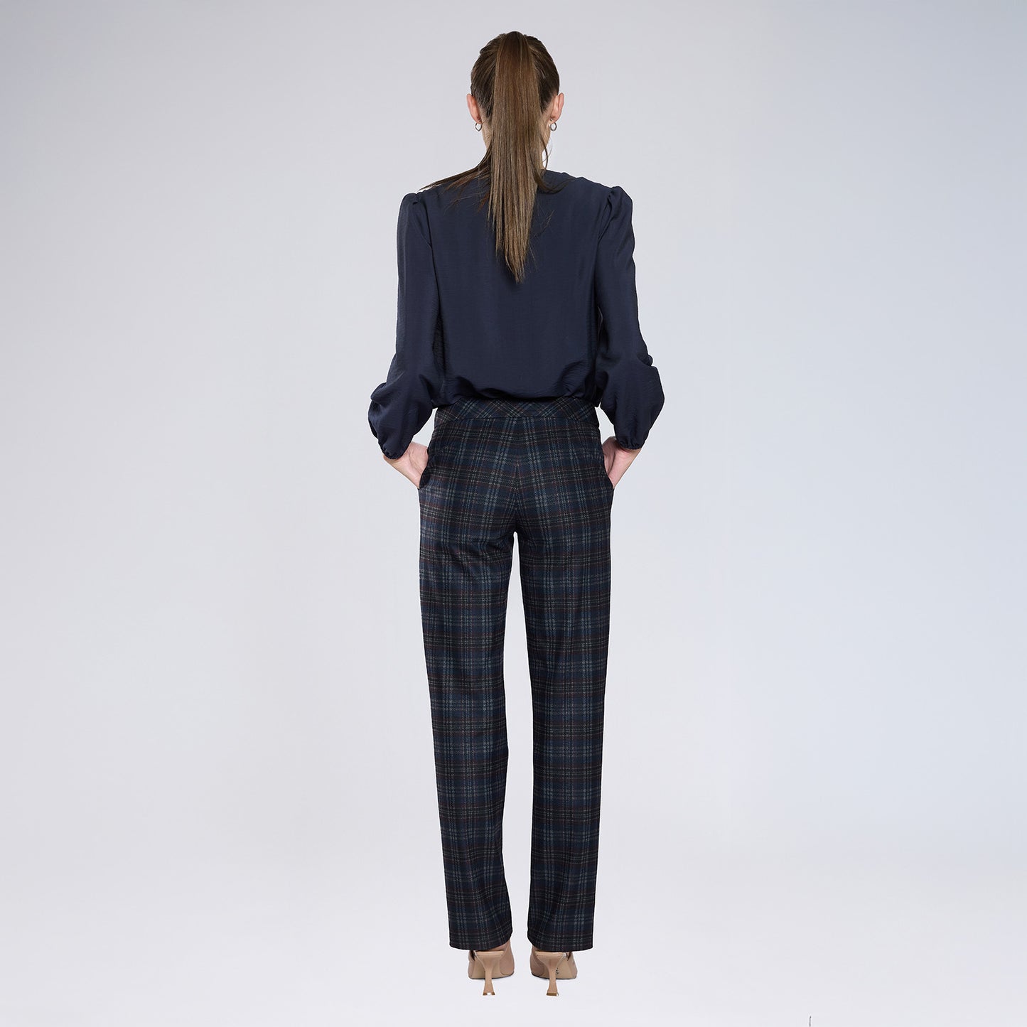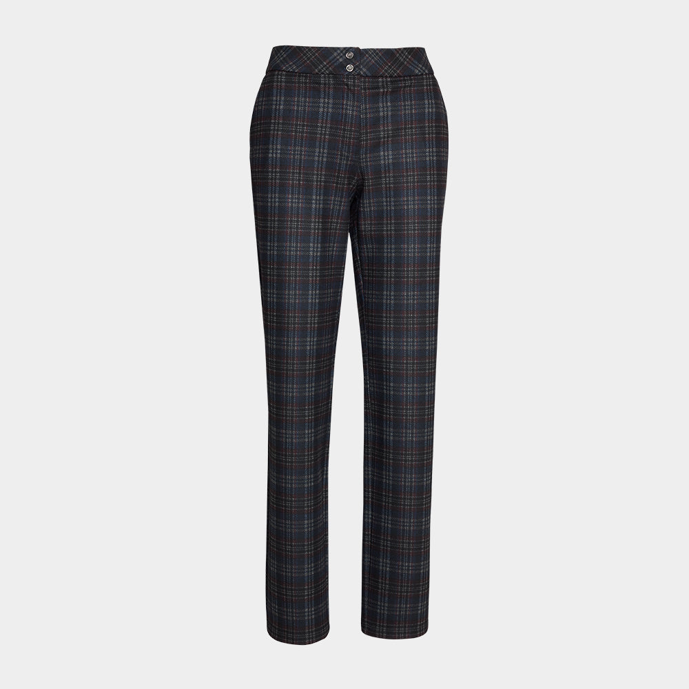 Pantalón recto de cuadros, con pretina, cierre de zipper y dos botones frontales.