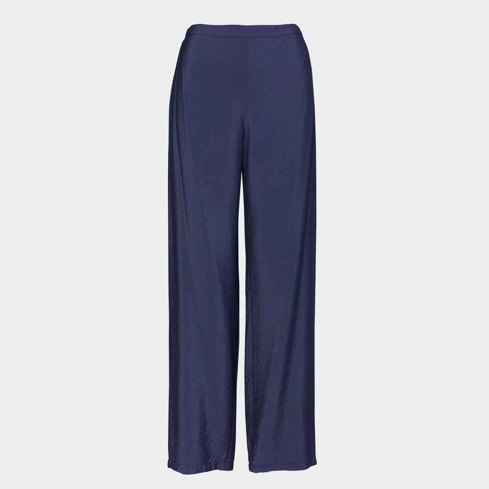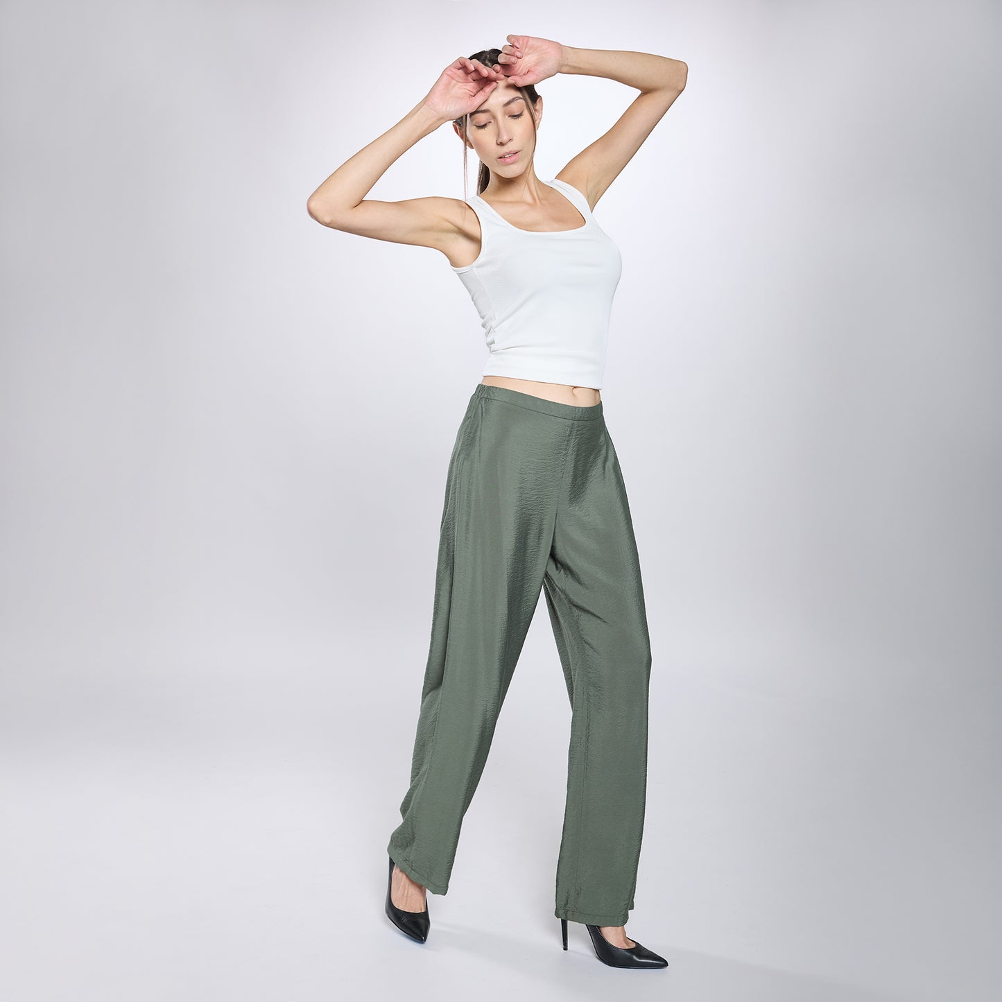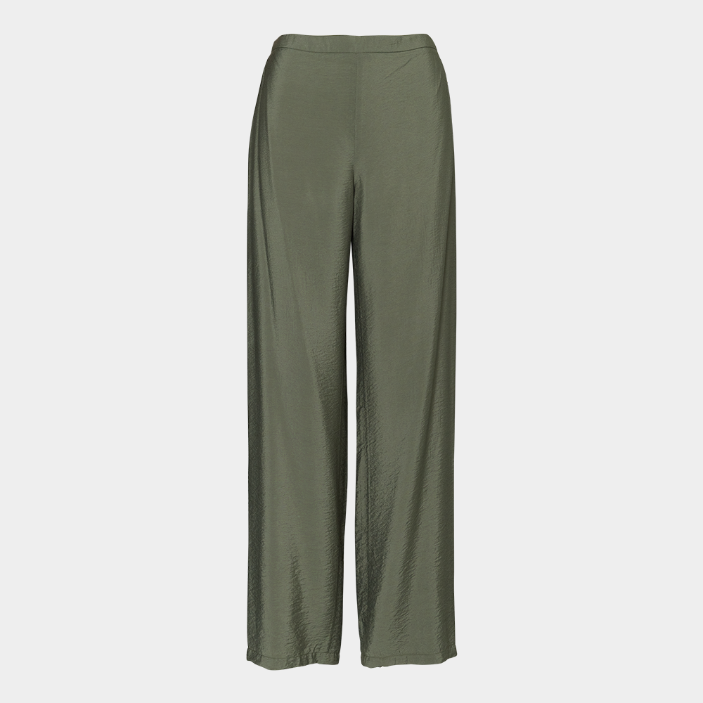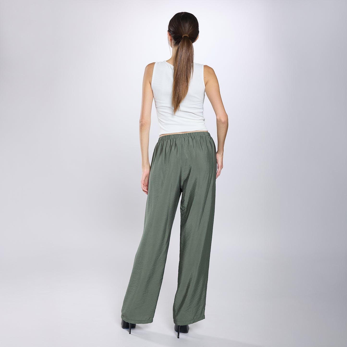Pantalón estilo wide leg con resorte sin bolsillos, confeccionado en una tela satinada.