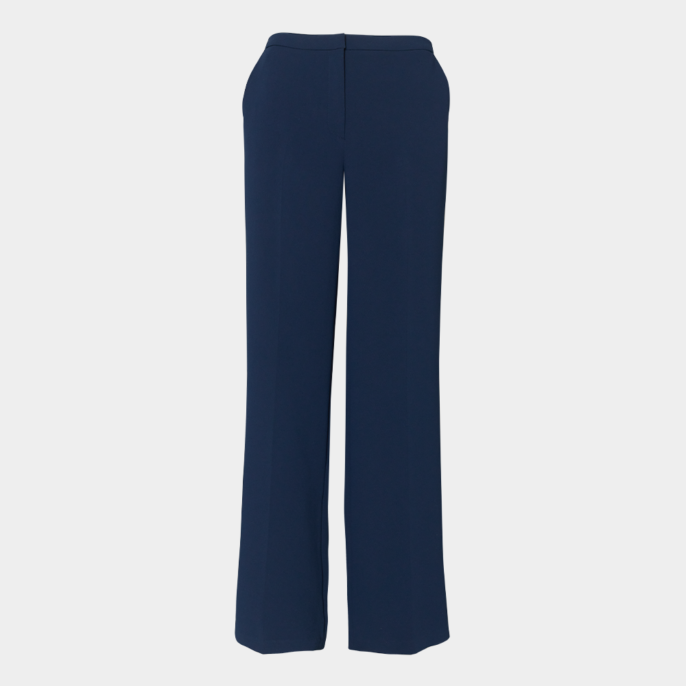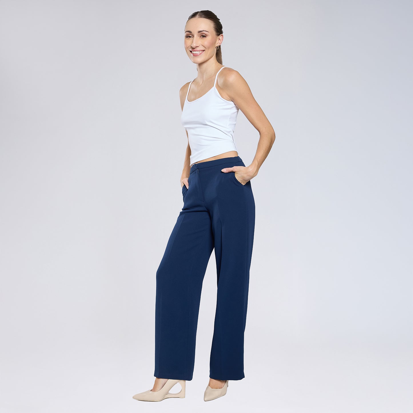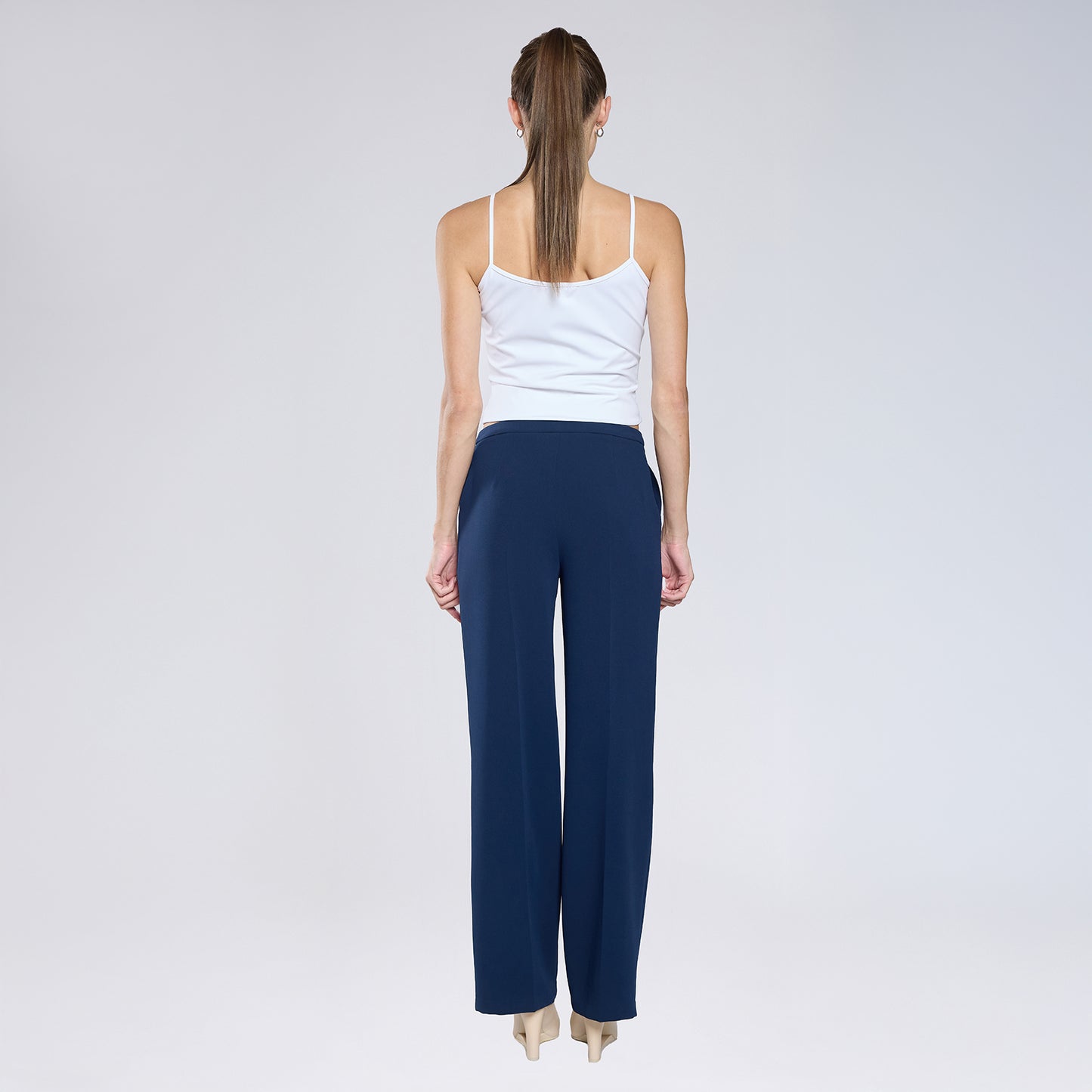 Pantalón de corte recto con una pretina delgada acompañada de un pasador y cierre tipo zipper, bolsillos invisibles a los costados.