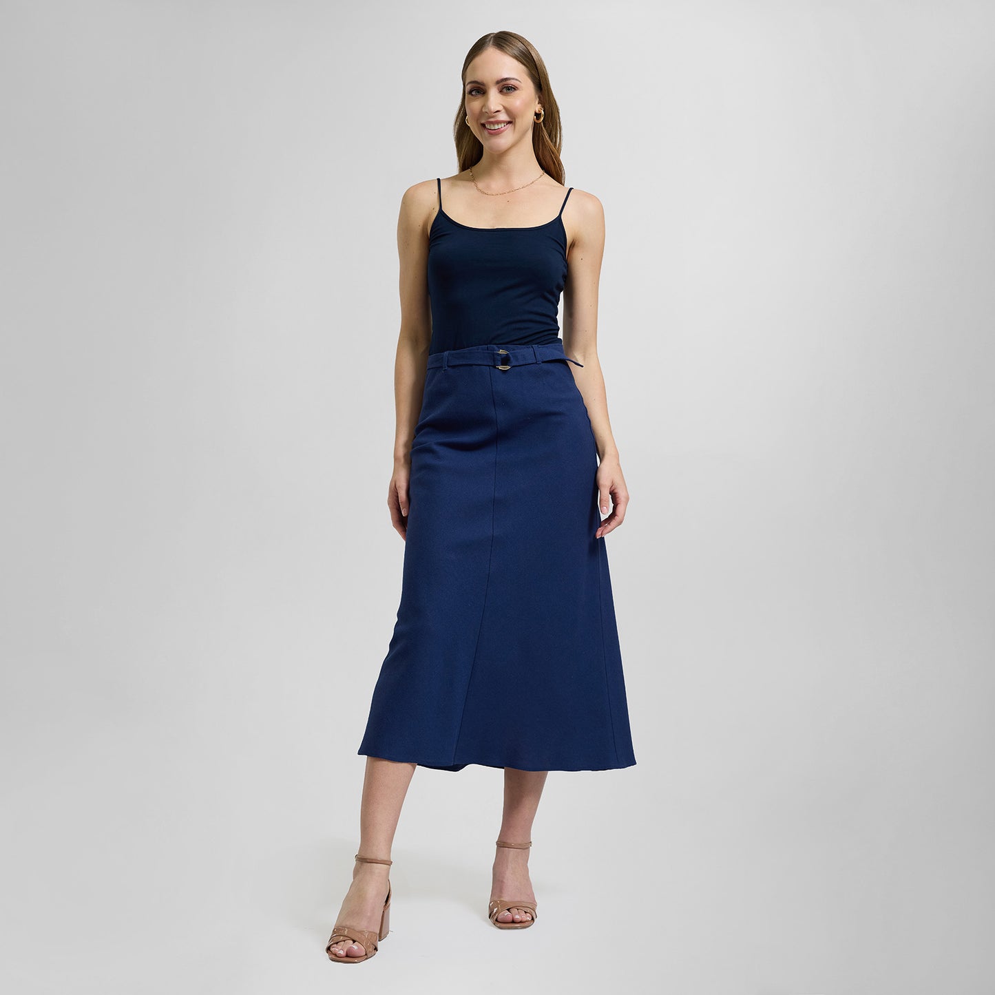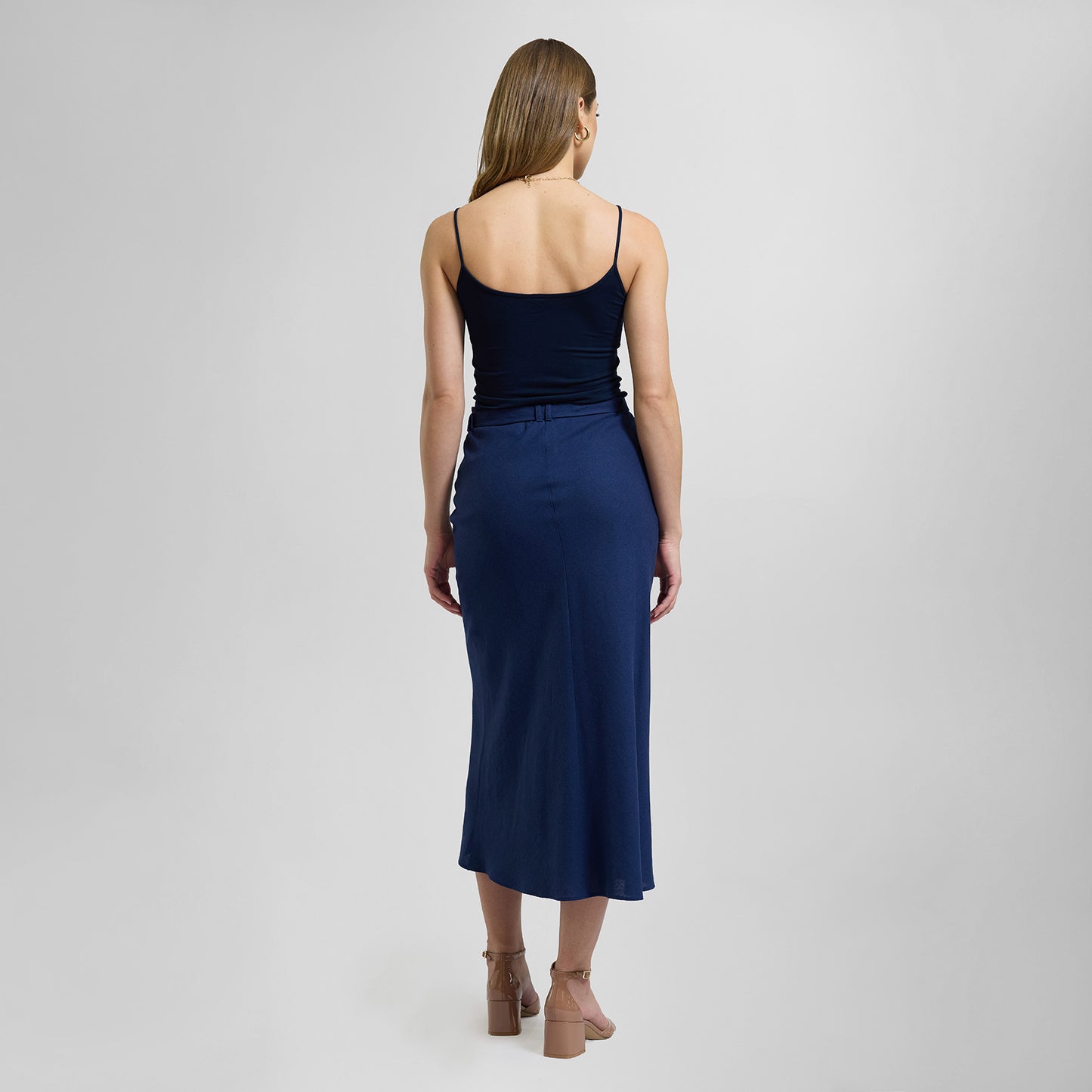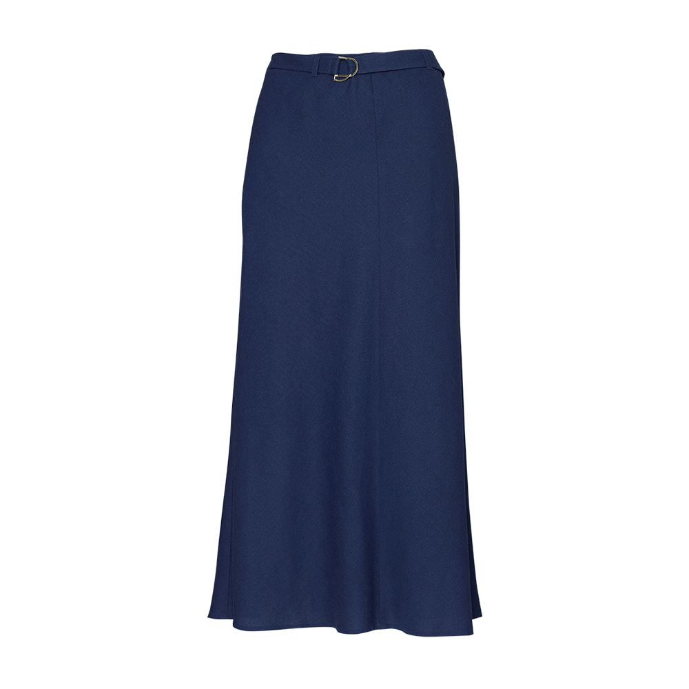 Falda larga confeccionada en lino, corte en A, con pretina y cinturón a juego con hebilla en tono plata.