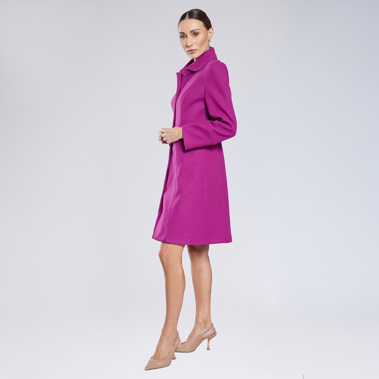 Abrigo largo de cuello americano, cierre frontal de botones en escalerilla y manga larga. Silueta ceñida al cuerpo.