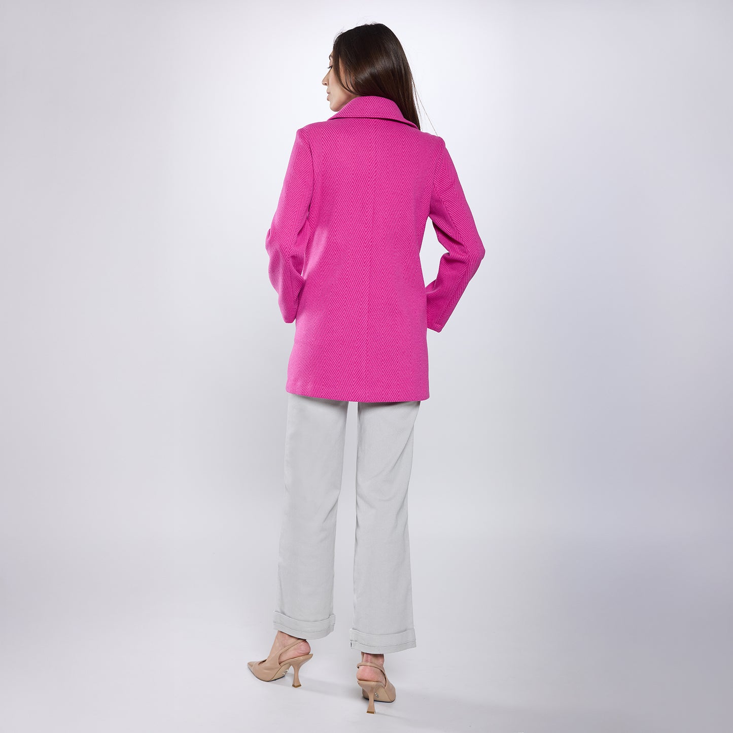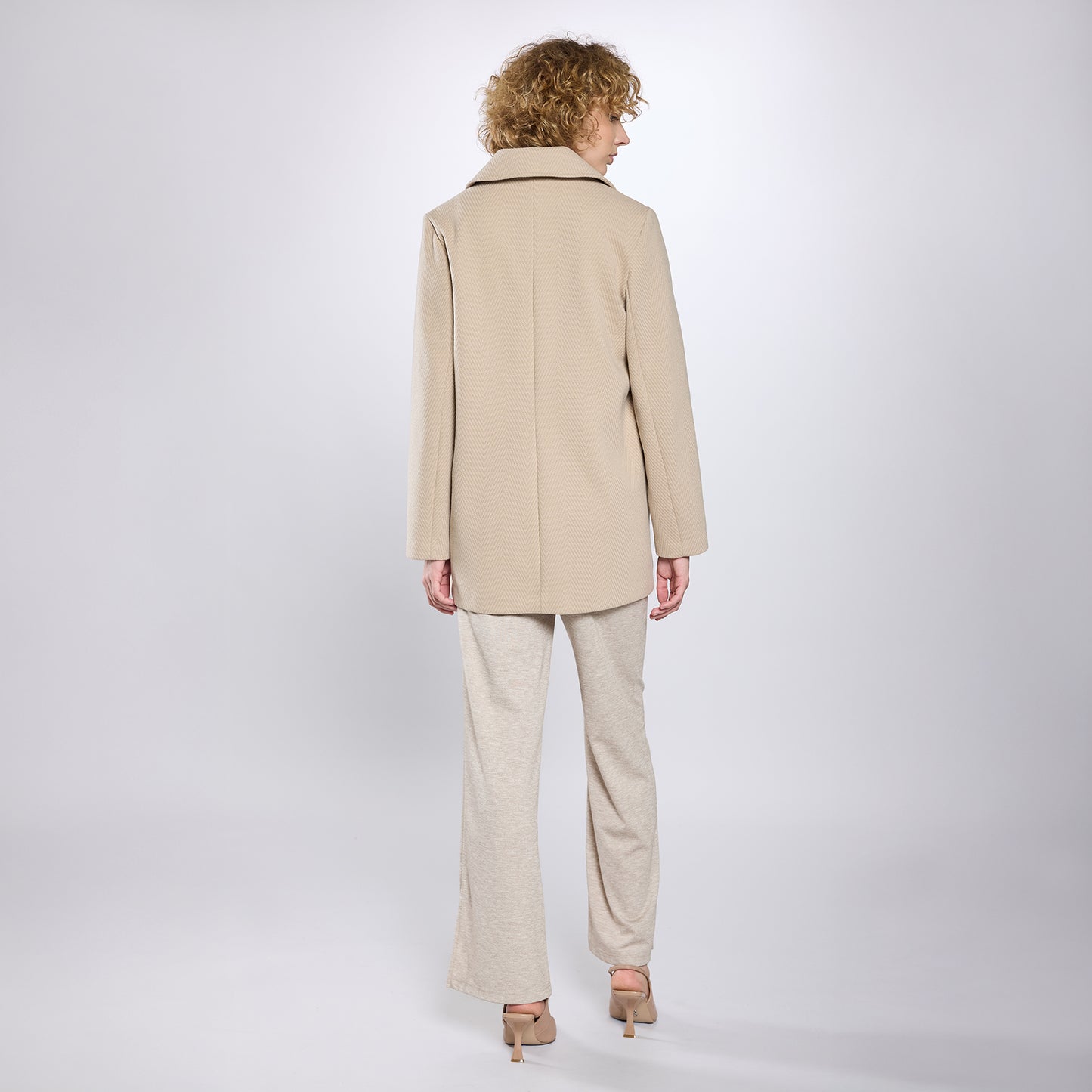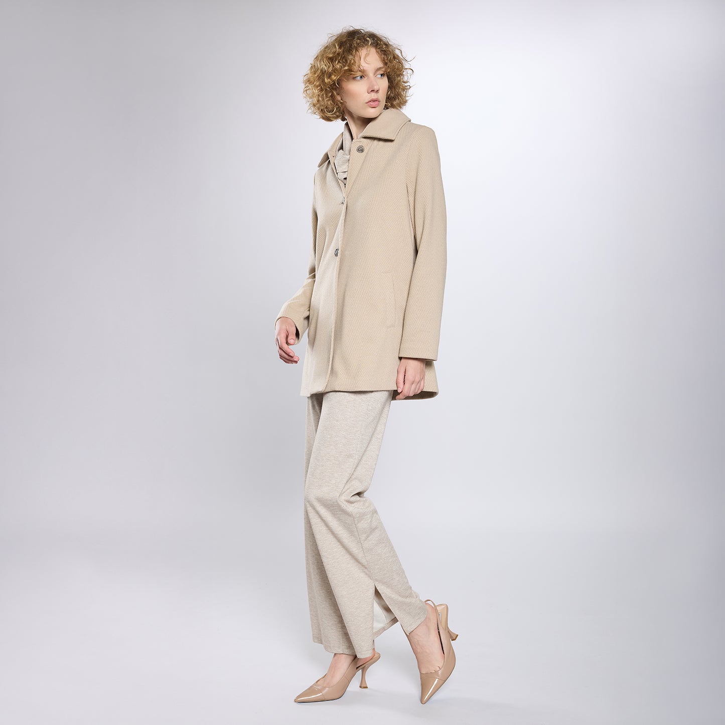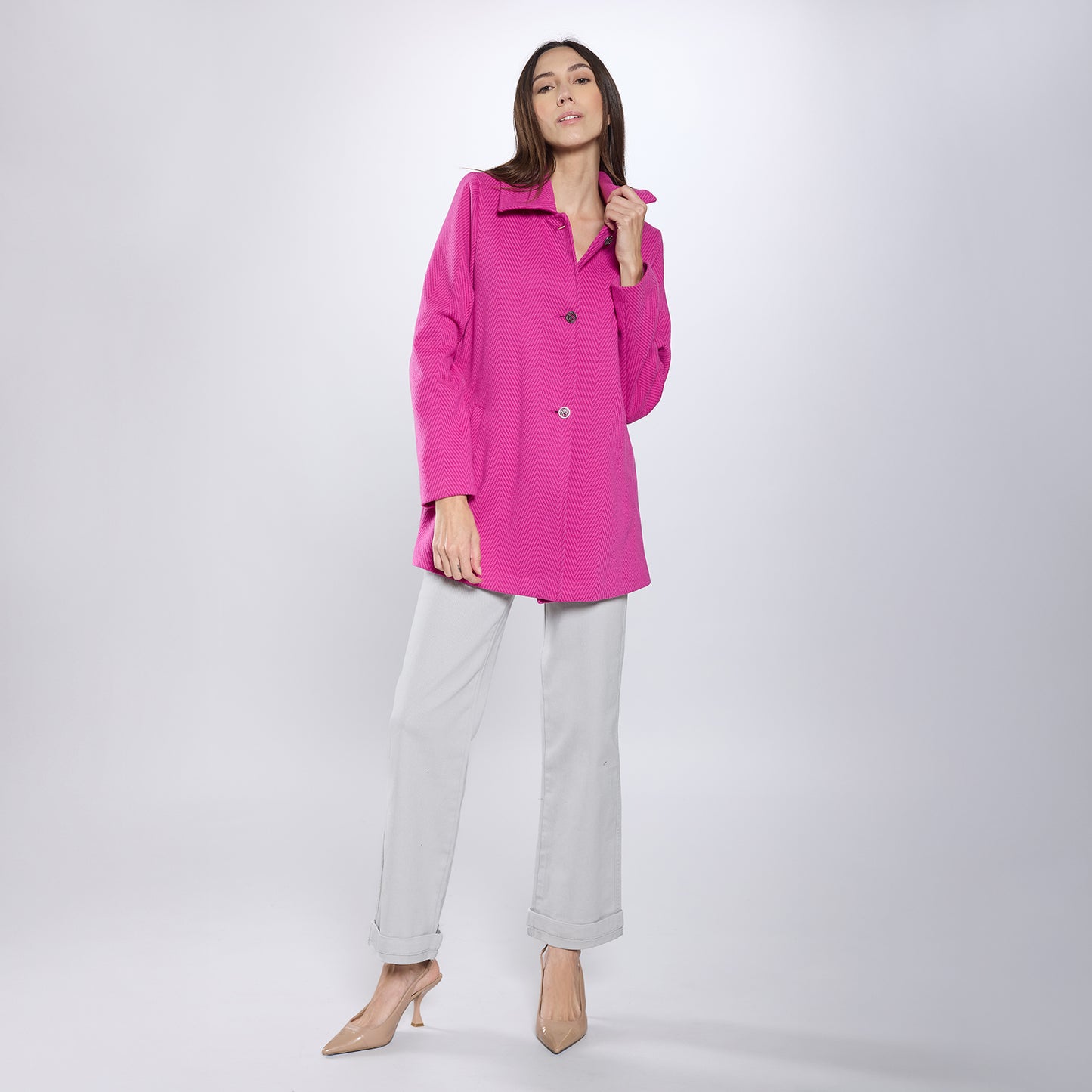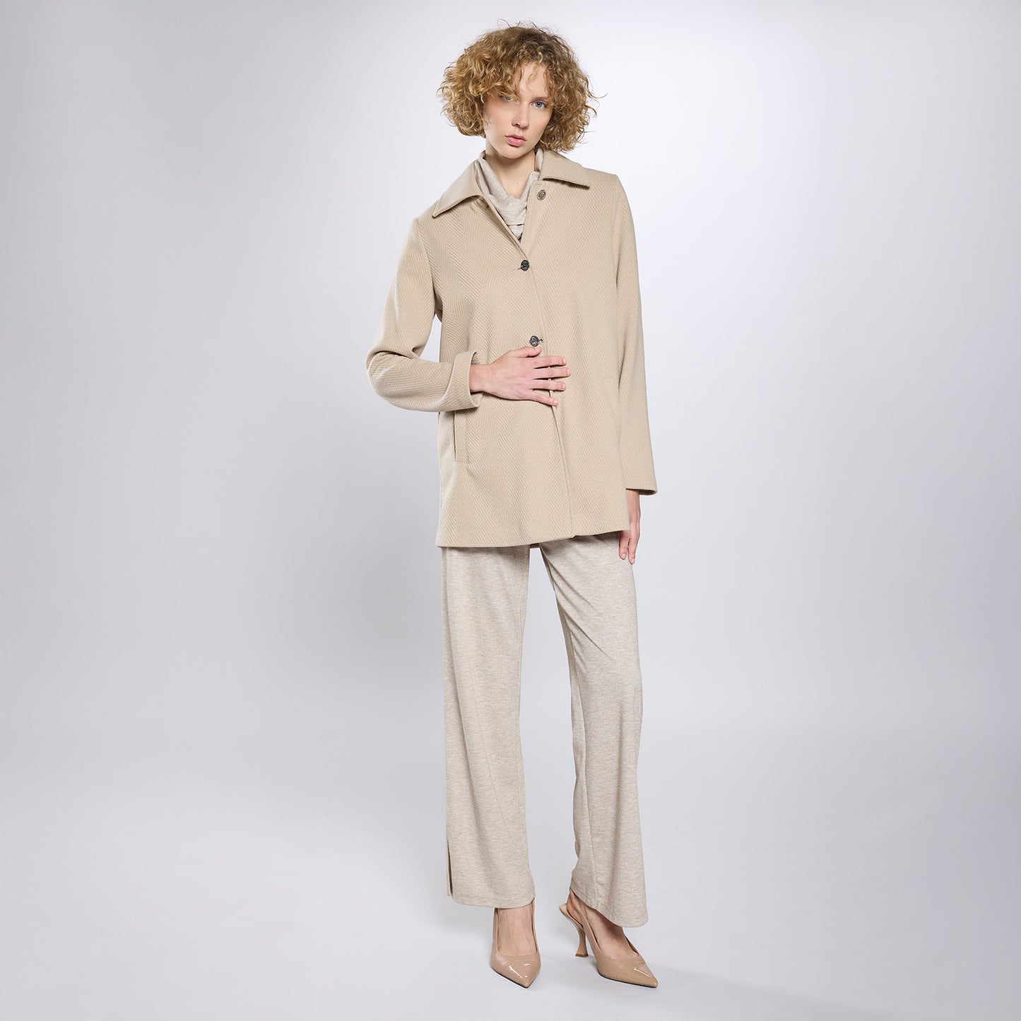 Abrigo de cuello americano, cierre frontal de botones en escalerilla. Manga larga.