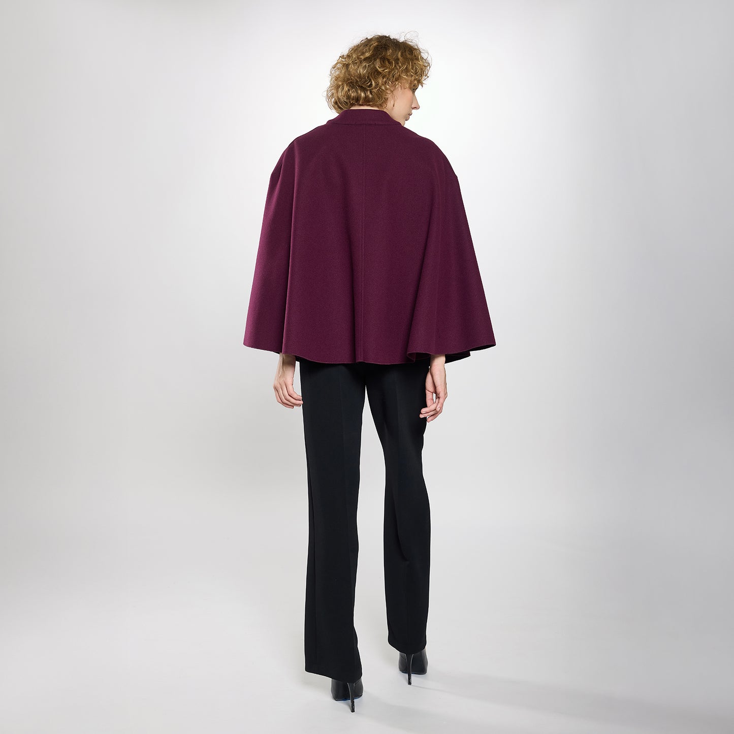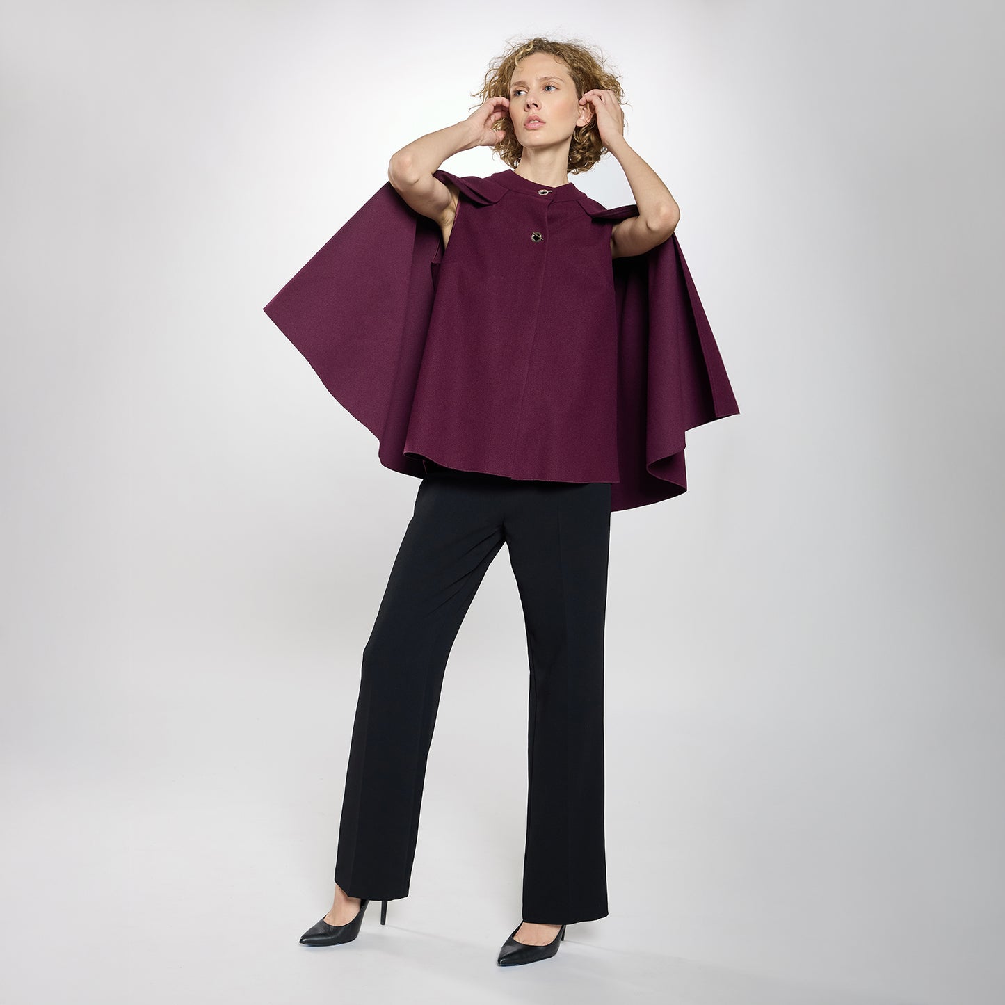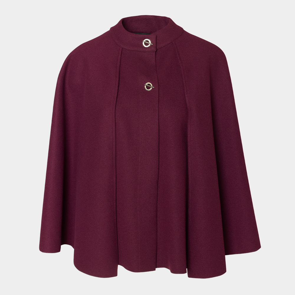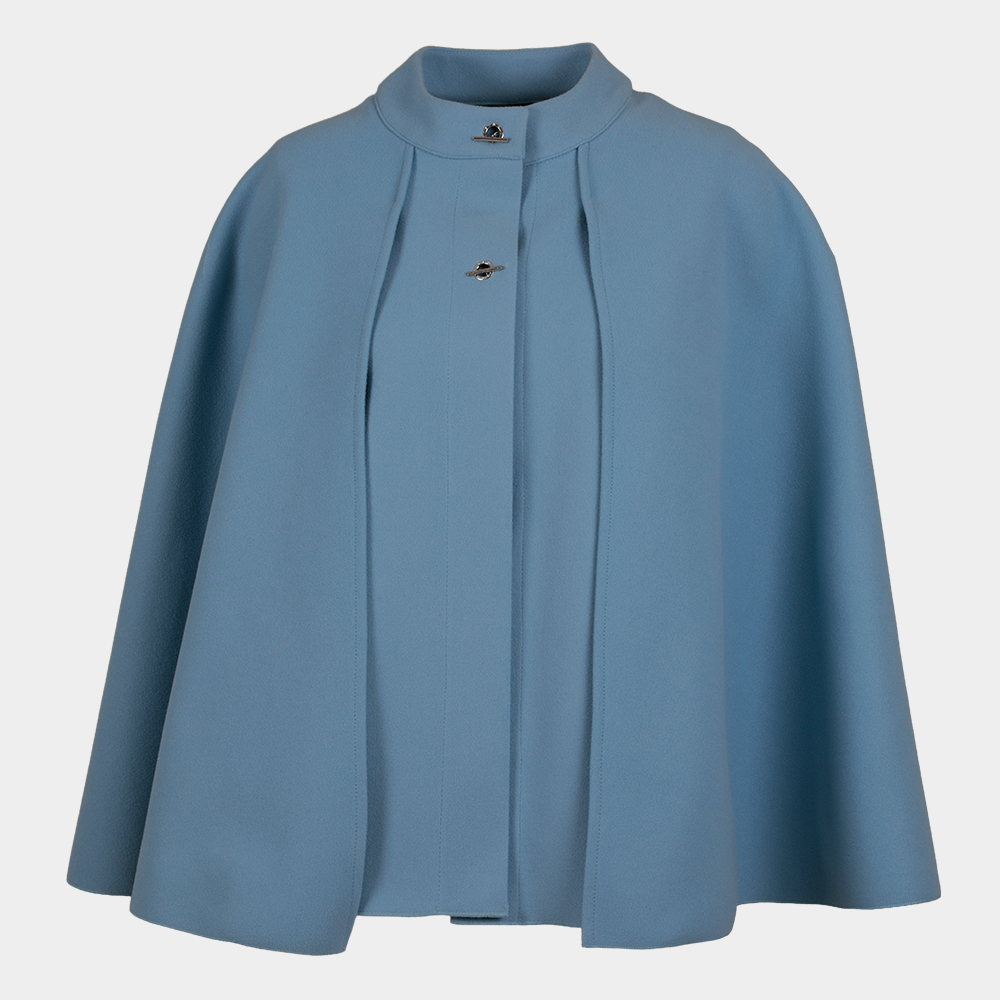 Capa de invierno con interior tipo chaleco, cuello redondo y dos broches plateados al frente para cierre.