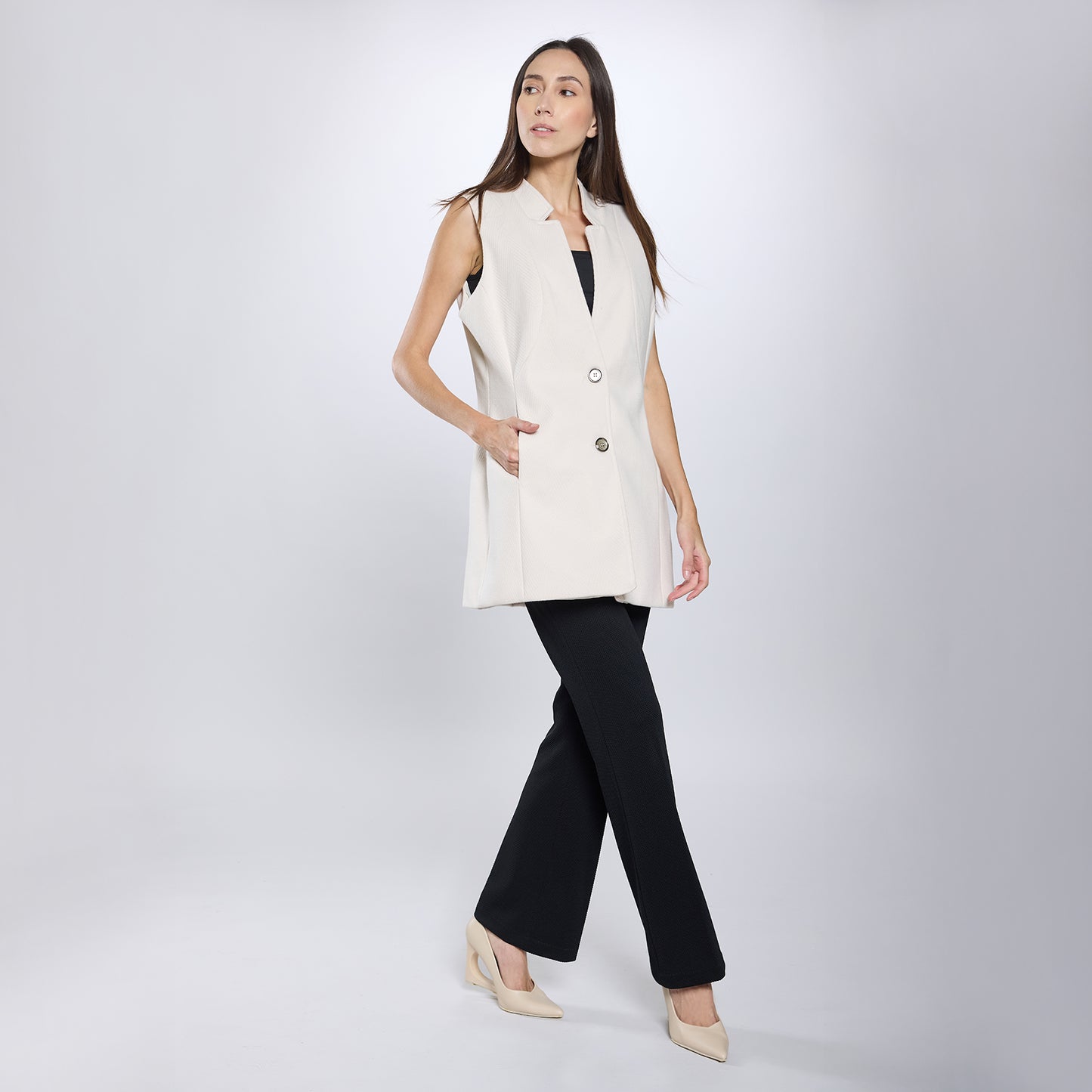Chaleco de cuello mao y escote en V. Cierre frontal de doble botón.