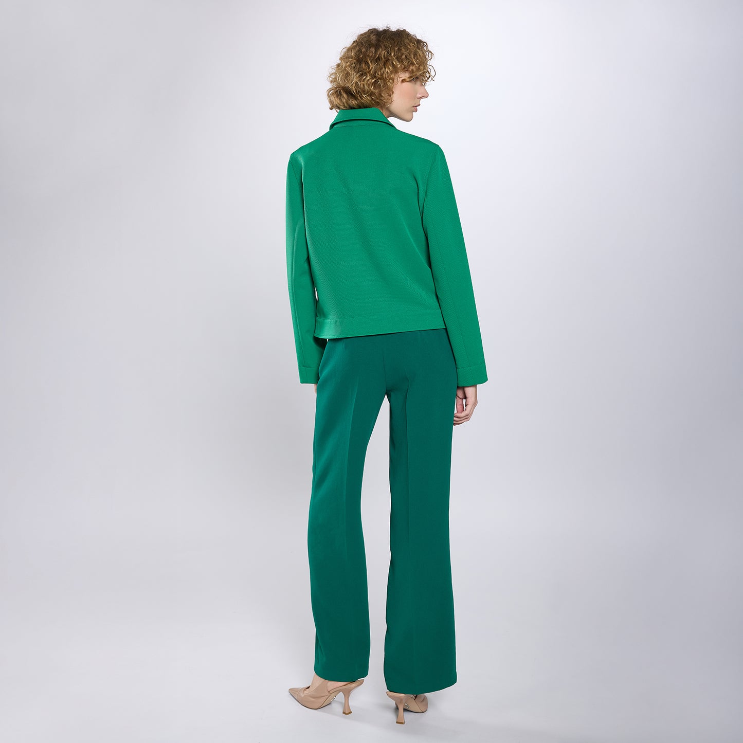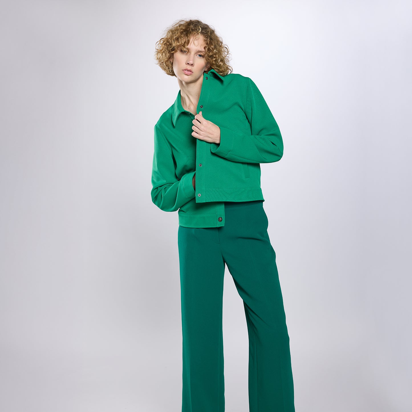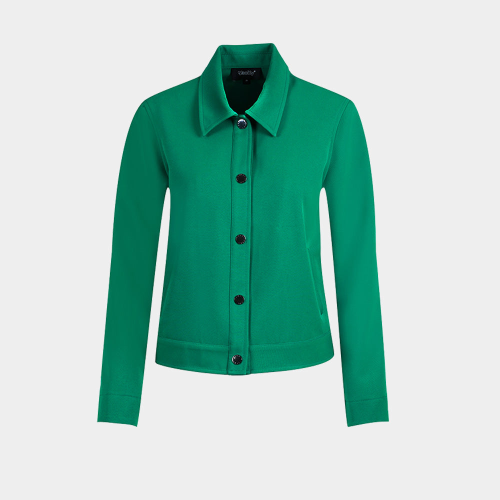 Chamarra con dos bolsillos laterales y cinco botones en tono plata al frente.