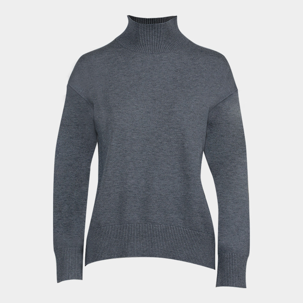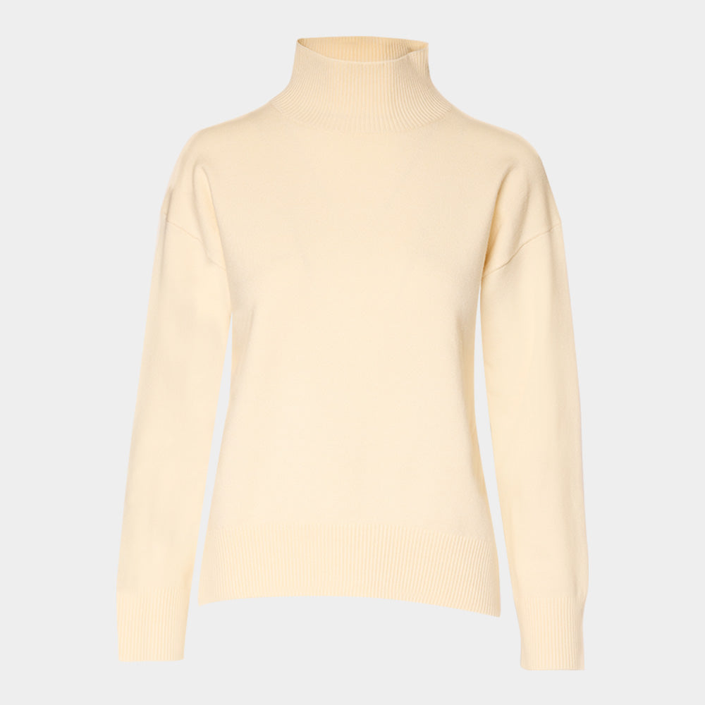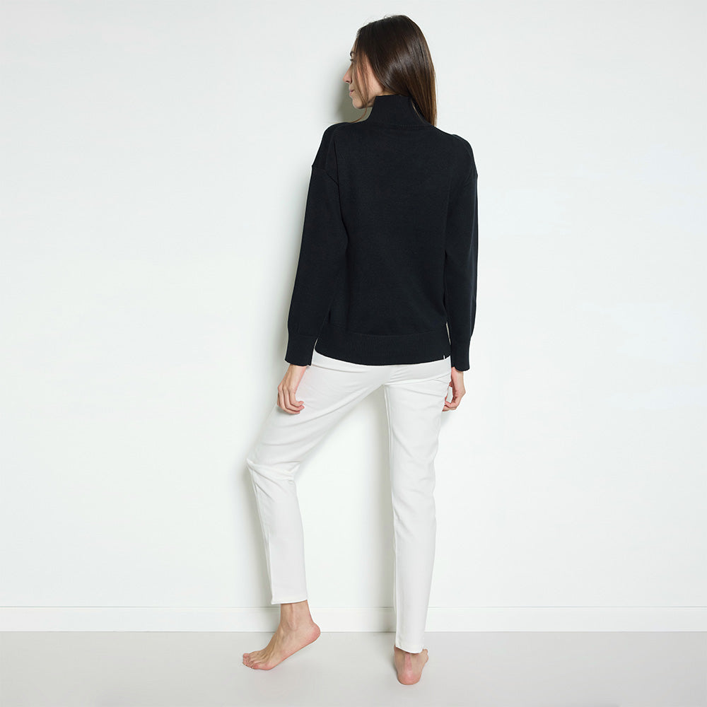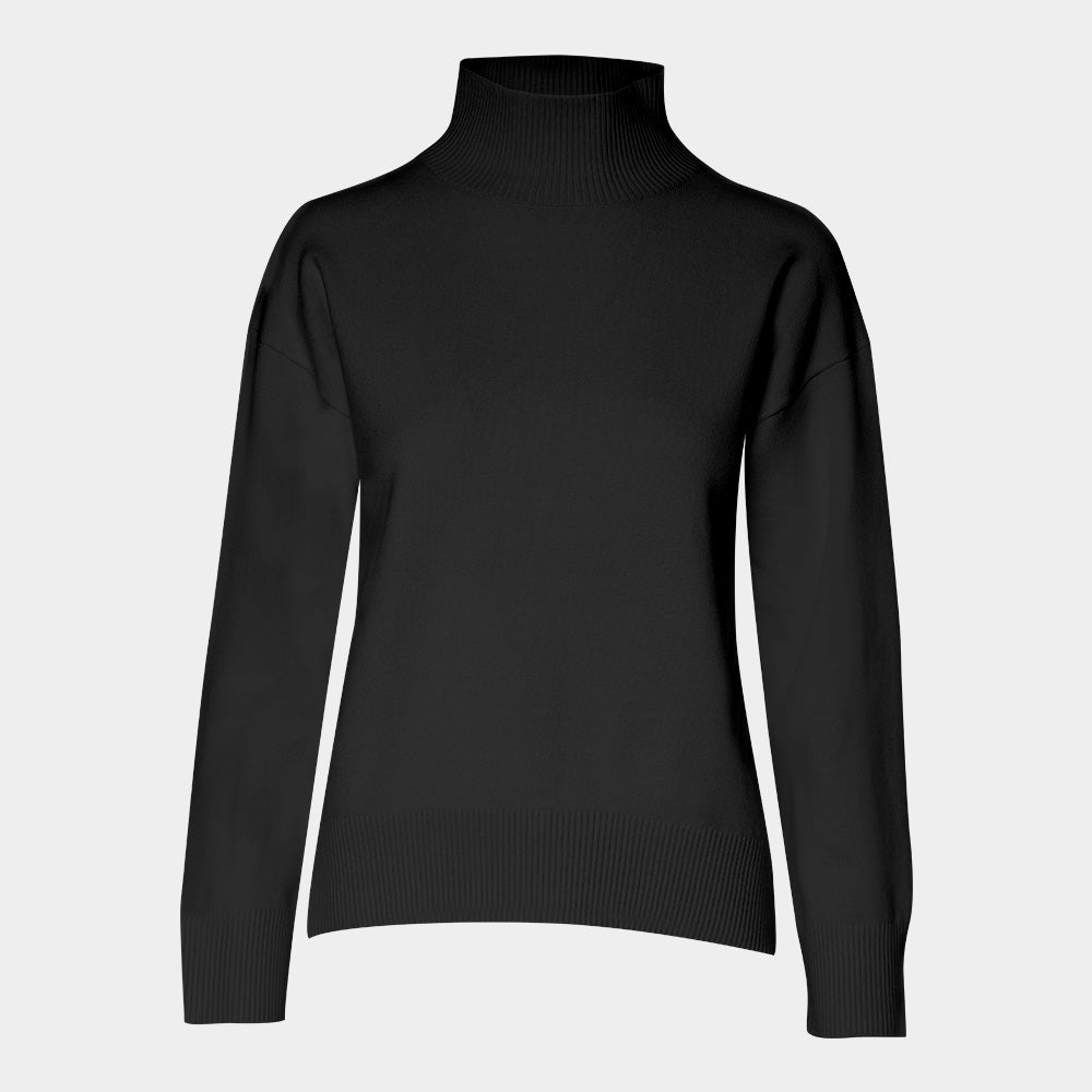Suéter tejido de punto de cuello alto, cerrado, manga larga caída y puño tejido.