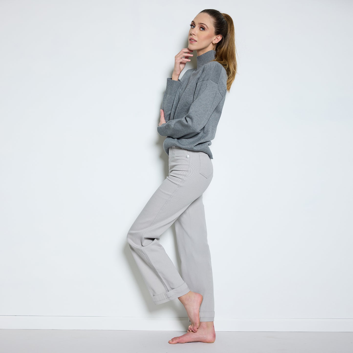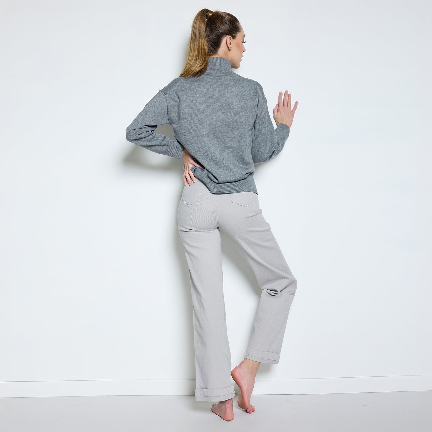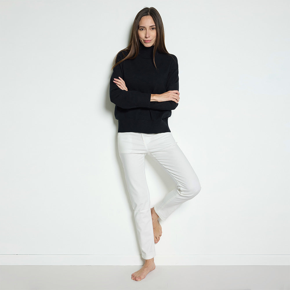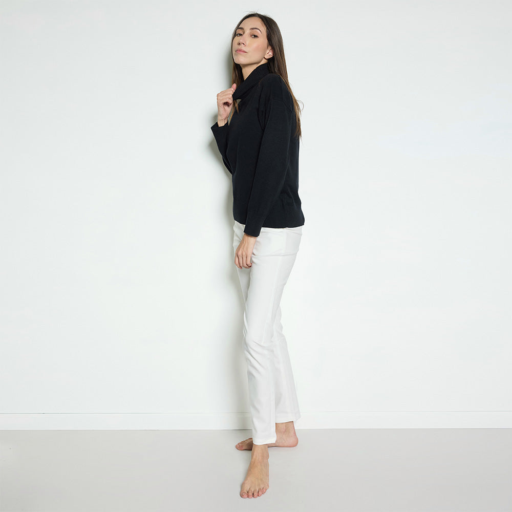Suéter tejido de punto de cuello alto, cerrado, manga larga caída y puño tejido.