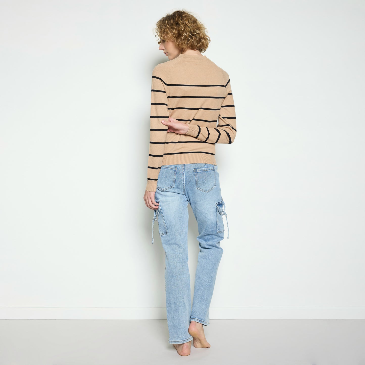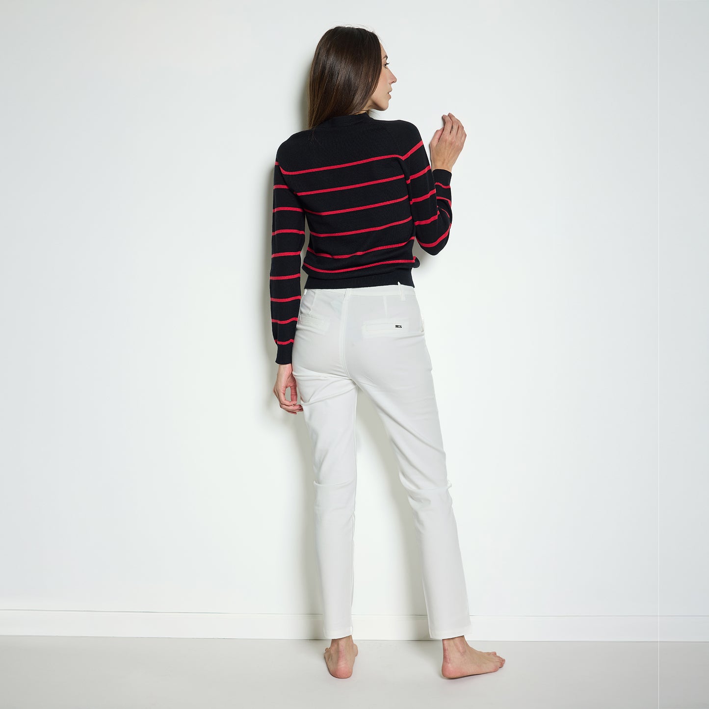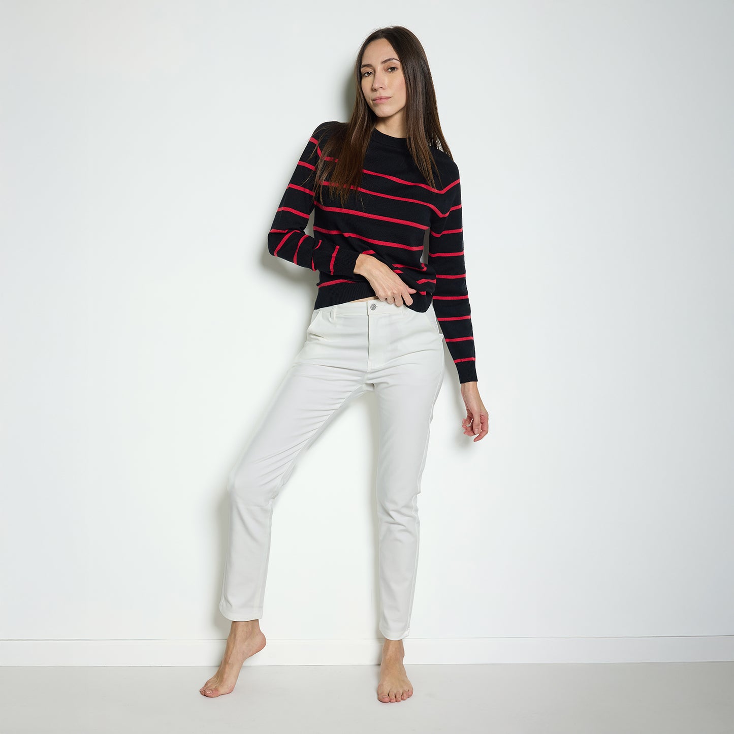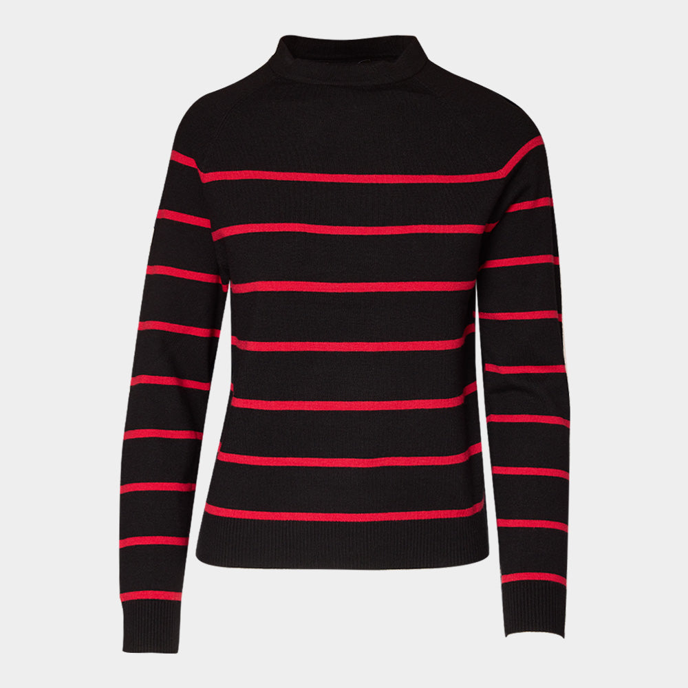 Suéter tejido de punto, cerrado rayado en contraste de cuello redondo y manga larga con puño tejido.