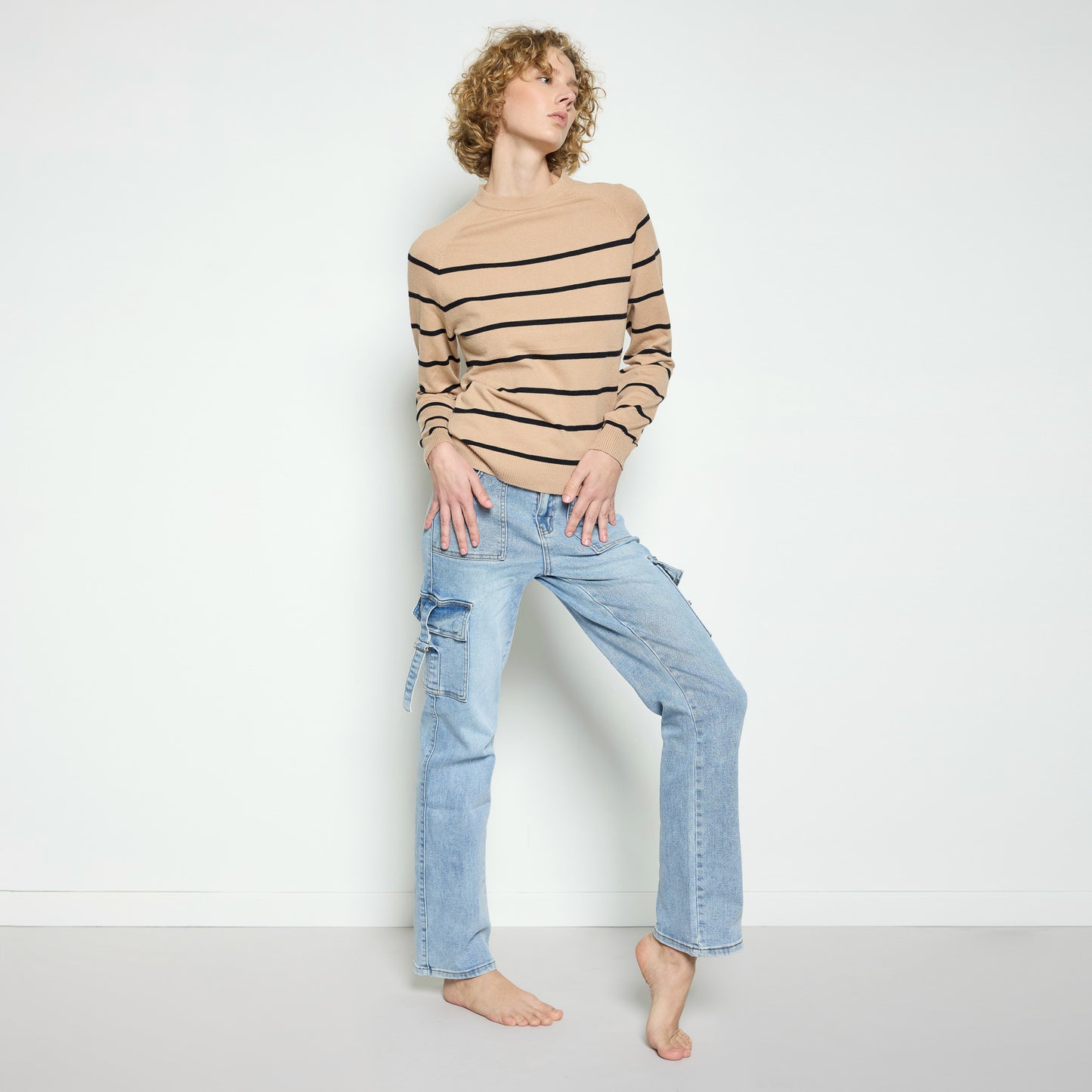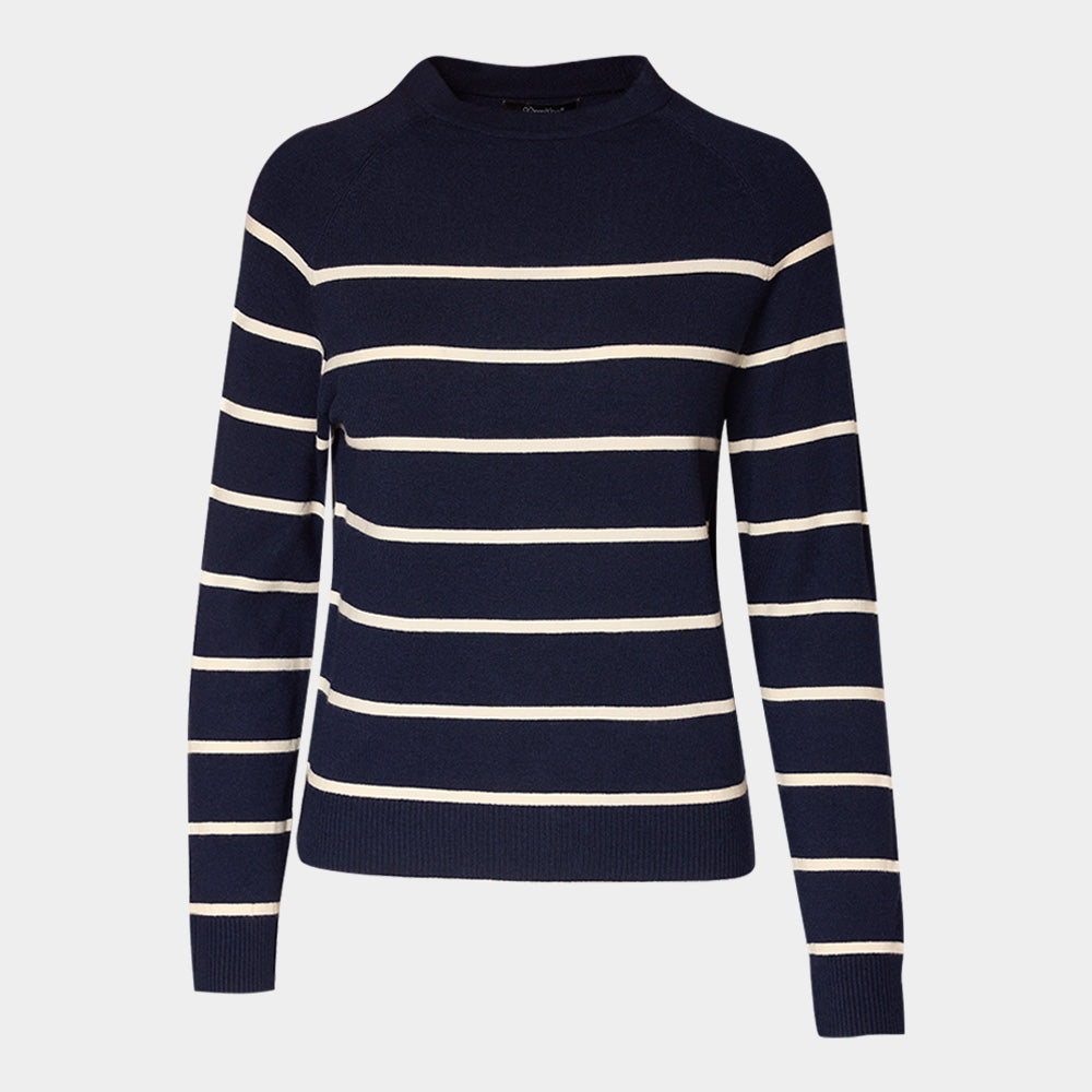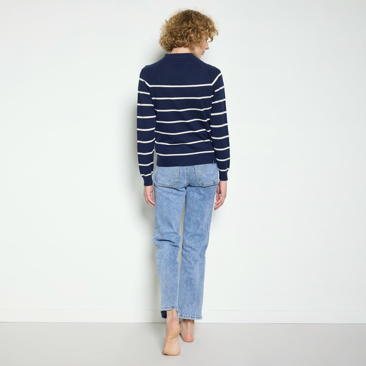 Suéter tejido de punto, cerrado rayado en contraste de cuello redondo y manga larga con puño tejido.
