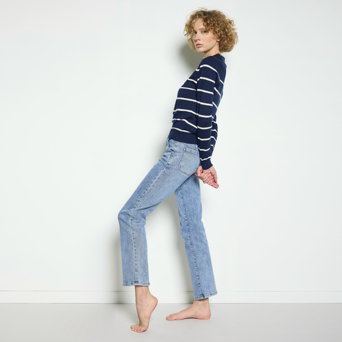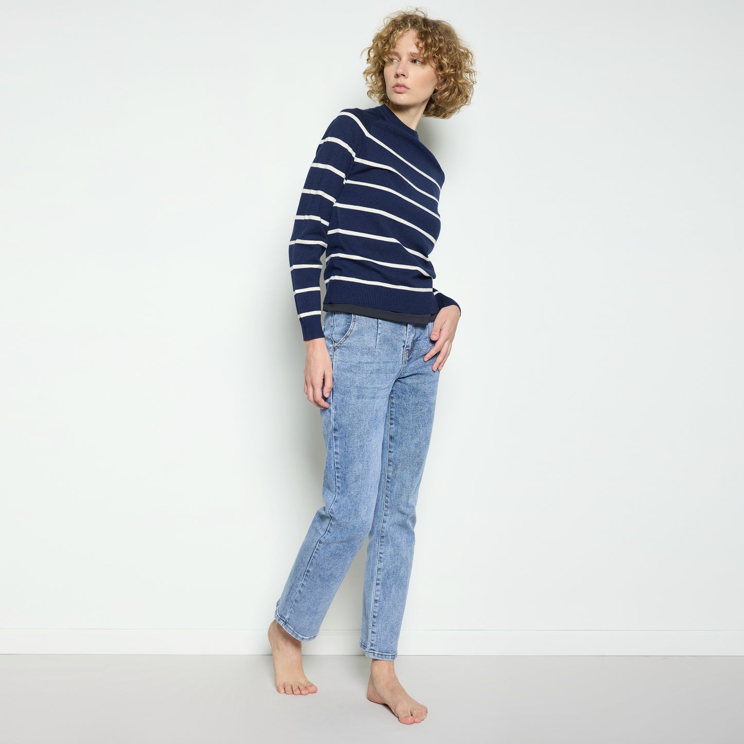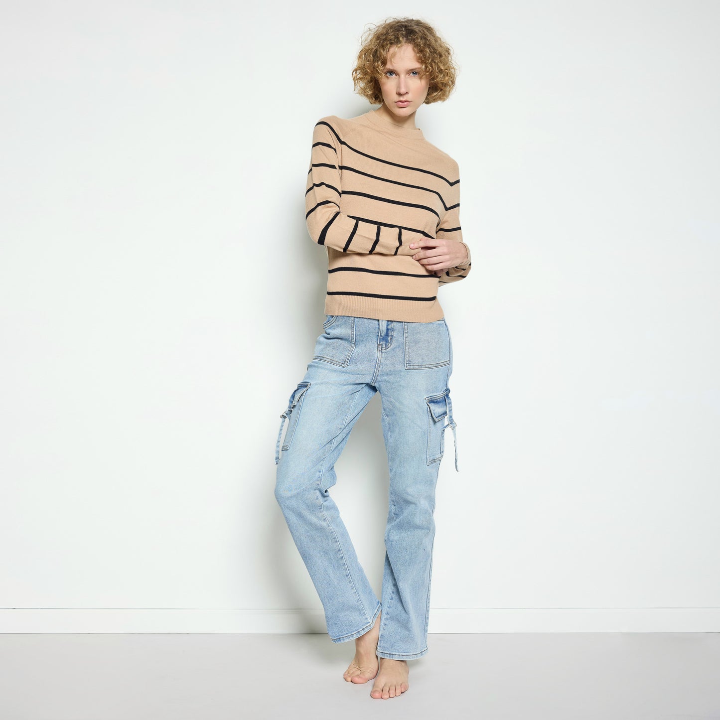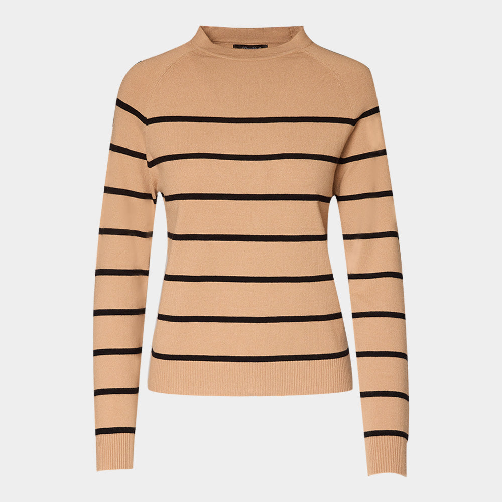 Suéter tejido de punto, cerrado rayado en contraste de cuello redondo y manga larga con puño tejido.