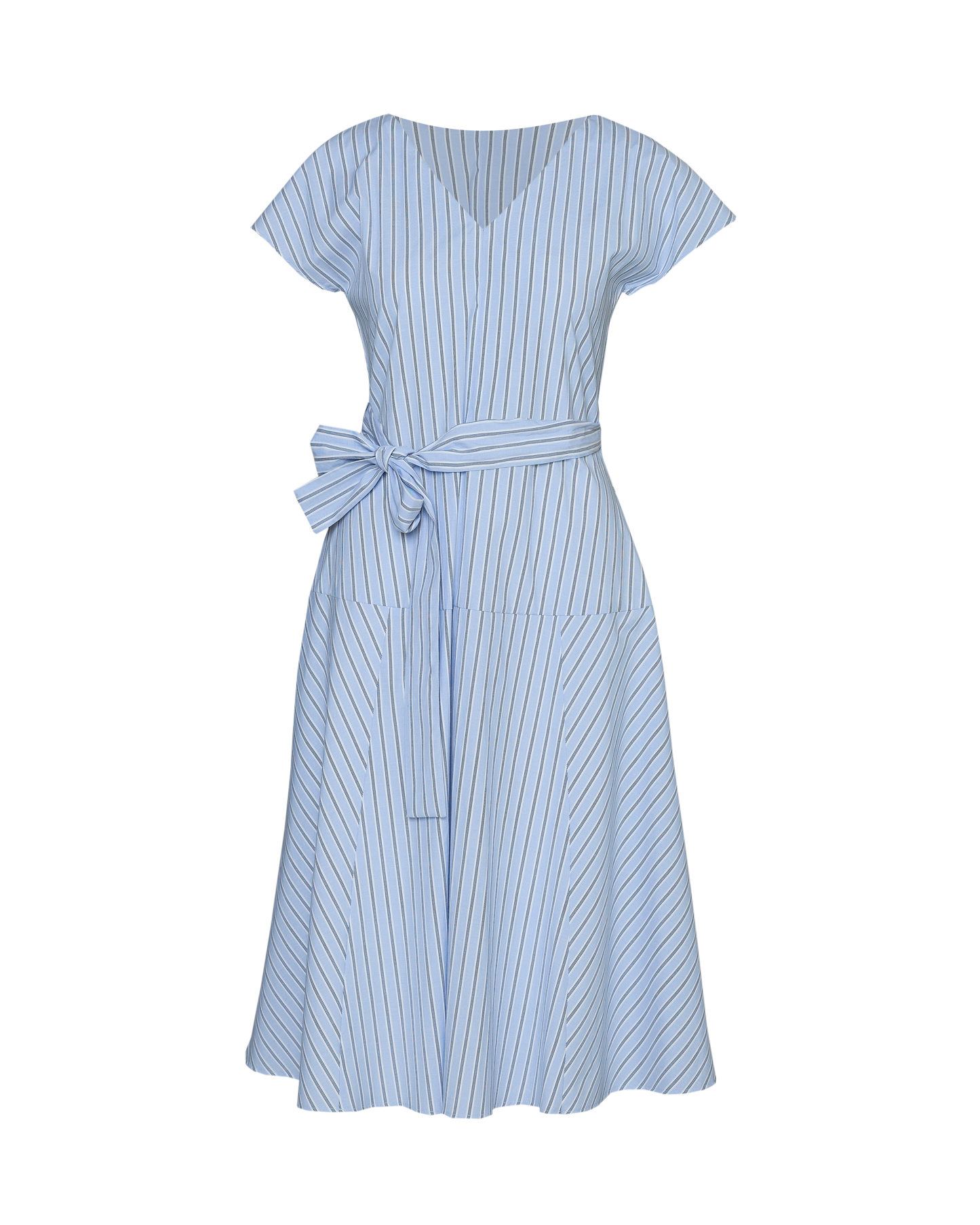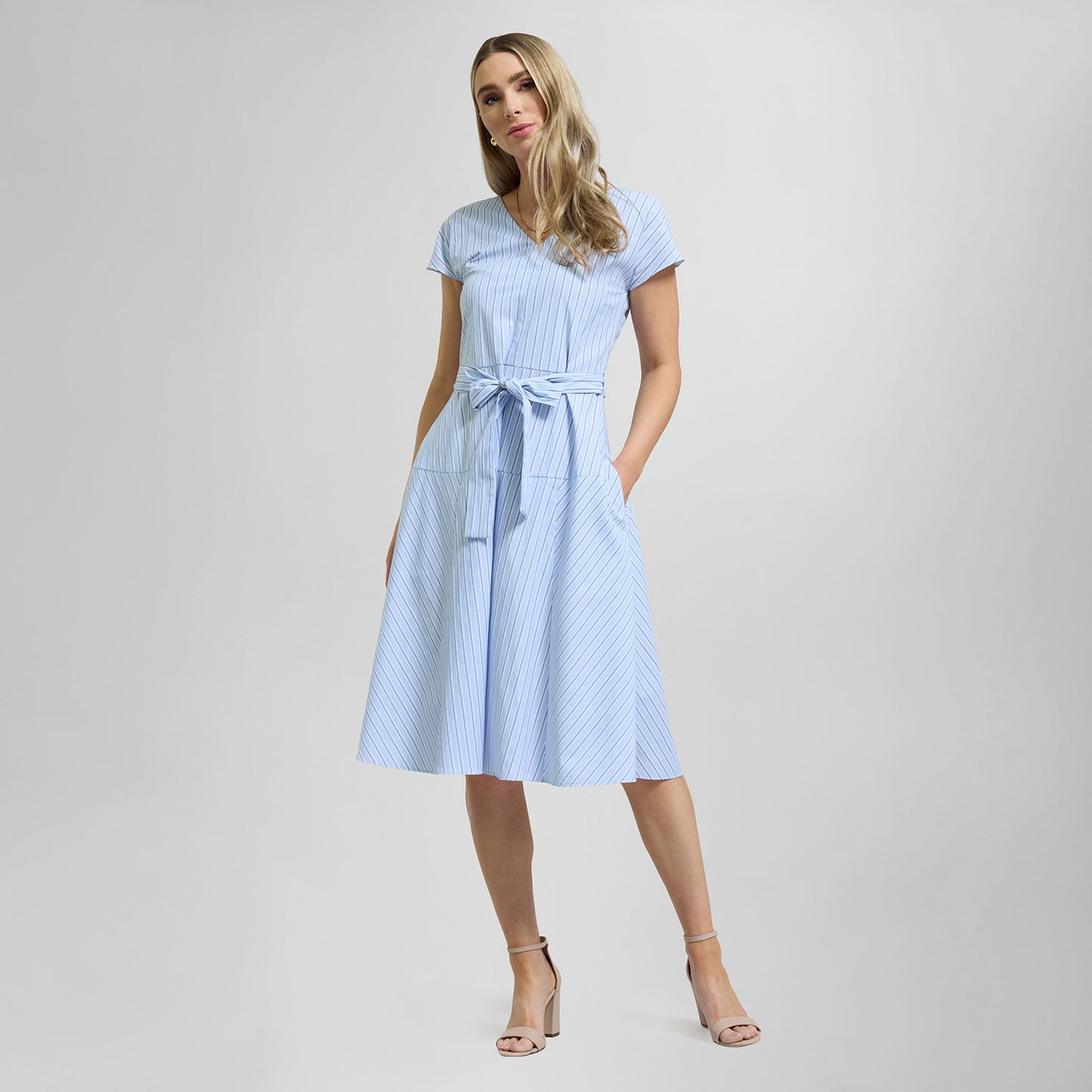 Vestido de manga corta a rayas, con escote en v y ziper en espalda, corte a la cintura con falda de silueta evasé y cinta de amarre a juego en cintura.