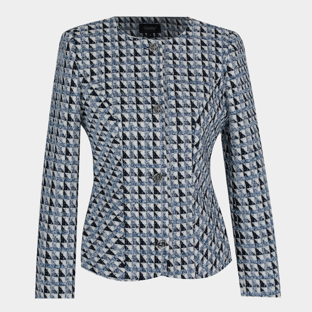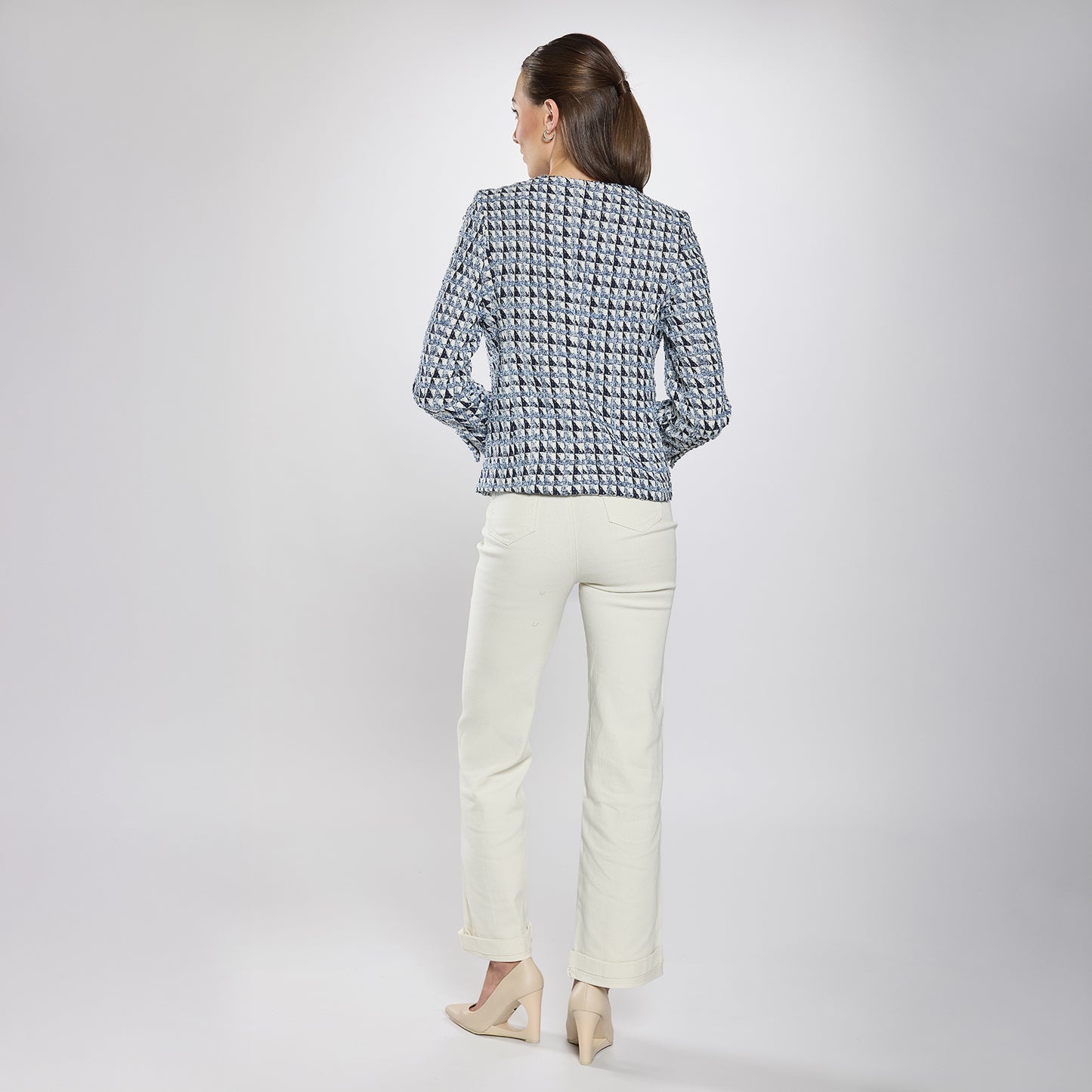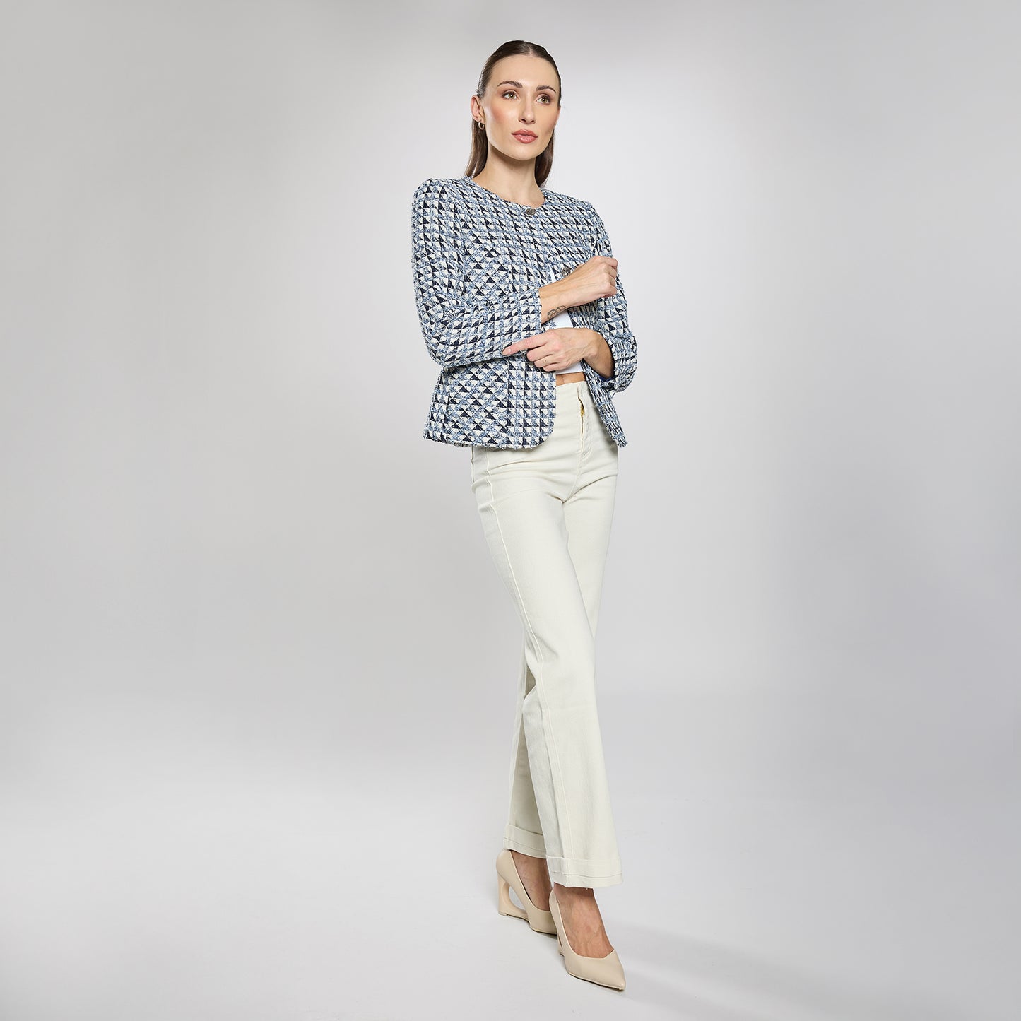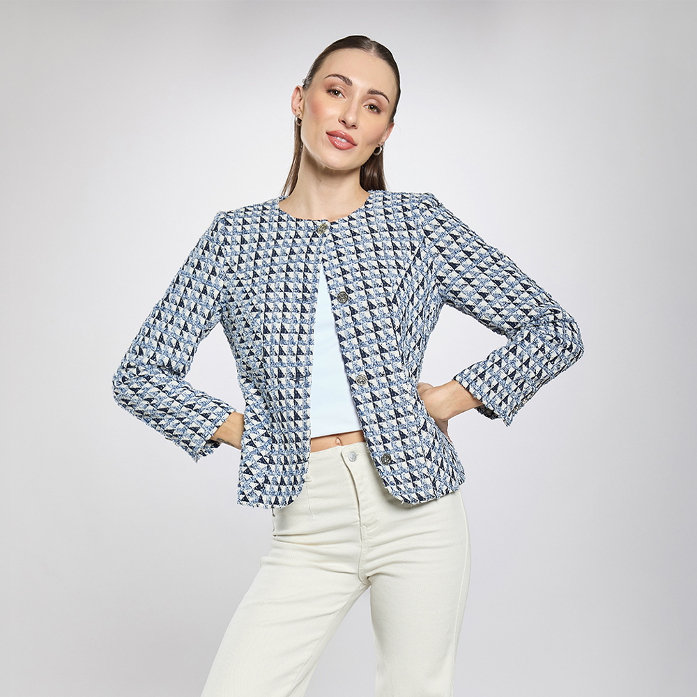 Blazer texturizado con estampado de cuadros, cuello redondo, cierre frontal con cuatro botones dorados, bolsillos laterales y mangas largas con acabado de tres botones a juego.
