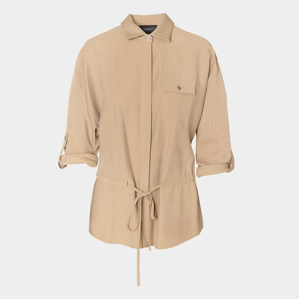 Blazer holgado con cuello regular de estilo camisa, con un botón en el centro, seis botones ocultos, un bolsillo frontal con solapa básica con botón, hombro caído, manga holgada con sardineta y un botón