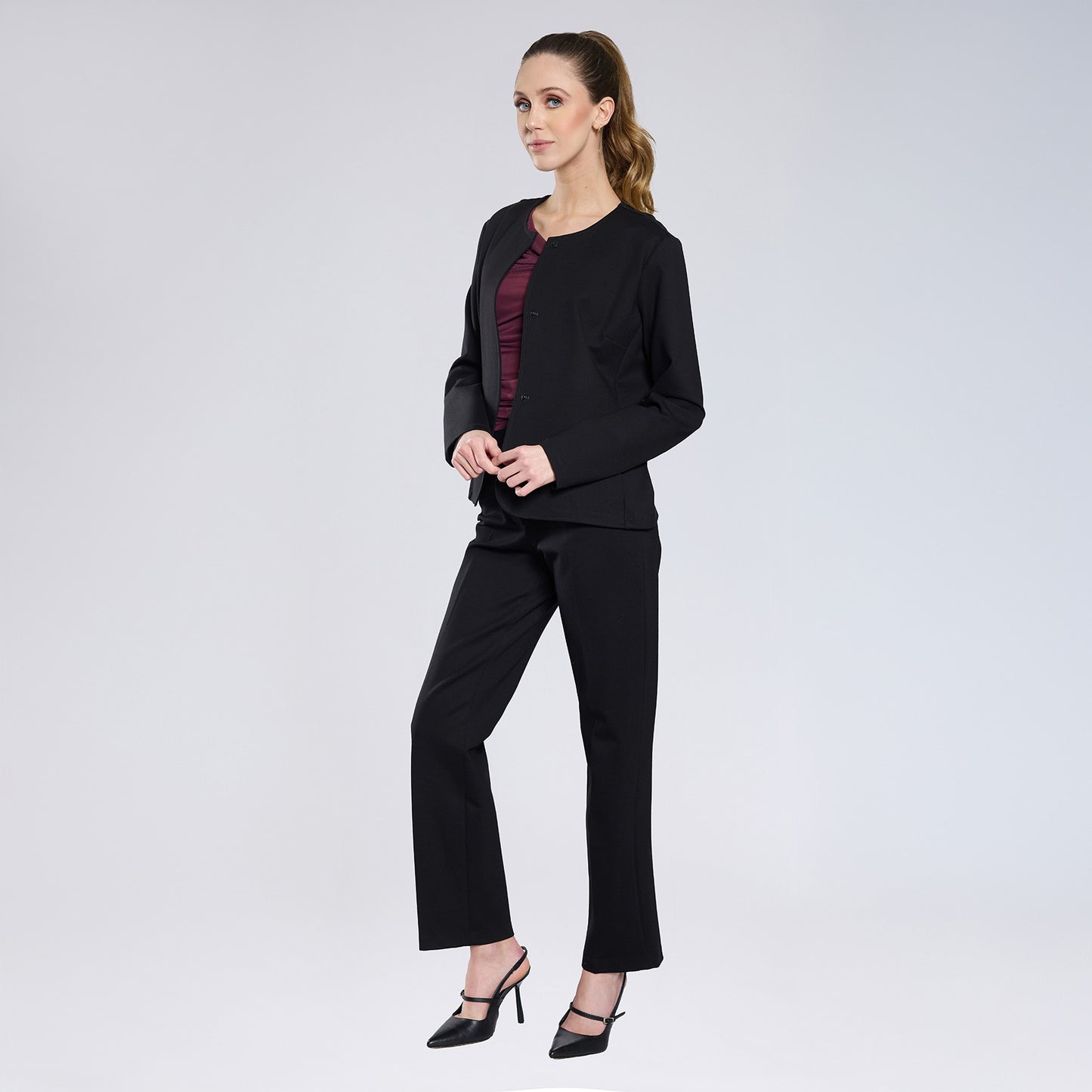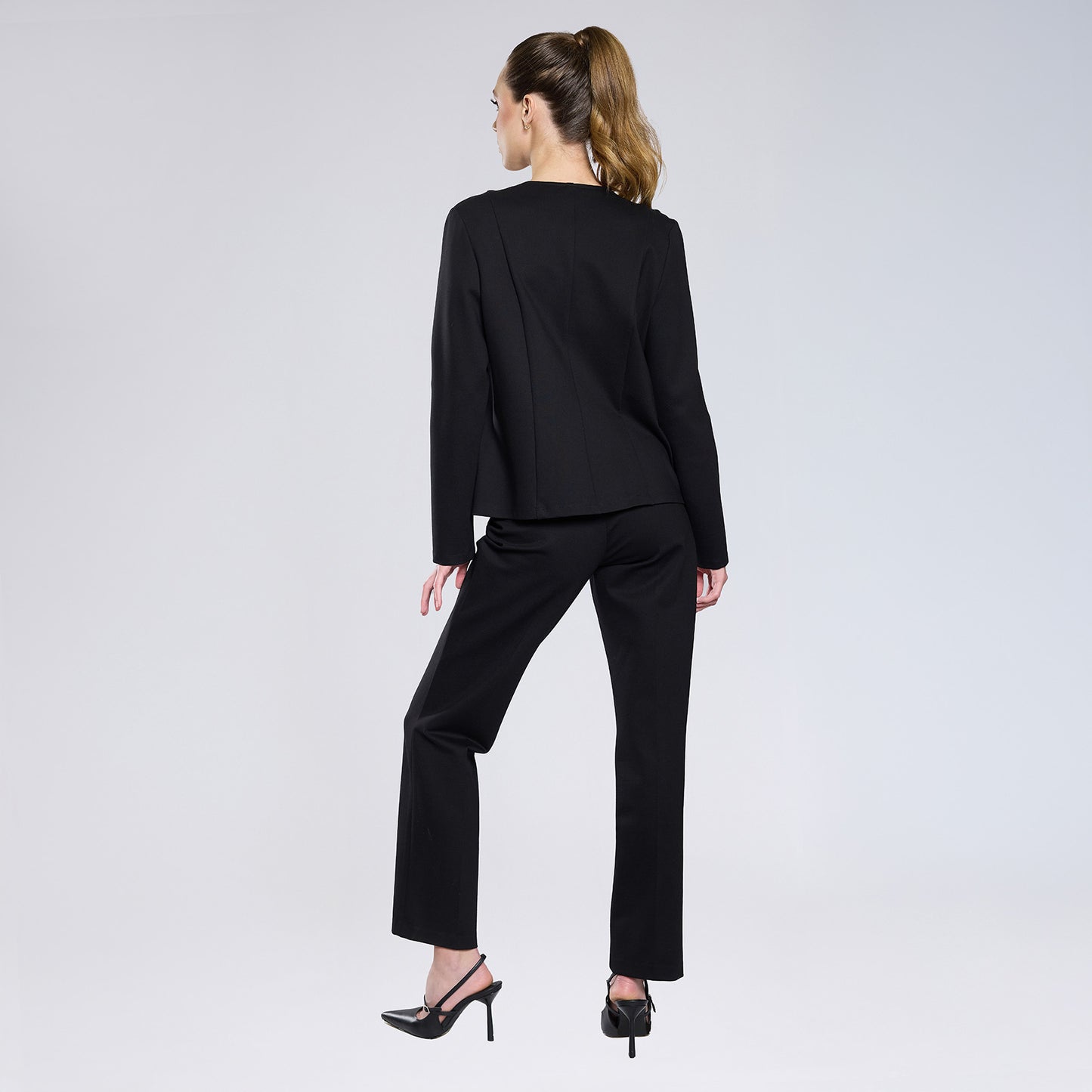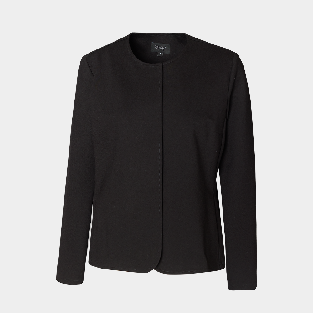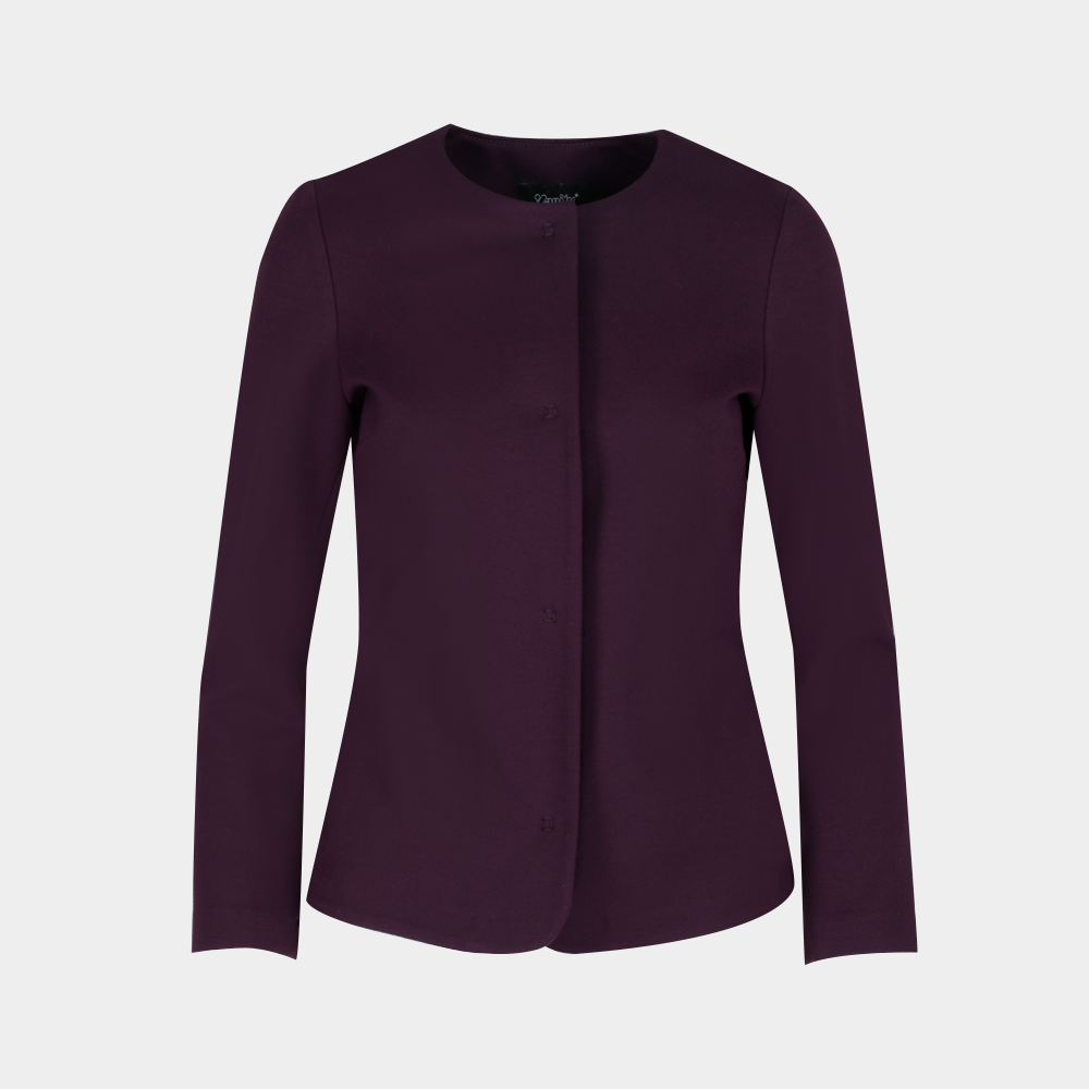 Blazer de cuello redondo, sin solapa, con cuatro broches ocultos de presión para cierre, manga larga con dobladillo, dos bolsillos laterales ocultos y costuras traseras que estilizan la figura.