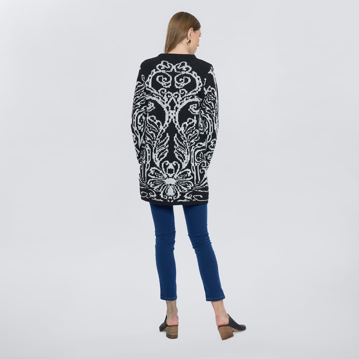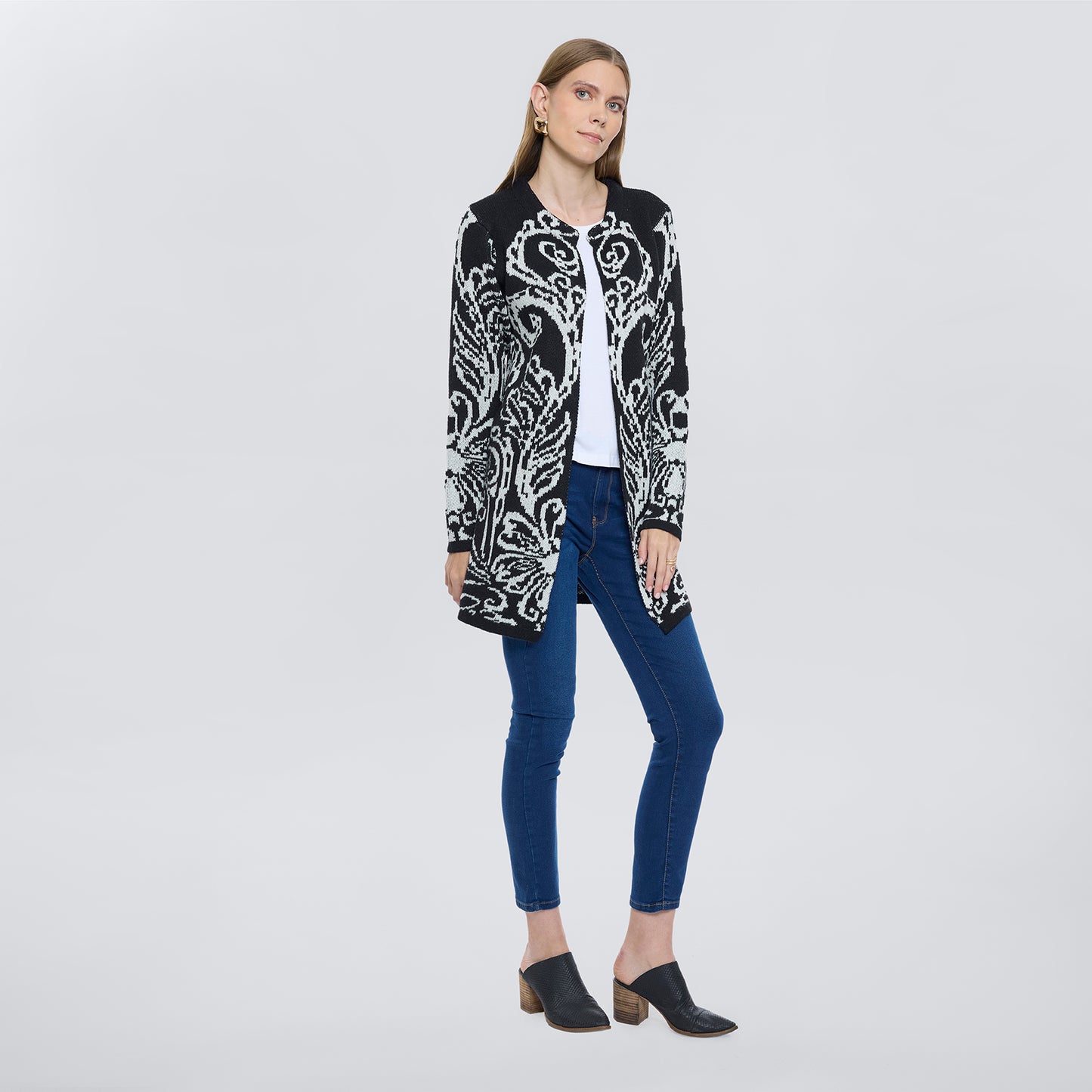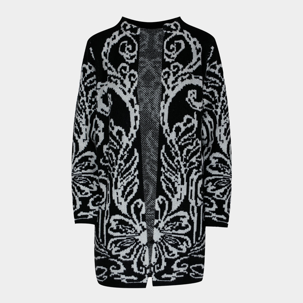 Suéter largo abierto en estampado paisley y manga larga.