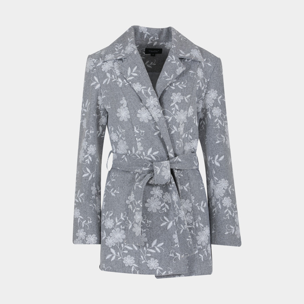 Abrigo con cuello tipo notched, cinturón de amarre a tono, confeccionado en una tela suave con print de flores.