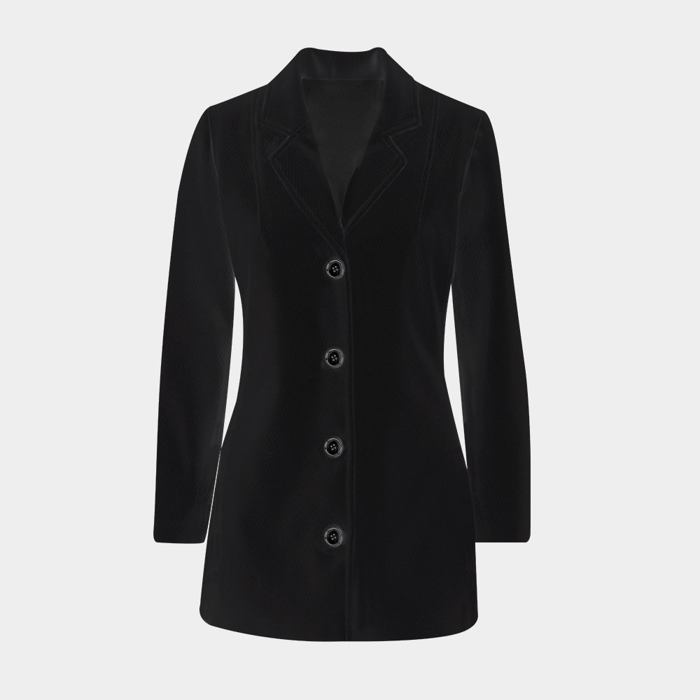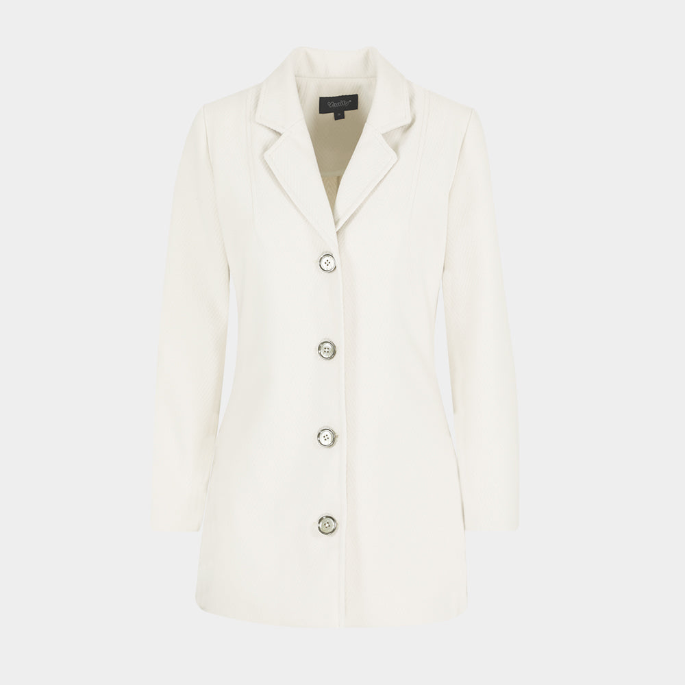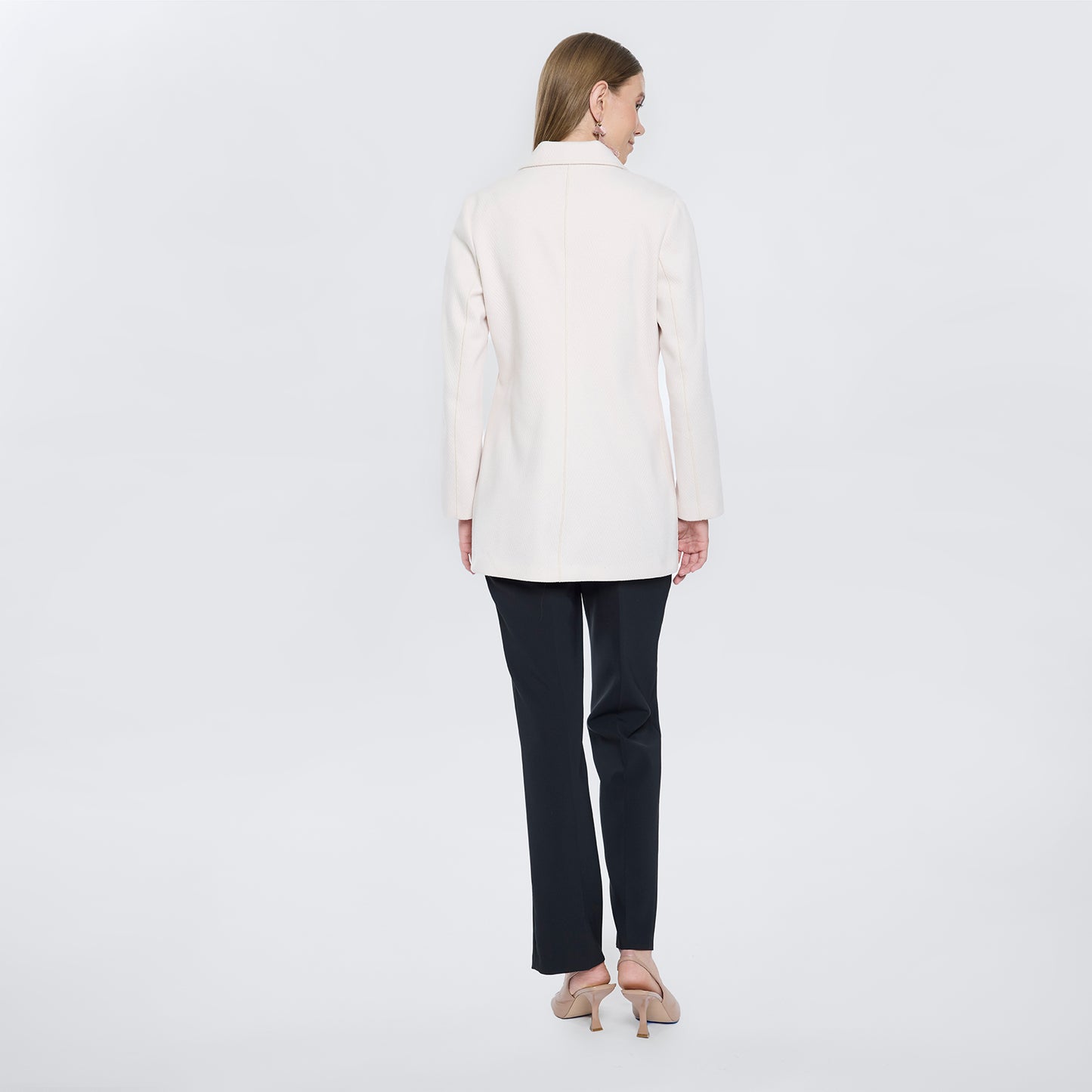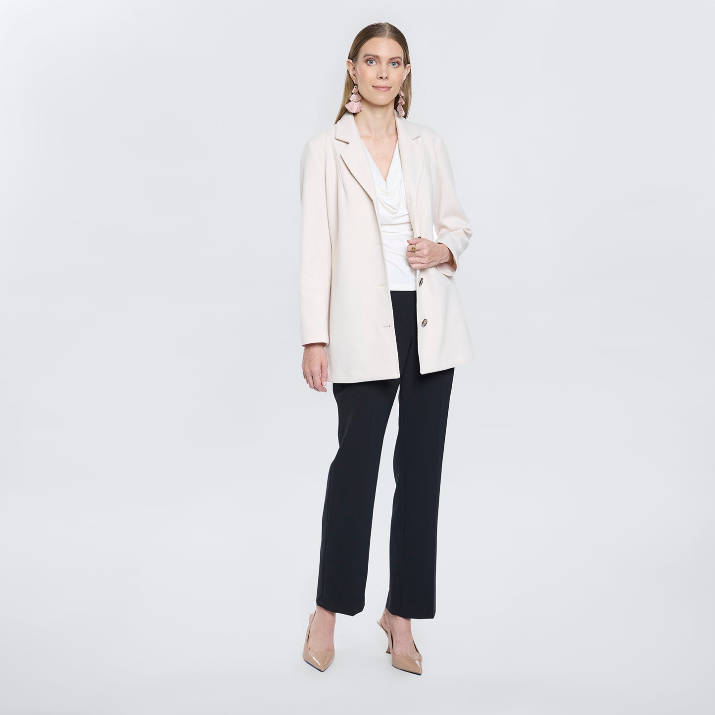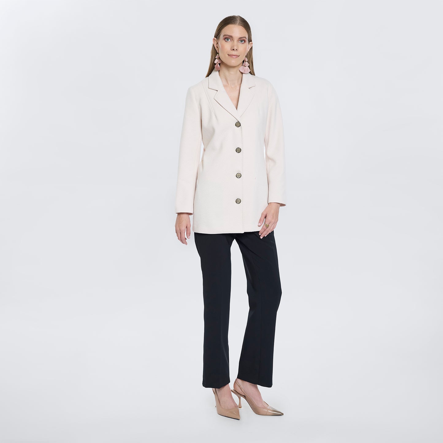 Abrigo con largo al muslo, cuello con solapa estilo notched, cuatro botones metálicos, manga larga, confeccionado en una tela suave.