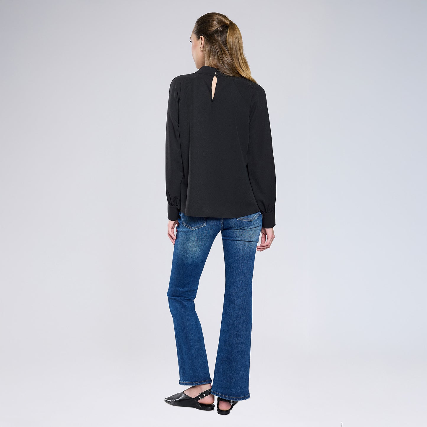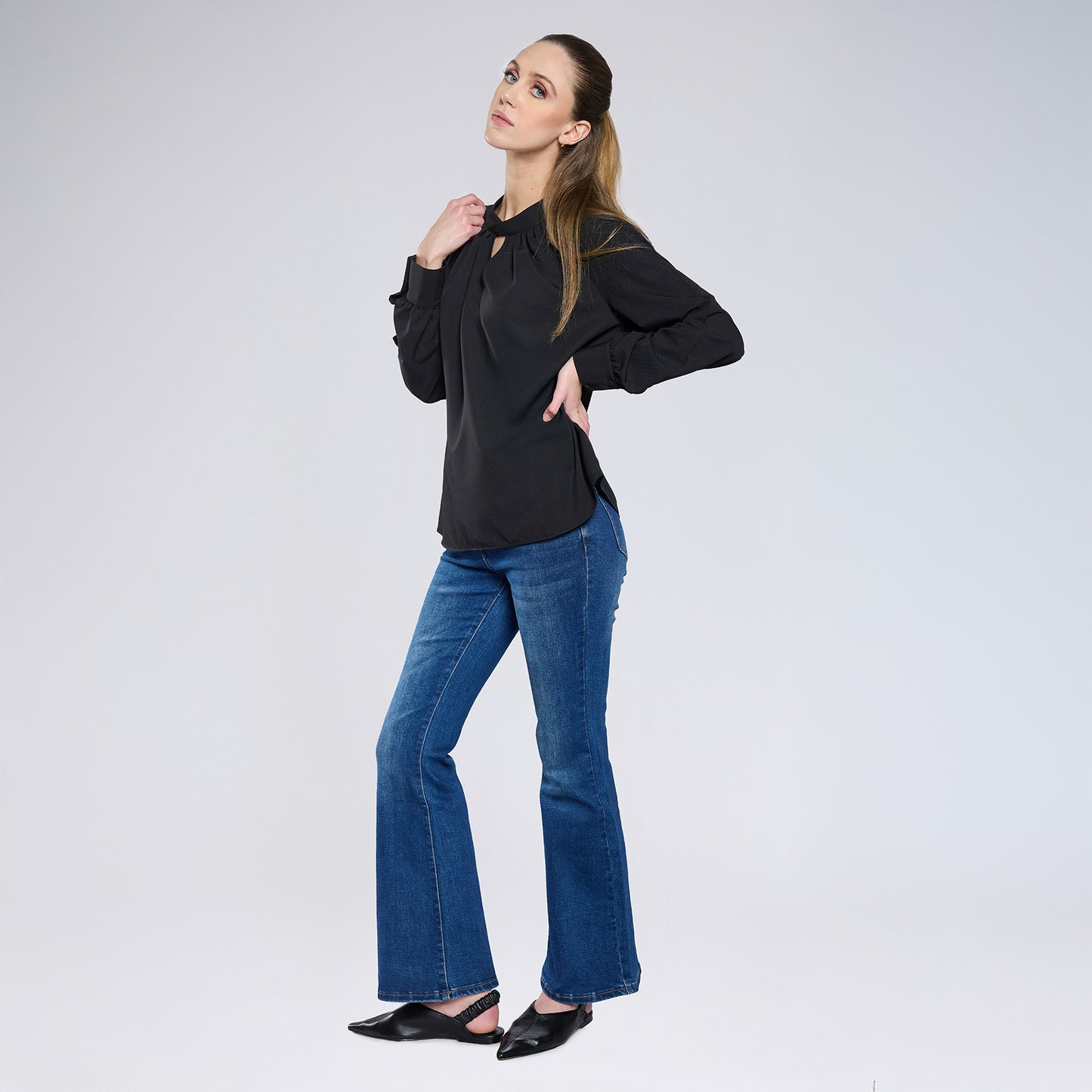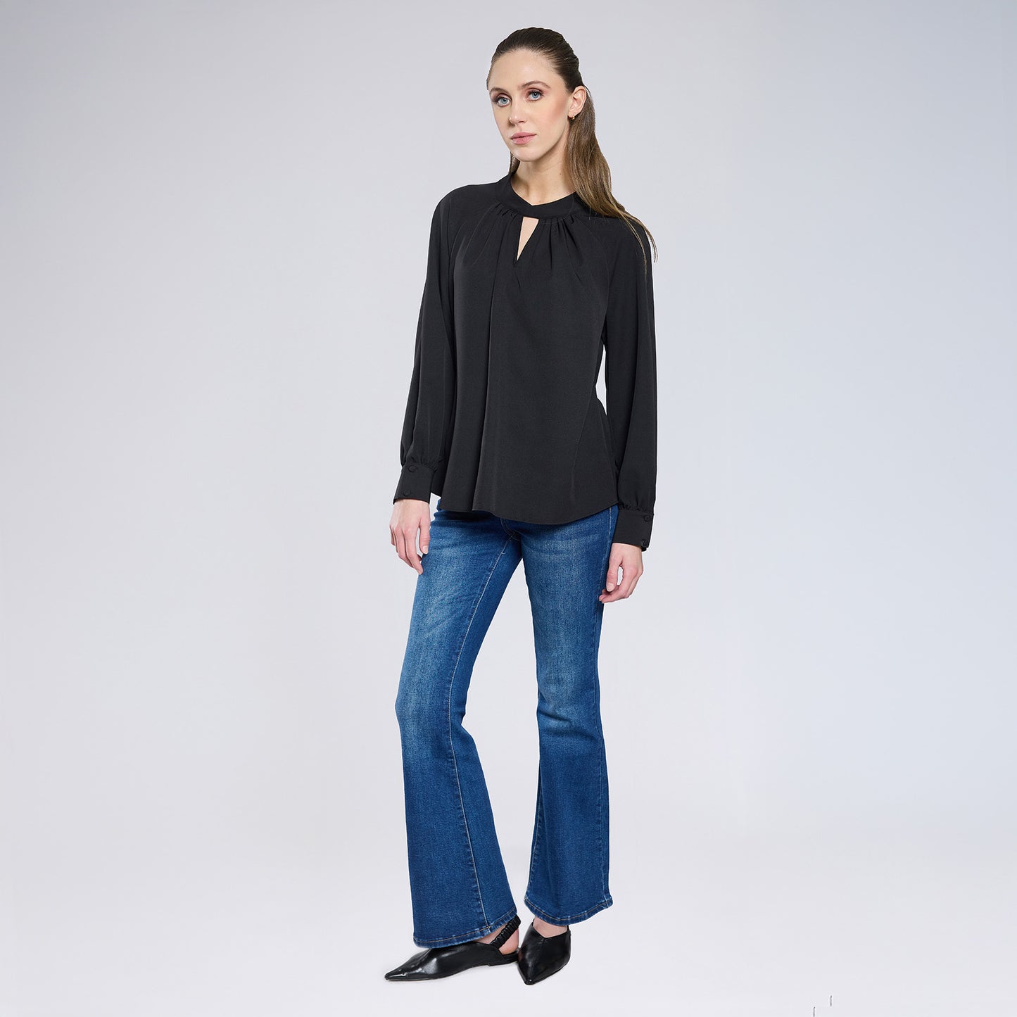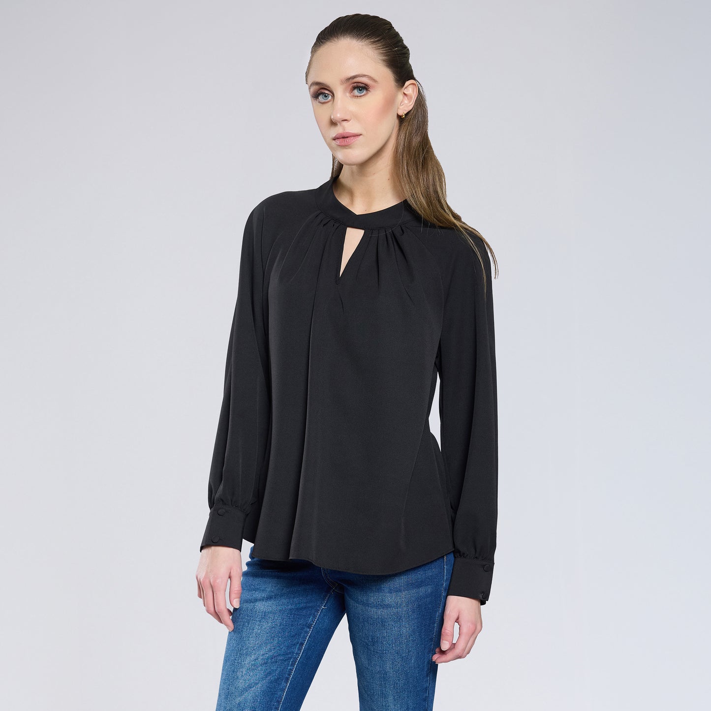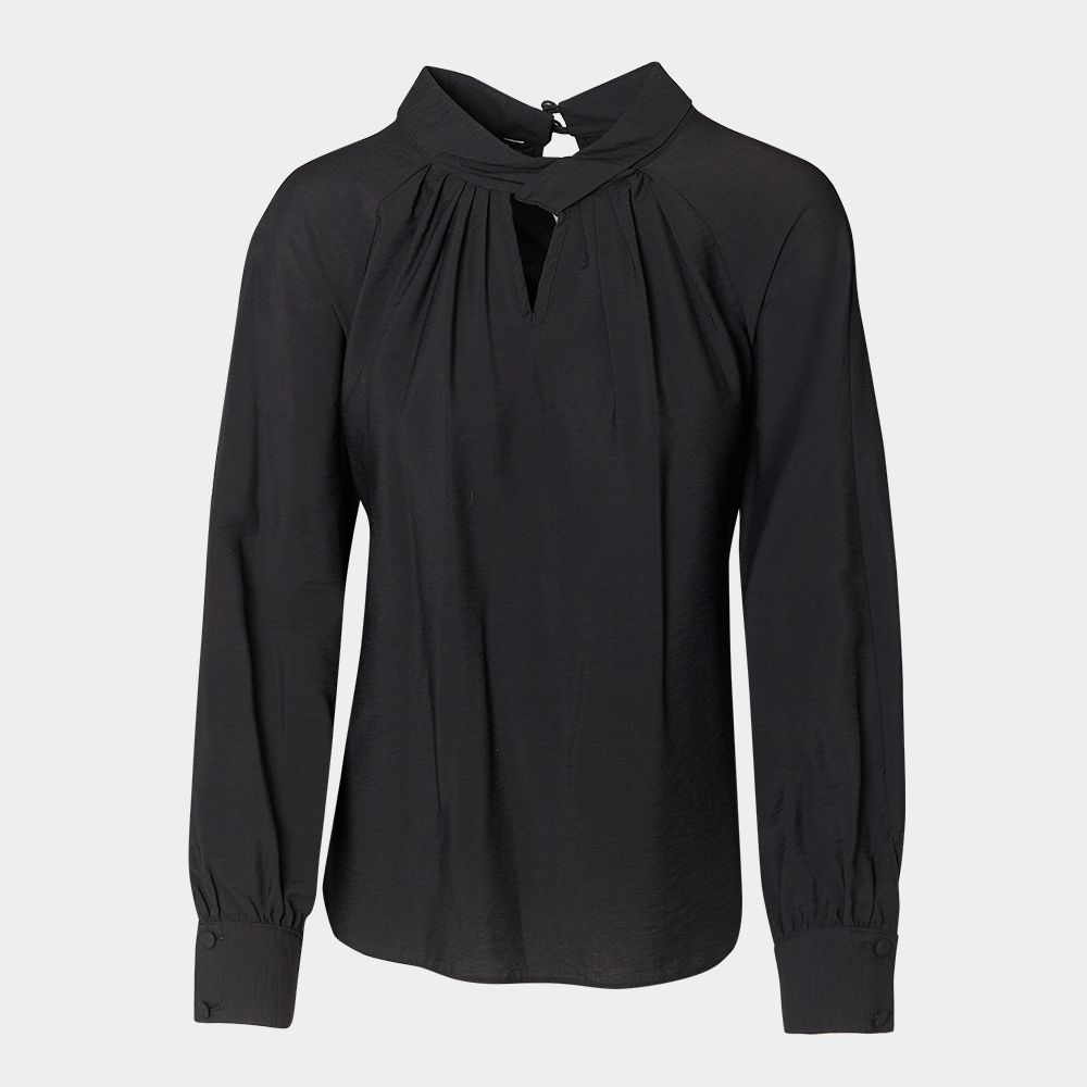 Blusa con cuello en V, detalle tipo dobladillo y drapeado, manga larga con pliegues tipo bouffant terminado en resorte y escote tipo keyhole en espalda