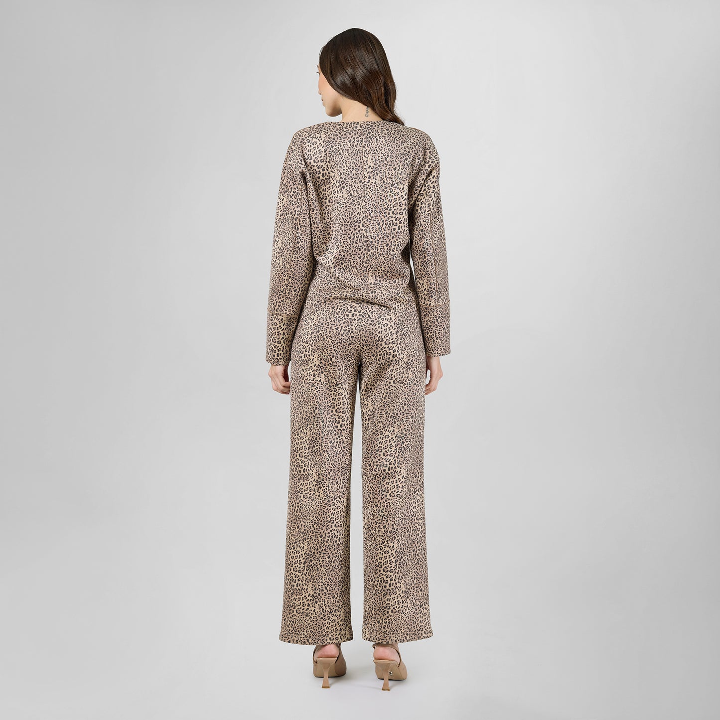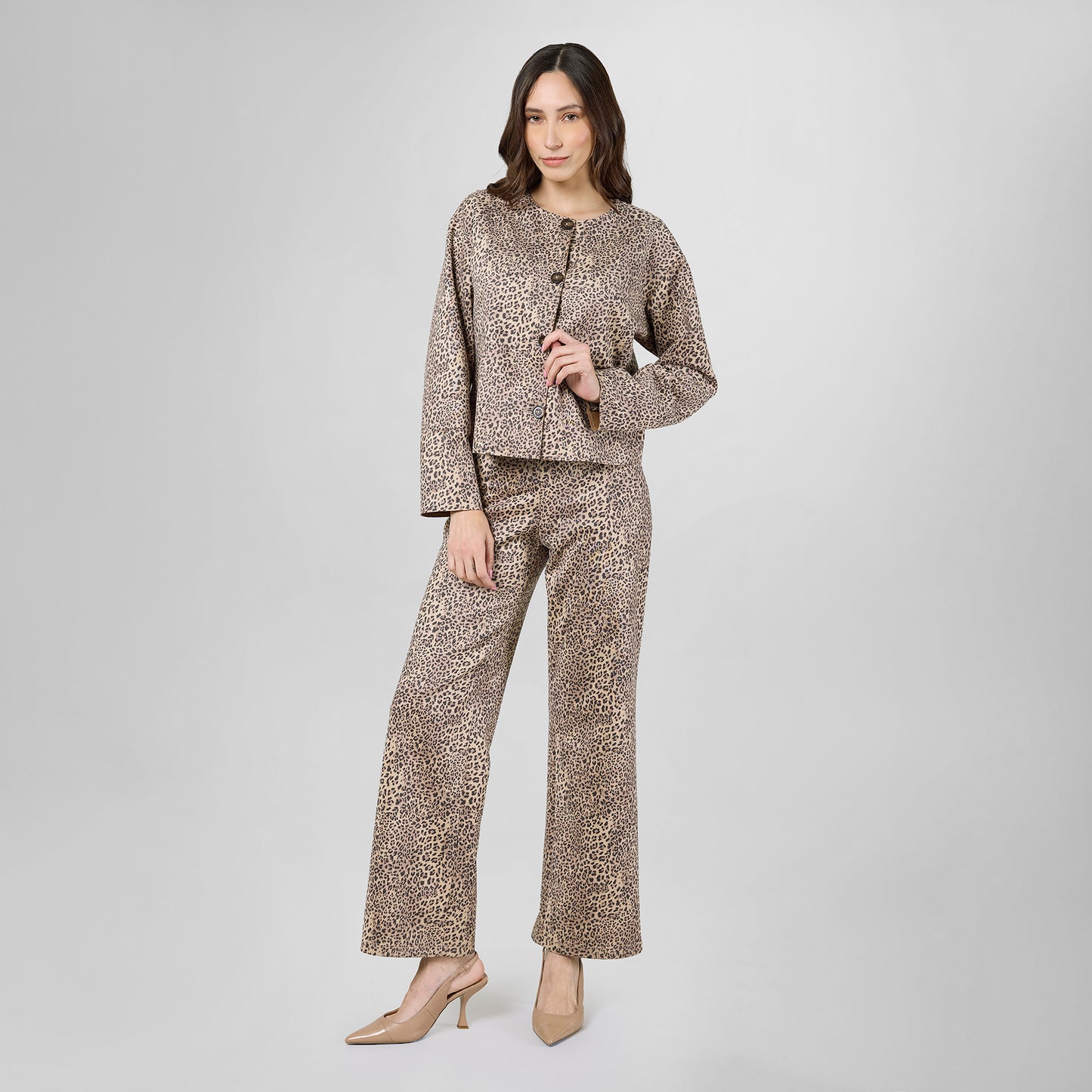 Chamarra oversize en animal print, cuello redondo y manga larga. Cierre de cuatro botones al frente, acabado afelpado suave.