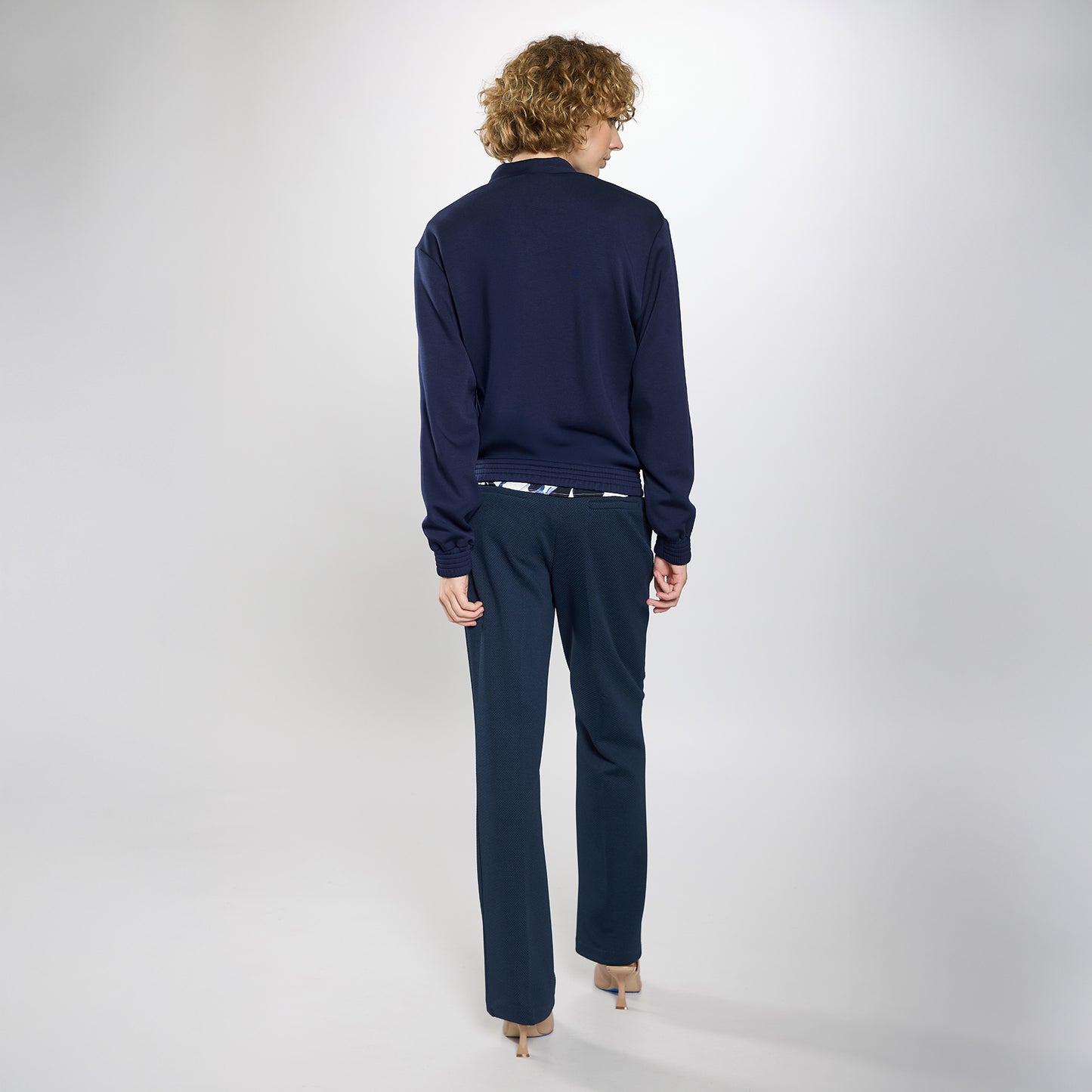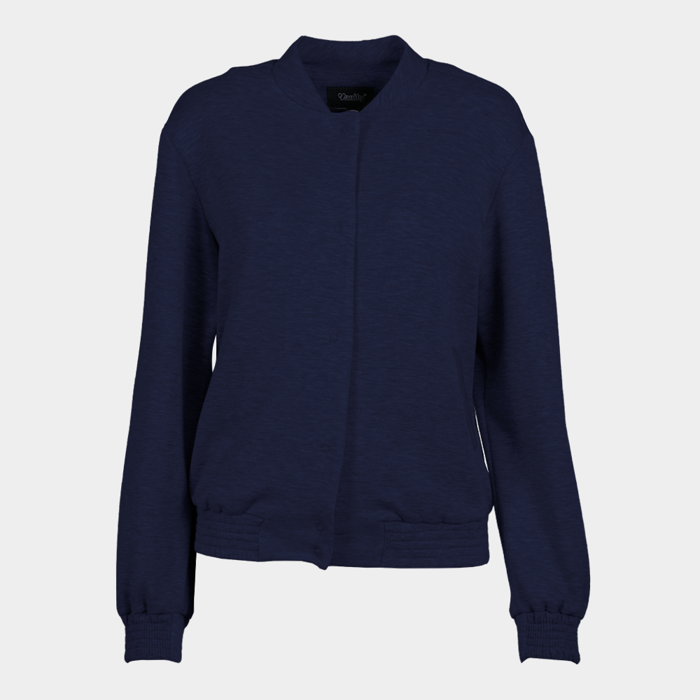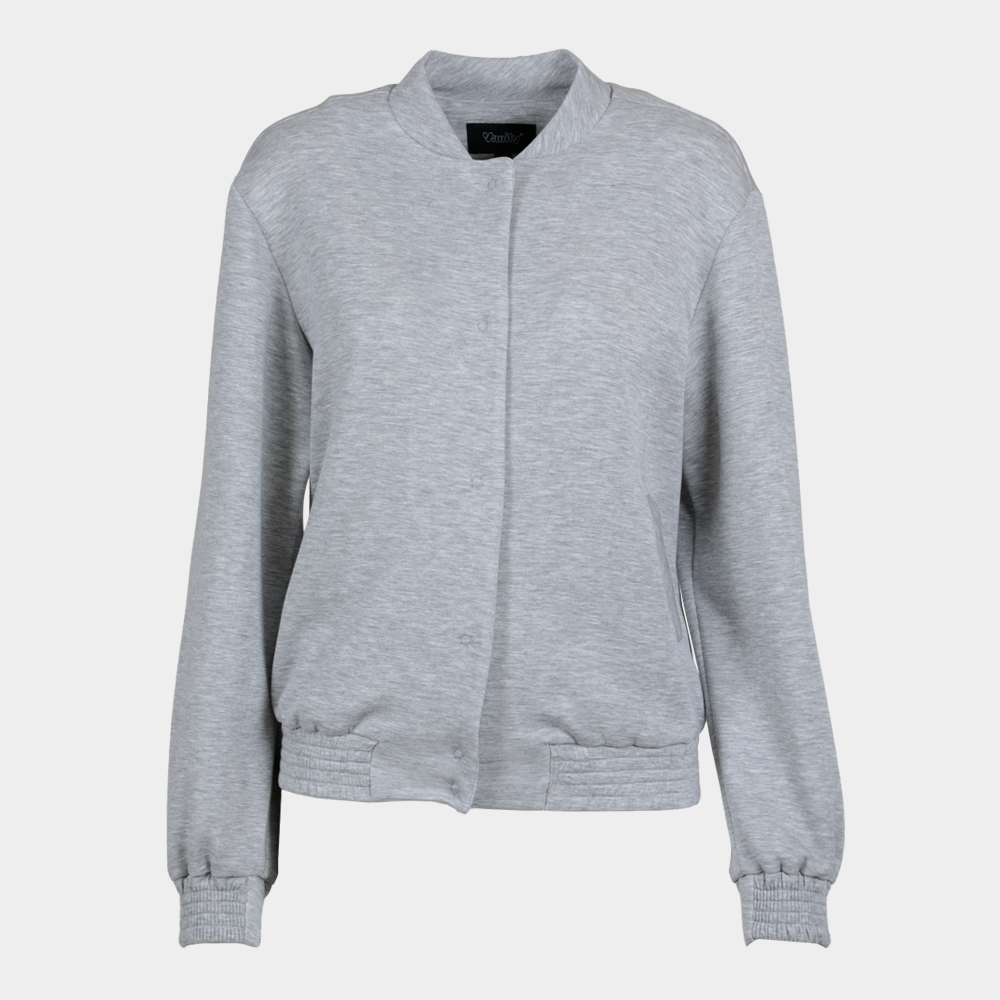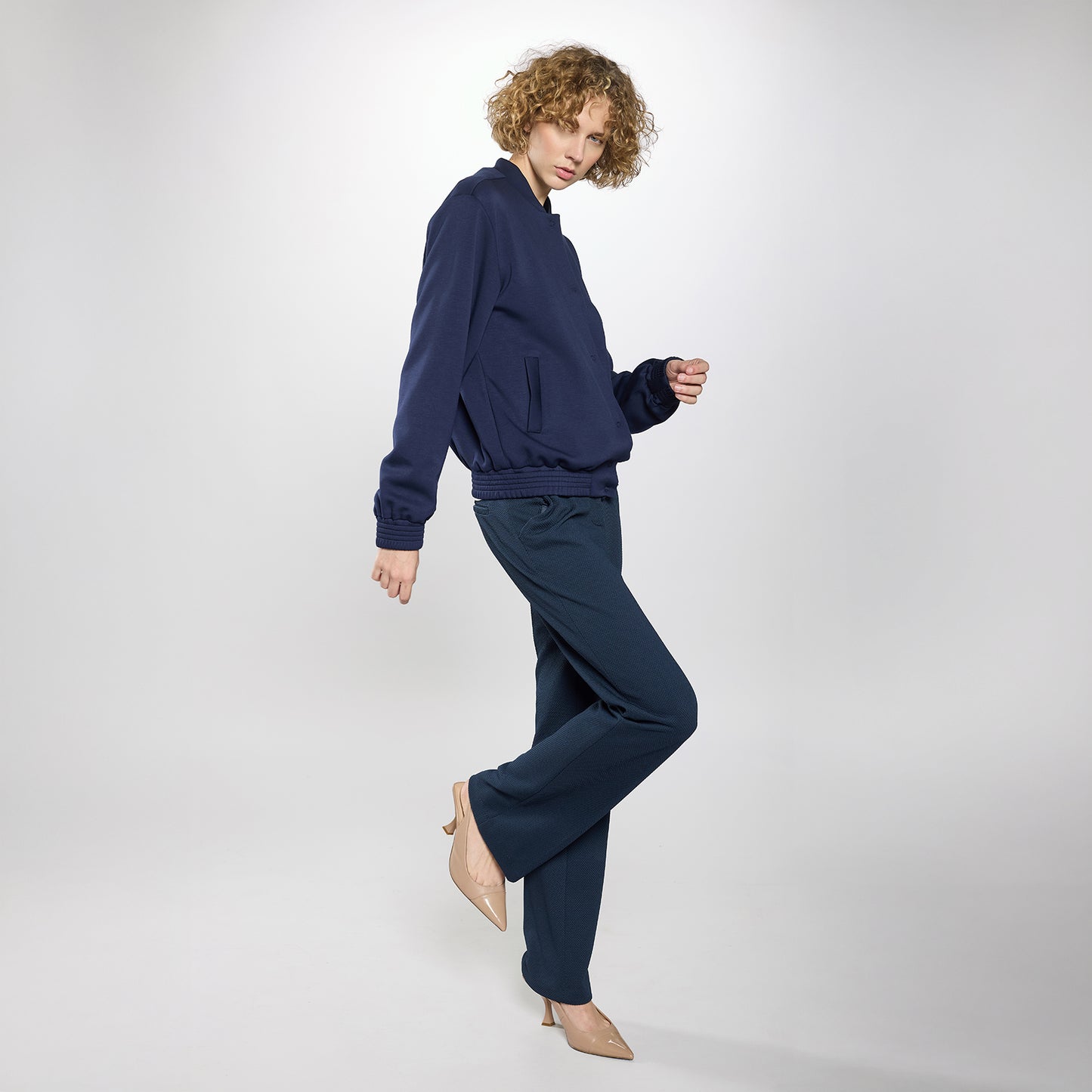 Chaqueta de cuello redondo, manga larga caída, puño de resorte fruncido y cierre frontal con cinco botones ocultos.