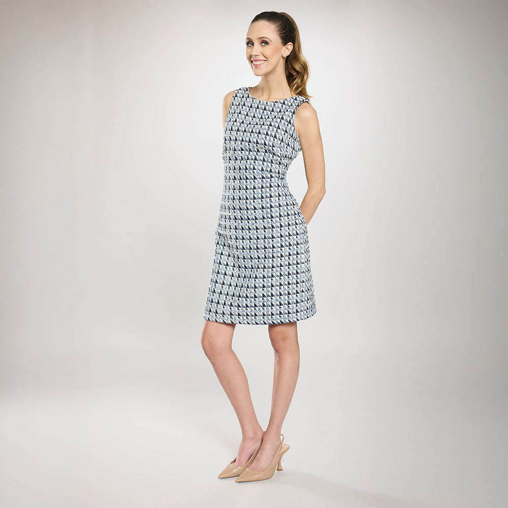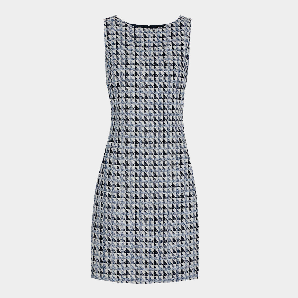 Vestido en tejido tipo tweed, silueta ajustada y cuello redondo. Modelo sin mangas con acabado estructurado y cierre de cremallera oculta en la parte posterior.